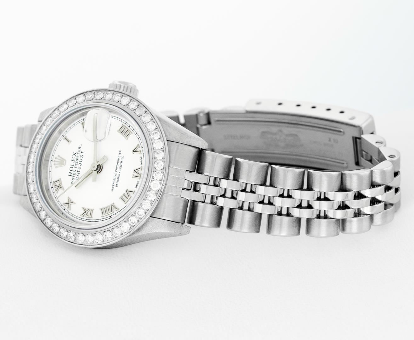 One Ladies Pre Owned Quickset Stainless Steel Rolex Datejust Polished Bright with Satin Finish, Serviced & Electronically Tested, Rolex Stainless Steel Case: 26mm. Rolex Stainless Steel Crown, Custom Bezel: New Stainless Steel Beadset Diamond Bezel, Stone Count: 32 Diamonds On Bezel, Diamond Color: G To H, Clarity: SI-VS. Custom Crystal: New Sapphire With Magnified Date Window. Custom Hands: New Hands. Rolex Movement: Quickset Automatic Winding Movement 2230. Rolex Dial: White Roman With Square Track. Date Window: 3 O'Clock Position Date Display, Model: Sapphire Quickset Datejust. Condition: G-6 Extra Fine. Rolex Bracelet: Stainless Steel Jubilee Band. Bright Polish & Satin Finish. 6.0 Inch Length, Adjustable. Standard Clasp, With Rolex Logo. This Watch Has Been Serviced Time Tested And Is In Excellent Condition It Is Free Of All Scratches And Dents.