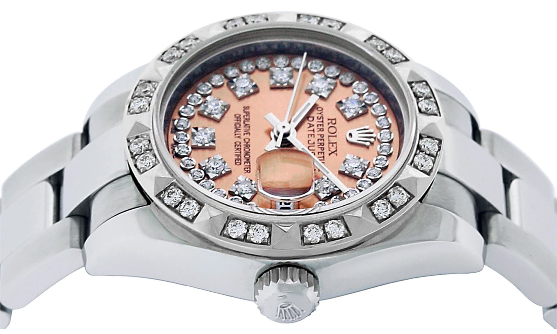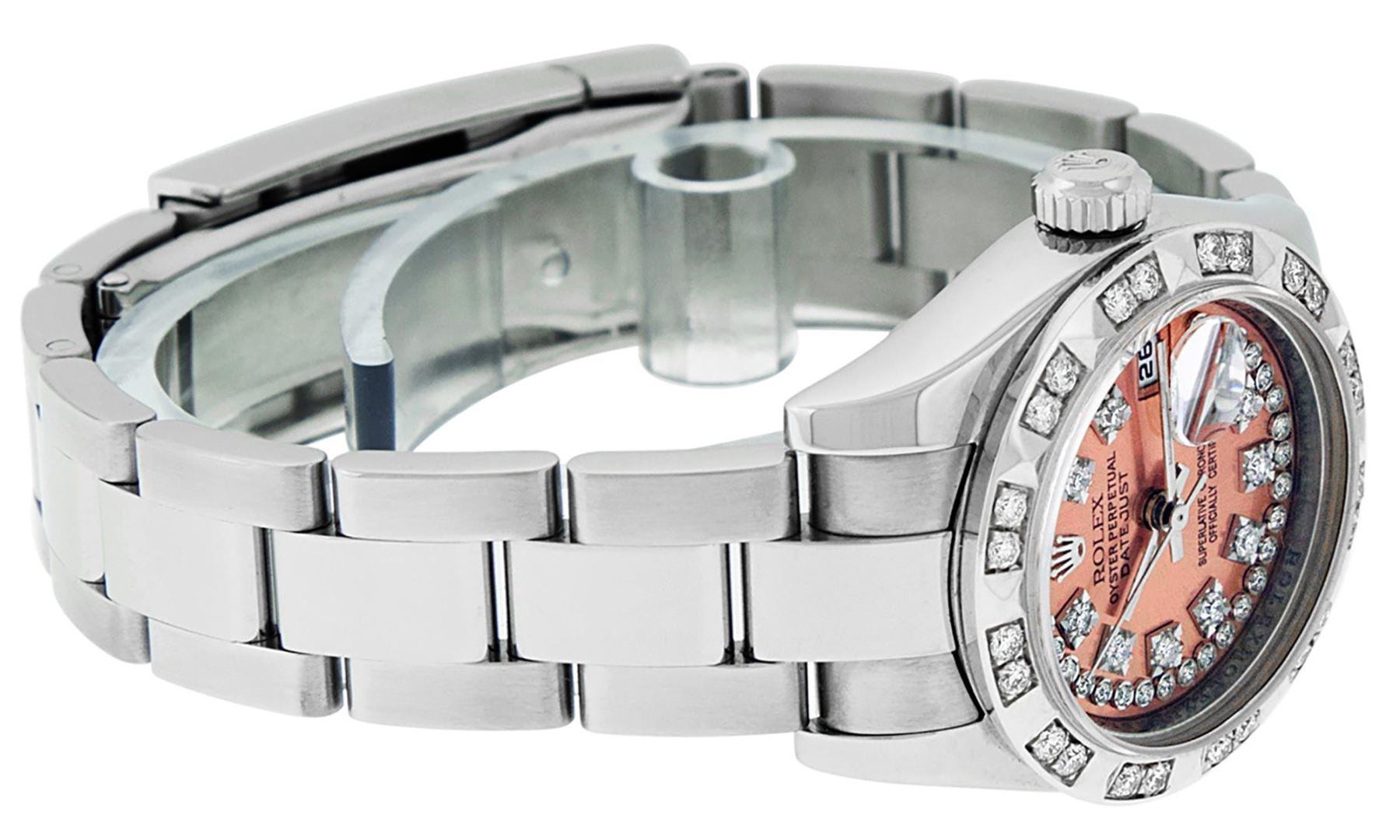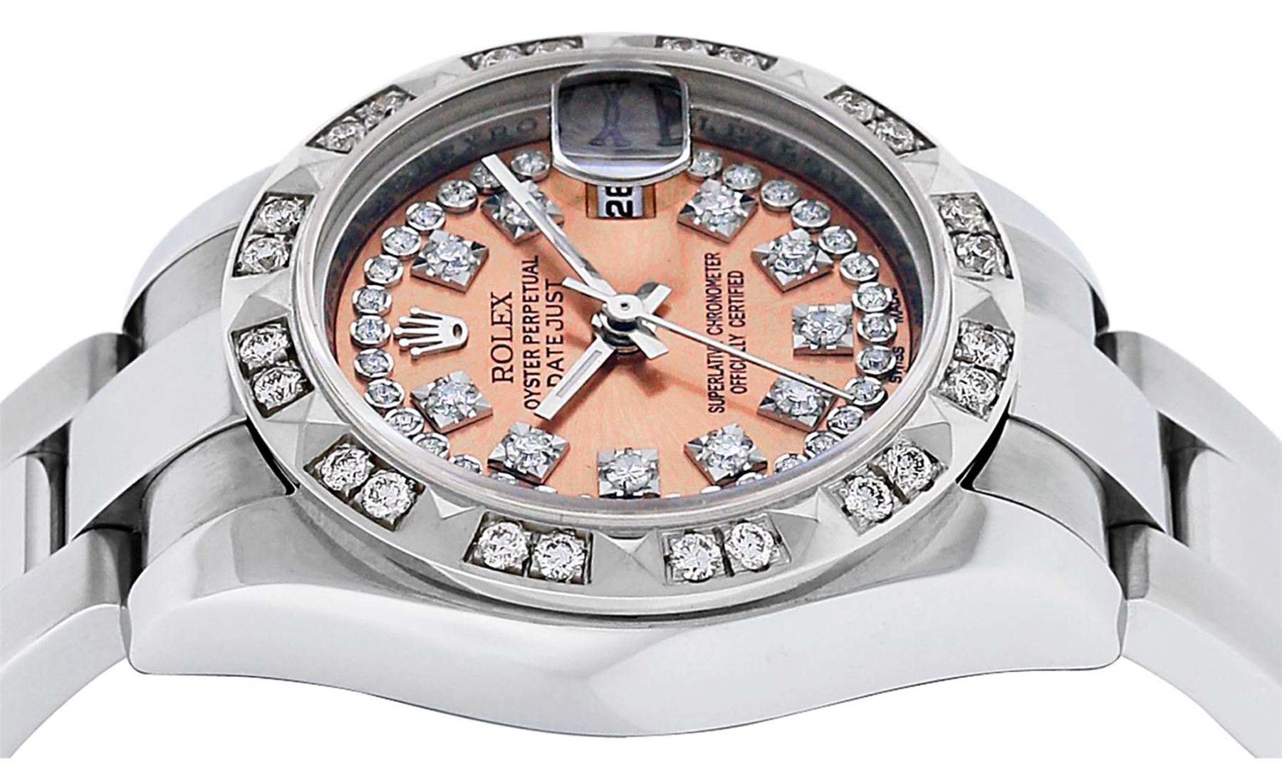 One Quickset Pre Owned Ladies Stainless Steel Rolex Datejust Polished Bright with Satin Finish, Serviced And Electronically Tested, Stainless Steel Case: 26mm, Stainless Steel Crown, Custom Bezel: New 18K White Gold Pyramid Diamond Bezel, Stone Count: 24 Diamonds On Bezel. Crystal: Sapphire With Date Window. Custom Hands: New Luminescent Hands. Rolex Movement: Automatic Winding Movement 2235. Custom Dial: Custom Salmon Dial With Added Diamond Hour Markers, 43 Diamonds On Dial. Date Window: 3 O'Clock Position Date Display, Model: Quickset Sapphire Datejust. Condition: G-6 Extra Fine. Rolex Bracelet: Stainless Steel Oyster Band. Bright Polish And Satin Finish. 6.0 Inch Length, Adjustable. Standard Clasp, With Rolex Logo. This Watch Has Been Serviced Time Tested And Is In Excellent Condition It Is Free Of All Scratches And Dents.