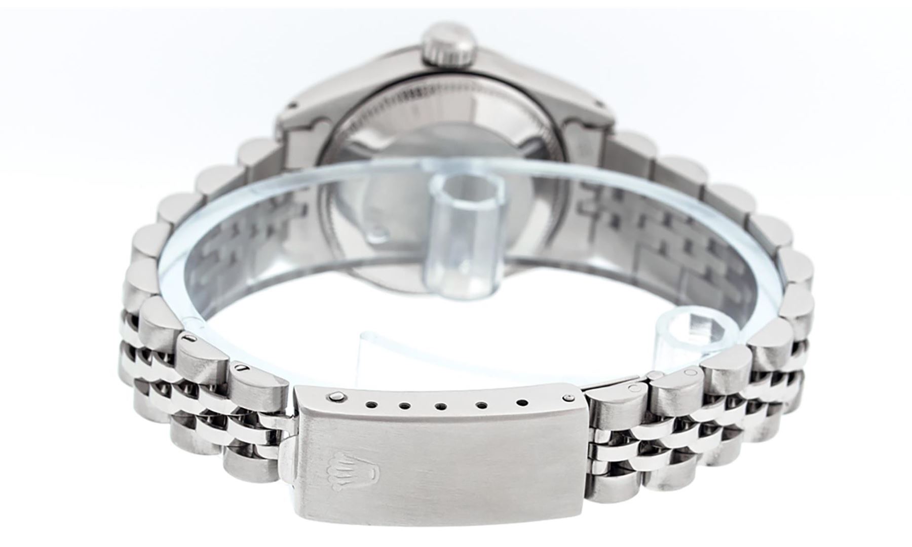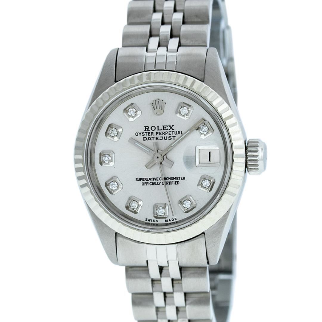 One Ladies Rolex Pre Owned Stainless Steel Wristwatch Polished Bright with Satin Finish, Serviced & Electronically Tested, Rolex Stainless Steel Case: 26mm, Rolex Stainless Steel Crown, Rolex Bezel: White Gold Bezel. Custom Crystal: New Acrylic With Magnified Date Window. Custom Hands: New Luminescent Hands. Rolex Movement: Automatic Winding Movement. Custom Dial: Custom Silver Dial With Added Diamonds, Diamond Count: 10 Diamonds In Dial. Date Window: 3 O'Clock Position Date Display. Condition: G-6 Extra Fine. Rolex Bracelet: Stainless Steel Jubilee Band. Bright Polish & Satin Finish. 6.0 Inch Length, Adjustable. Standard Clasp, With Rolex Logo. This Watch Has Been Serviced Time Tested And Is In Excellent Condition It Is Free Of All Scratches And Dents.