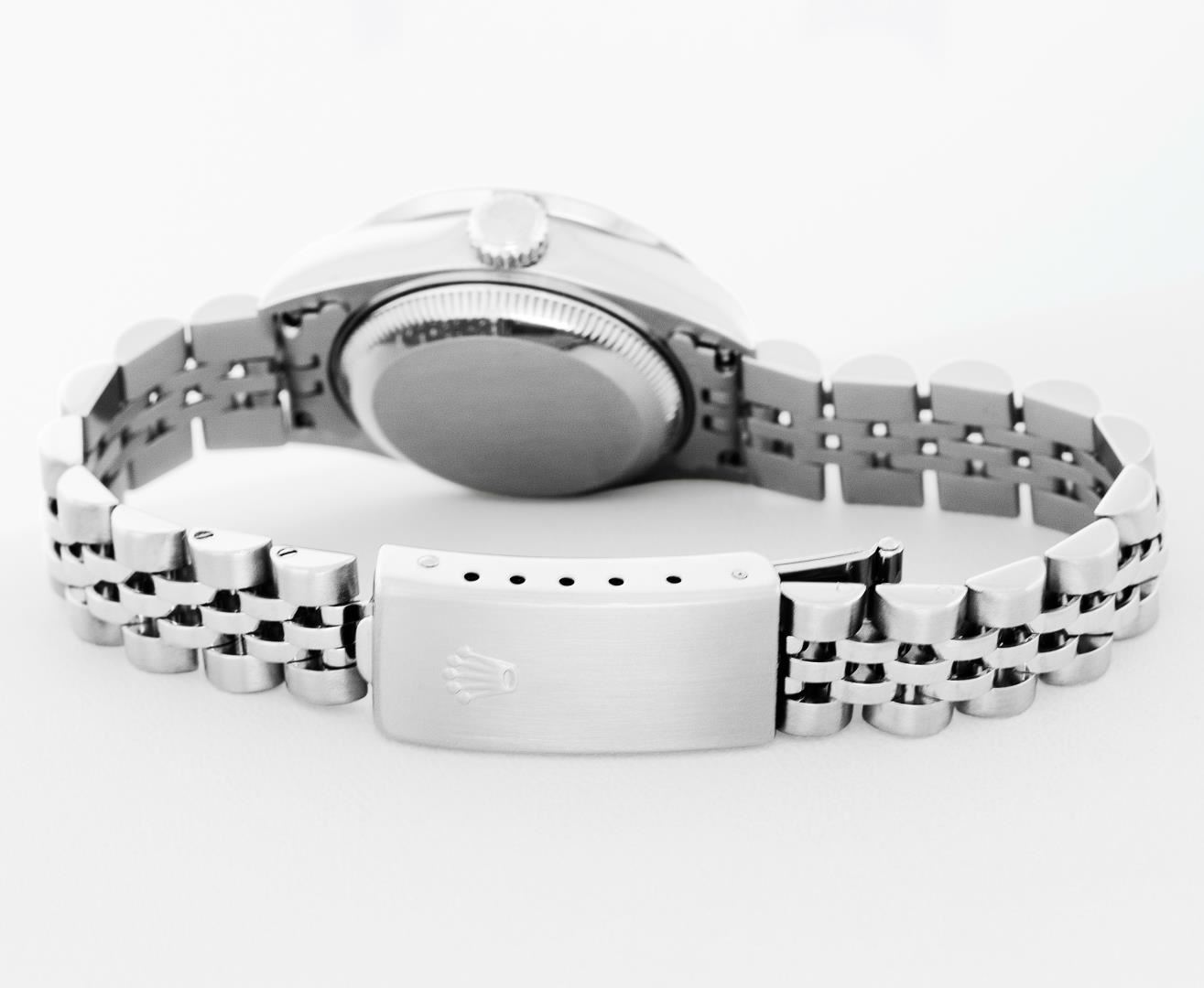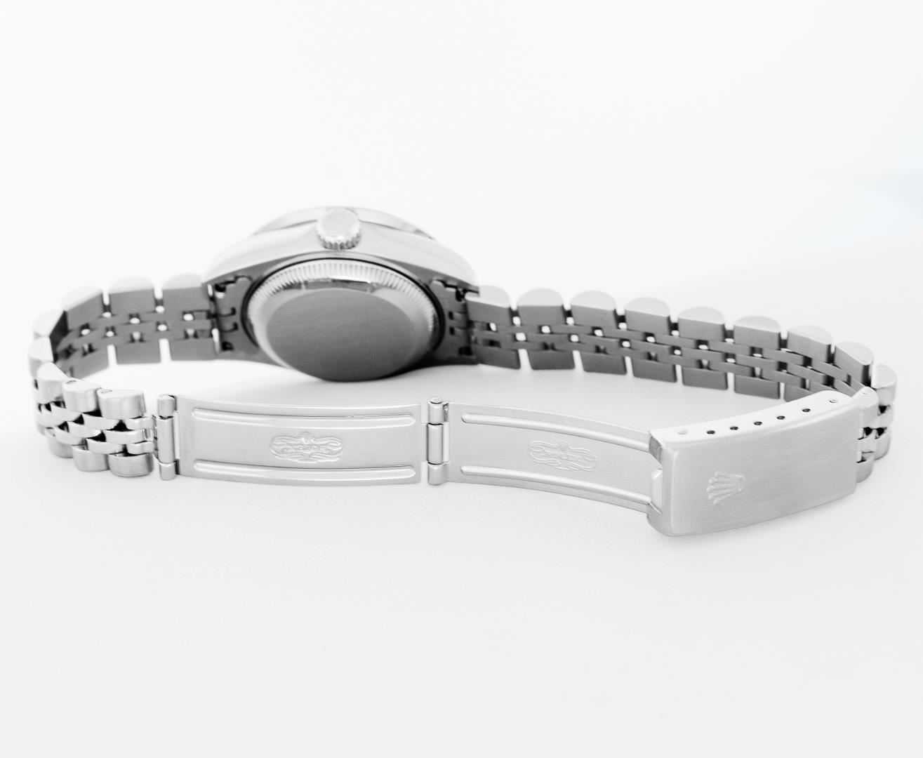 One Ladies Pre Owned Quickset Stainless Steel Rolex Datejust Polished Bright with Satin Finish, Serviced & Electronically Tested, Rolex Stainless Steel Case: 26mm. Rolex Stainless Steel Crown, Custom Bezel: New Stainless Steel Beadset Diamond Bezel, Stone Count: 32 Diamonds On Bezel, Diamond Color: G To H, Clarity: SI-VS. Custom Crystal: New Sapphire With Magnified Date Window. Custom Hands: New Hands. Rolex Movement: Quickset Automatic Winding Movement 2230. Rolex Dial: White Roman With Square Track. Date Window: 3 O'Clock Position Date Display, Model: Sapphire Quickset Datejust. Condition: G-6 Extra Fine. Rolex Bracelet: Stainless Steel Jubilee Band. Bright Polish & Satin Finish. 6.0 Inch Length, Adjustable. Standard Clasp, With Rolex Logo. This Watch Has Been Serviced Time Tested And Is In Excellent Condition It Is Free Of All Scratches And Dents.