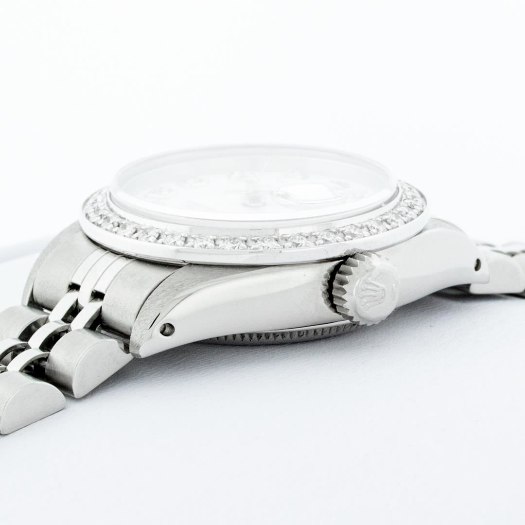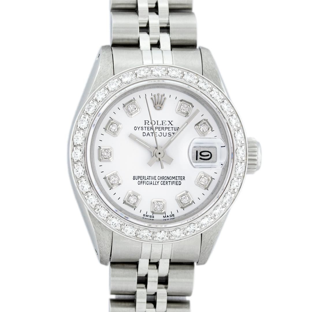 One Ladies Pre Owned Quickset Rolex Stainless Steel Wristwatch Polished Bright with Satin Finish, Serviced And Electronically Tested, Stainless Steel Case: 26mm, Stainless Steel Crown, Custom Bezel: New 18K White Gold Beadset Diamond Bezel, Diamond Count: 32 Diamonds. Custom Crystal: New Sapphire With Date Window. Custom Hands: New Luminescent Hands. Rolex Movement: Automatic Winding Movement 2135. Custom Dial: Custom White Dial With Added Diamonds, Diamond Count: 10 Diamonds On Dial. Date Window: 3 O'Clock Position Date Display, Model: Datejust. Condition: G-6 Extra Fine. Rolex Bracelet: Stainless Steel Jubilee Band. Bright Polish And Satin Finish. 6.0 Inch Length, Adjustable. Standard Clasp, With Rolex Logo. This Watch Has Been Serviced Time Tested And Is In Excellent Condition It Is Free Of All Scratches And Dents.
