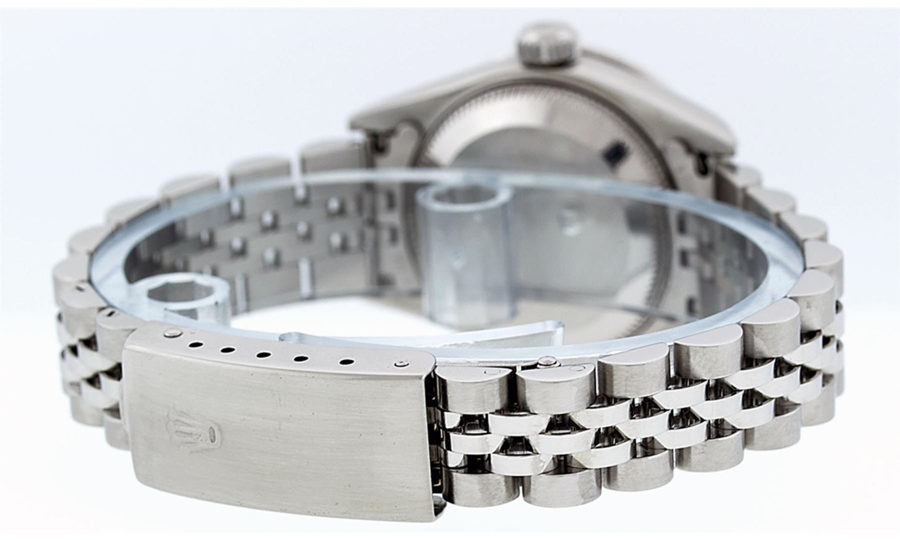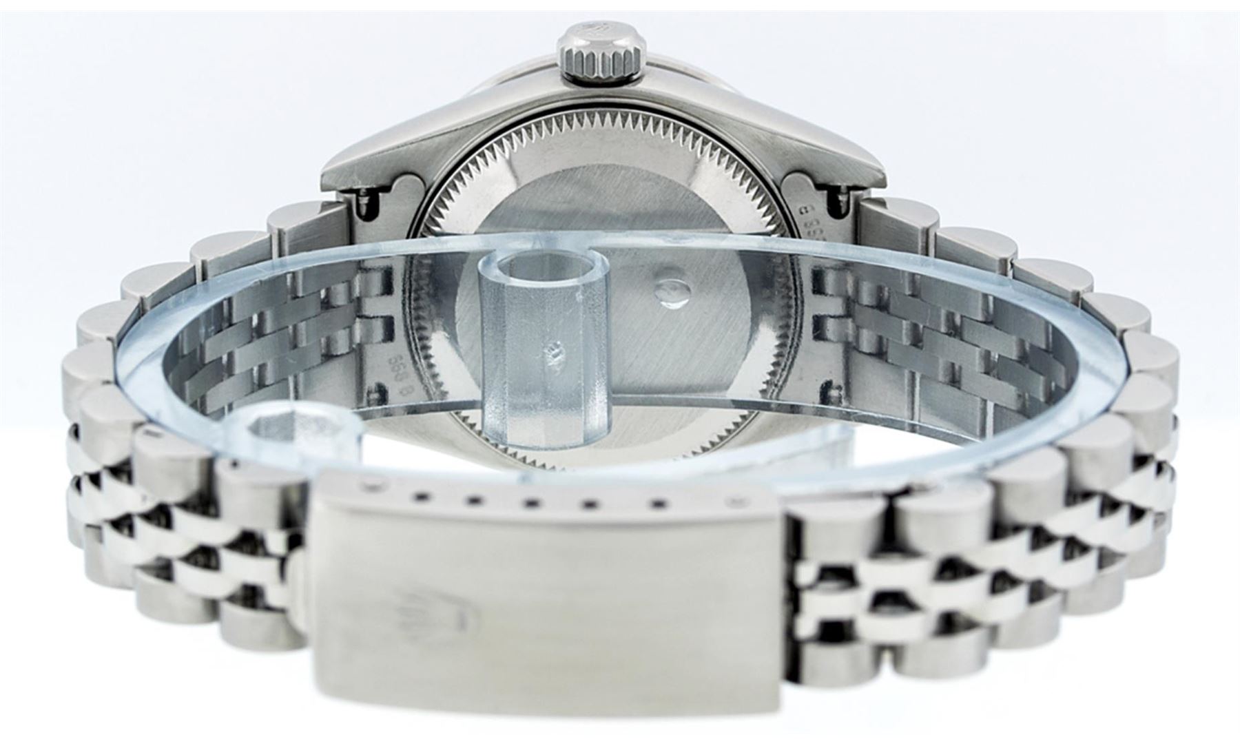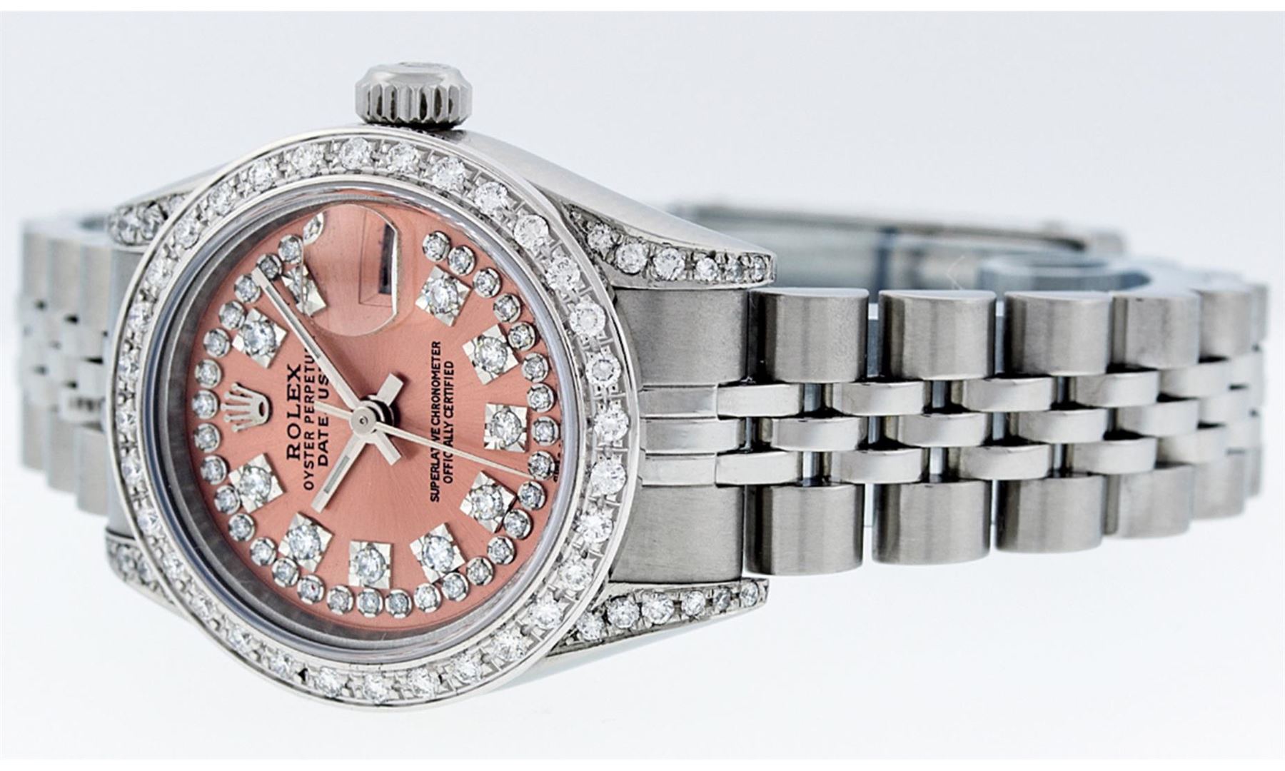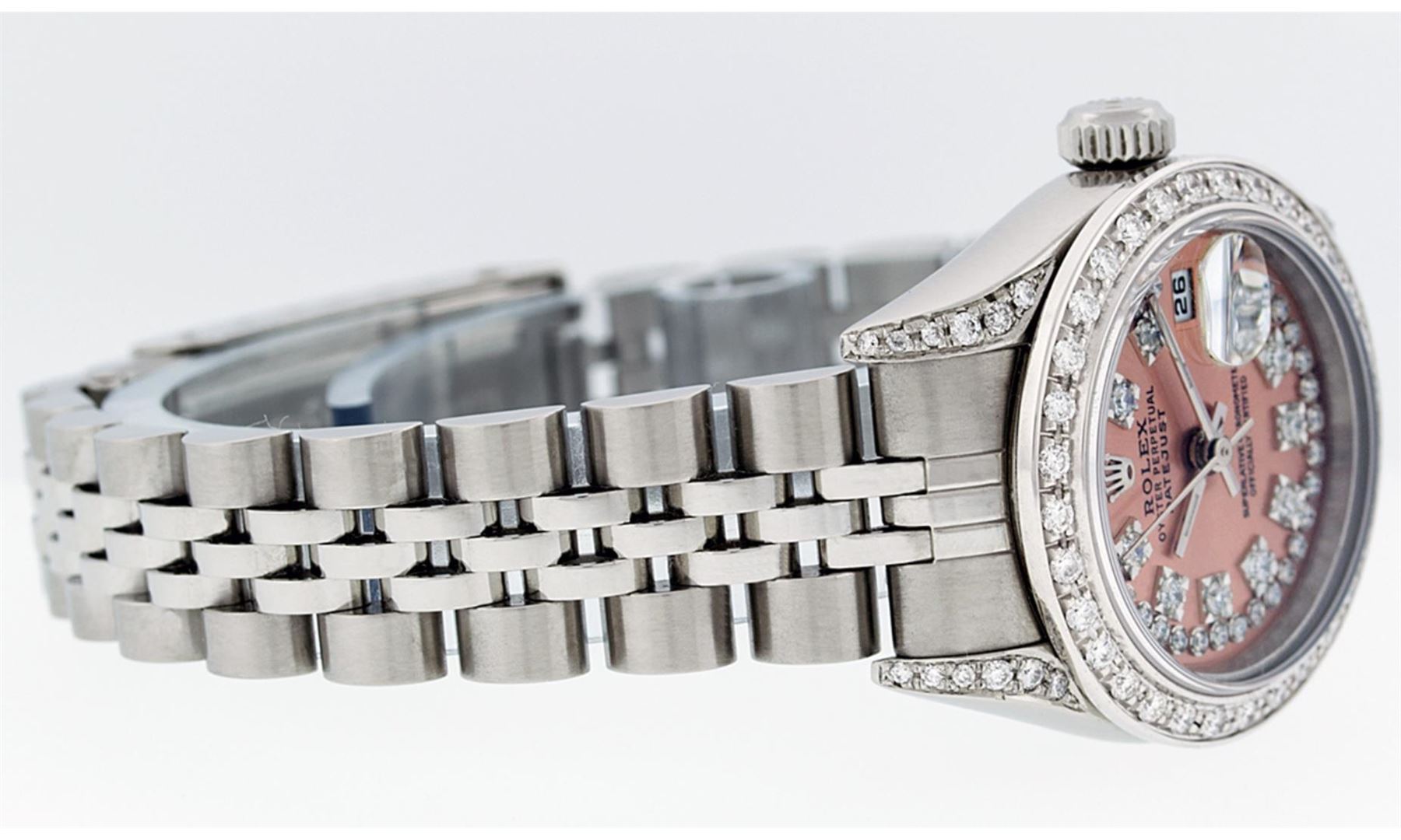 One Ladies Pre Owned Quickset Sapphire Stainless Steel Rolex Datejust Polished Bright with Satin Finish, Serviced And Electronically Tested, Stainless Steel Case: 26mm, Stainless Steel Crown, Custom Diamond Lugs: 24 Added Diamonds On Lugs. Custom Bezel: New 18K White Gold Beadset Diamond Bezel, Diamond Count: 32 Diamonds. Custom Crystal: New Sapphire With Date Window. Custom Hands: New Luminescent Hands. Rolex Movement: Automatic Quickset Winding Movement 2235. Custom Dial: Custom Salmon Dial With Added Diamonds, 43 Diamonds On Dial. Date Window: 3 O'Clock Position Date Display, Model: Quickset Datejust. Condition: G-6 Extra Fine. Rolex Bracelet: Stainless Steel Jubilee Band. Bright Polish And Satin Finish. 6.0 Inch Length, Adjustable. Standard Clasp, With Rolex Logo. This Watch Has Been Serviced Time Tested And Is In Excellent Condition It Is Free Of All Scratches And Dents.