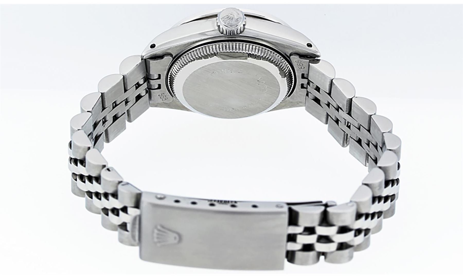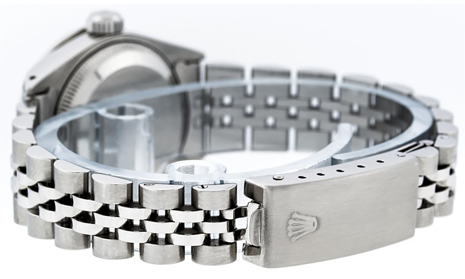 One Ladies Pre Owned Quickset Stainless Steel Rolex Datejust Polished Bright with Satin Finish, Serviced And Electronically Tested, Stainless Steel Case: 26mm, Stainless Steel Crown, Custom Diamond Lugs: 24 Diamonds Added On Lugs. Custom Bezel: New 18K White Gold Diamond Beadset Bezel, Diamond Count: 32 Diamonds. Custom Crystal: New Sapphire With Date Window. Custom Hands: New Luminescent Hands. Rolex Movement: Automatic Winding Movement 2135. Custom Dial: Custom White Dial With Added Diamonds, 10 Diamonds On Dial. Date Window: 3 O'Clock Position Date Display, Model: Quickset Datejust. Condition: G-6 Extra Fine. Rolex Bracelet: Stainless Steel Jubilee Band. Bright Polish And Satin Finish. 6.0 Inch Length, Adjustable. Standard Clasp, With Rolex Logo. This Watch Has Been Serviced Time Tested And Is In Excellent Condition It Is Free Of All Scratches And Dents.
