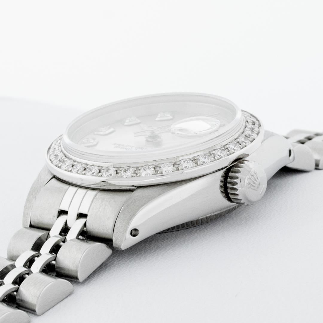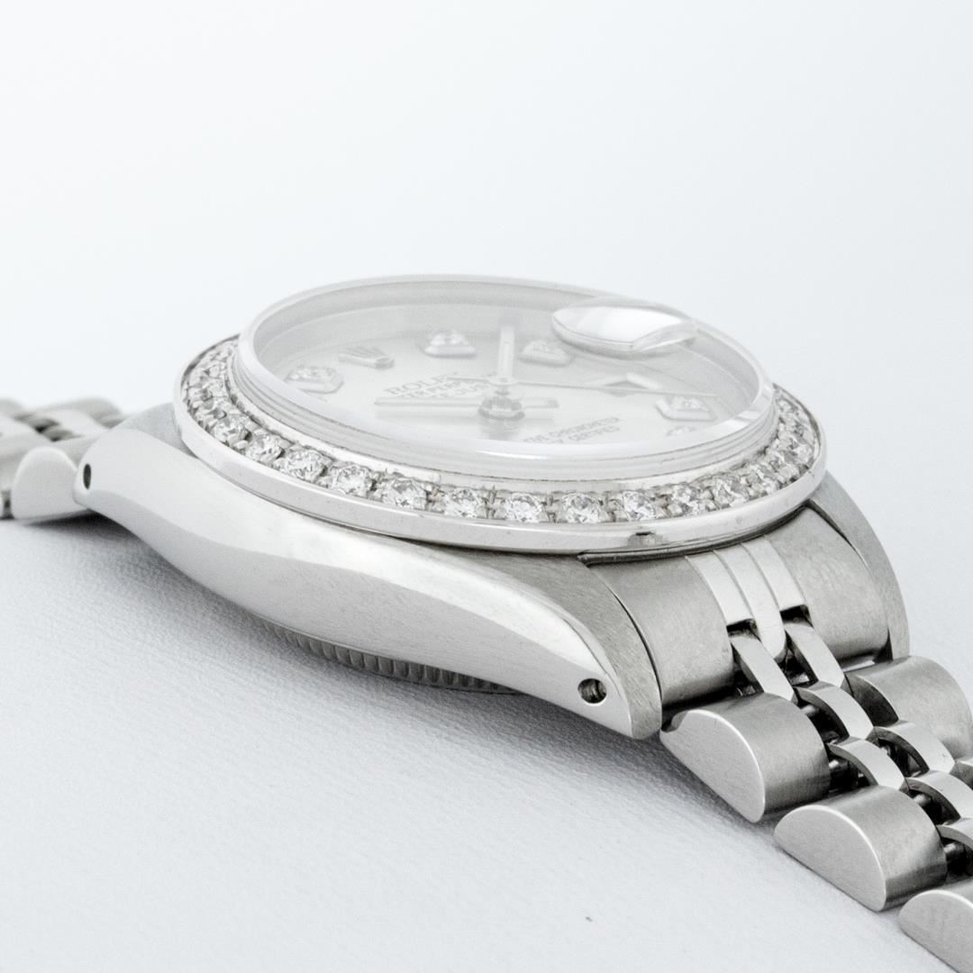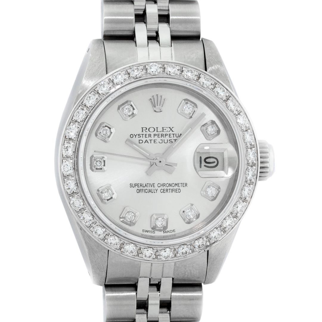 One Ladies Rolex Pre Owned Quickset Stainless Steel Rolex Datejust Wristwatch Polished Bright with Satin Finish, Serviced And Electronically Tested, Stainless Steel Case: 26mm, Stainless Steel Crown, Custom Bezel: New 18K White Gold Beadset Diamond Bezel, Diamond Count: 32 Diamonds. Custom Crystal: New Sapphire With Date Window. Custom Hands: New Luminescent Hands. Rolex Movement: Automatic Winding Movement 2135. Custom Dial: Custom Silver Dial With Added Diamond Hour Markers, Diamond Count: 10 Diamonds On Dial. Date Window: 3 O'Clock Position Date Display. Model: Quickset Datejust. Condition: G-6 Extra Fine. Rolex Bracelet: Stainless Steel Jubilee Band. Bright Polish And Satin Finish. 6.0 Inch Length, Adjustable. Standard Clasp, With Rolex Logo. This Watch Has Been Serviced Time Tested And Is In Excellent Condition It Is Free Of All Scratches And Dents.