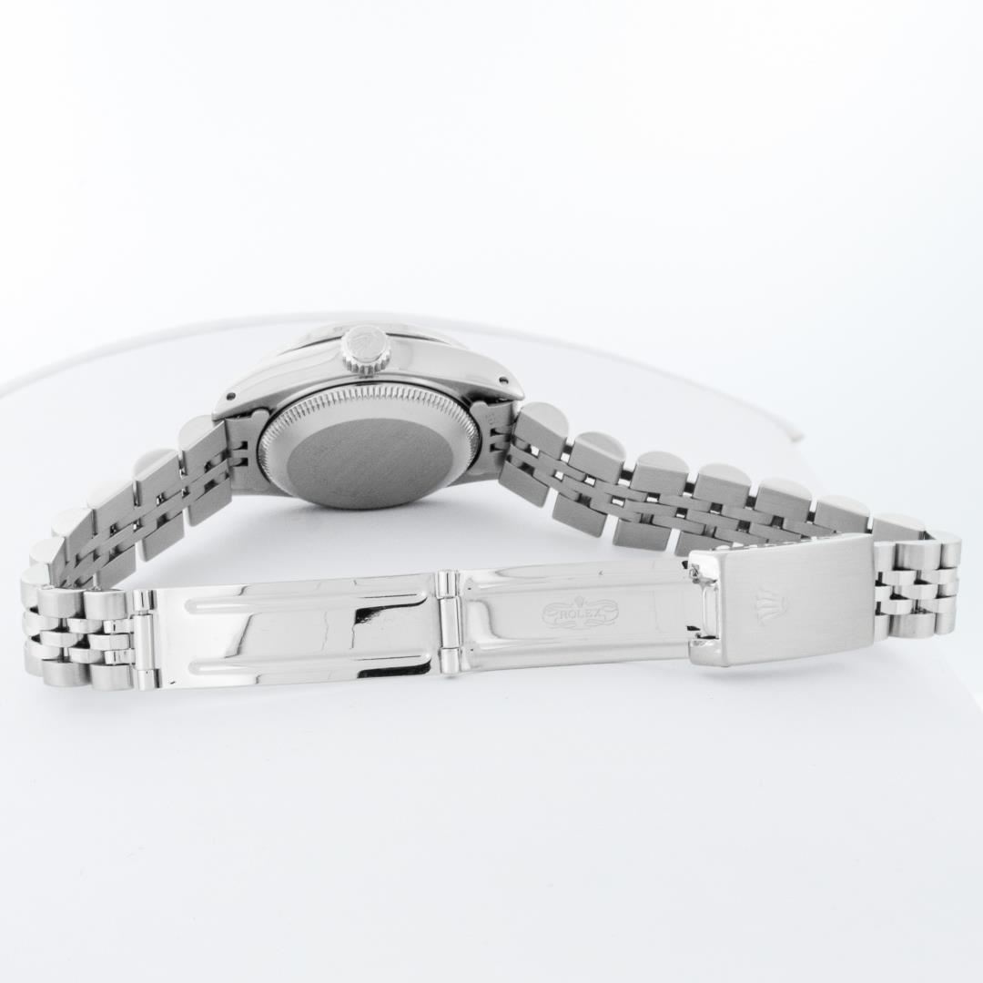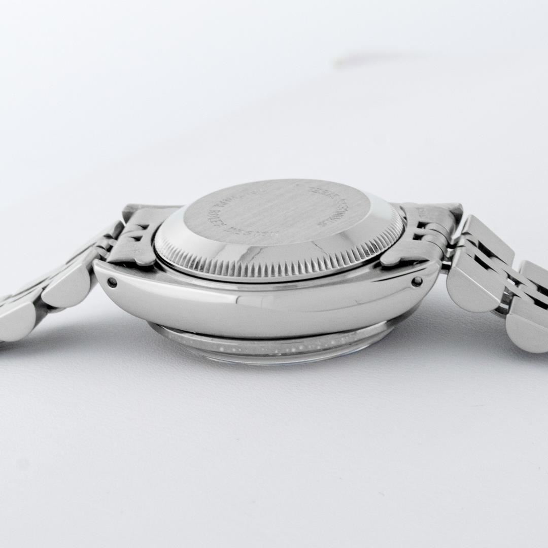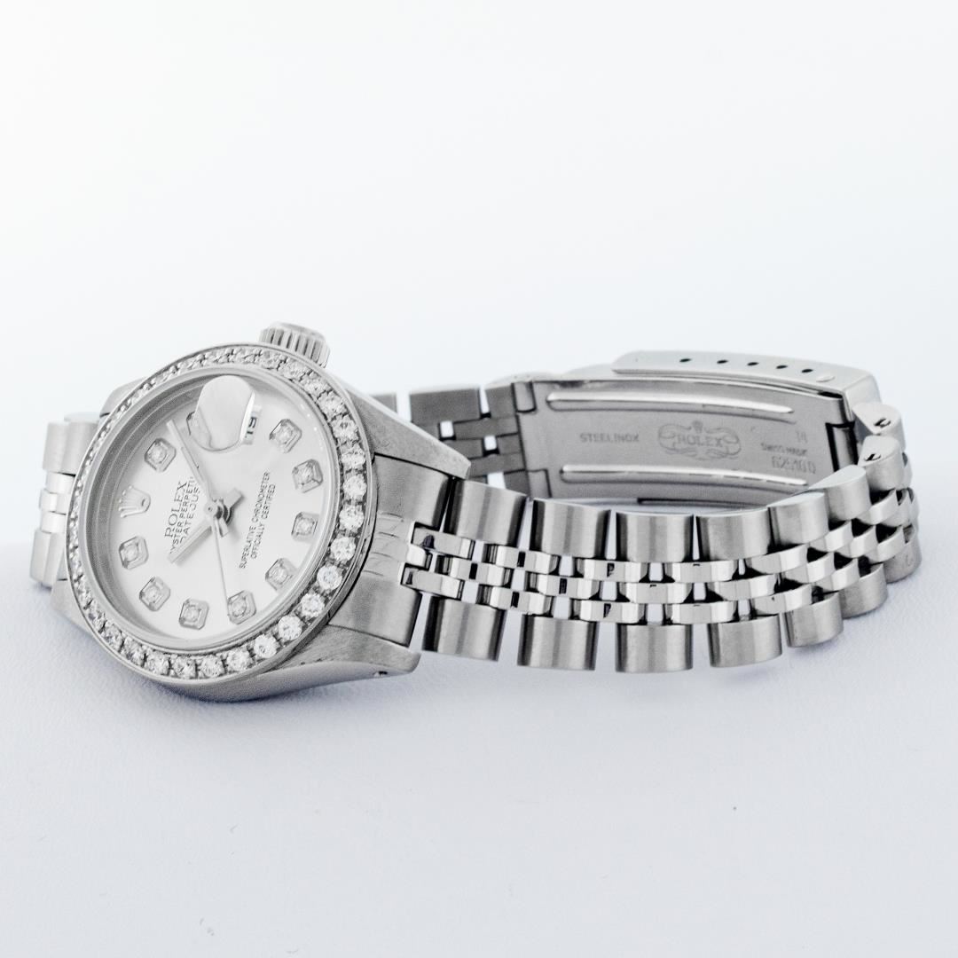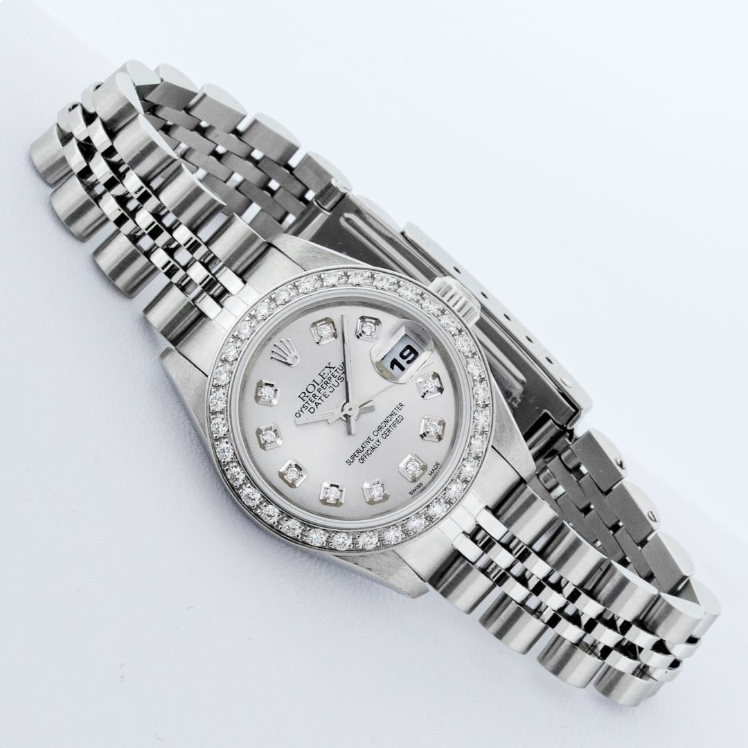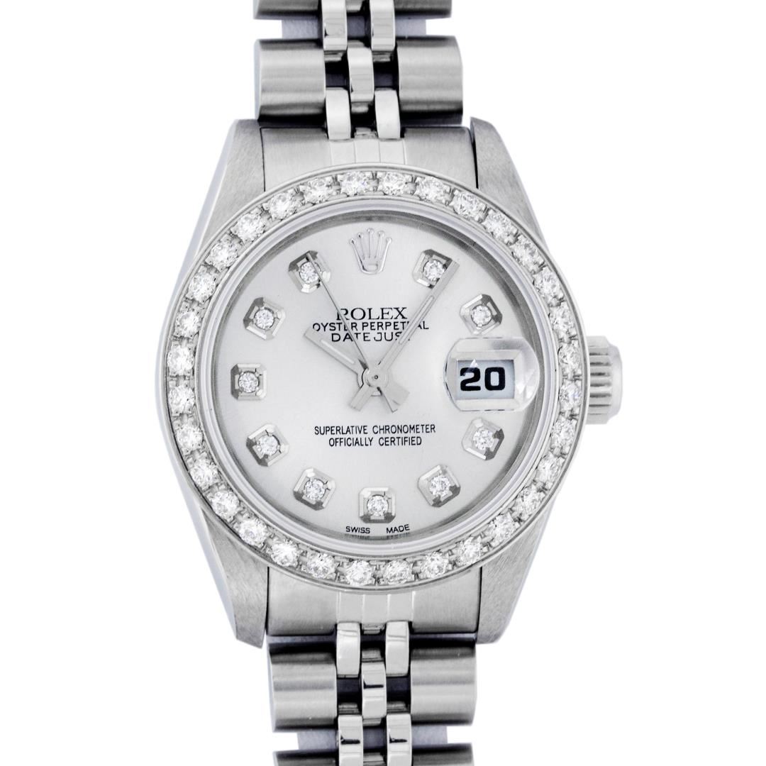 One Ladies Rolex Pre Owned Quickset Stainless Steel Rolex Datejust Wristwatch Polished Bright with Satin Finish, Serviced And Electronically Tested, Stainless Steel Case: 26mm, Stainless Steel Crown, Custom Bezel: New 18K White Gold Beadset Diamond Bezel, Diamond Count: 32 Diamonds. Custom Crystal: New Sapphire With Date Window. Custom Hands: New Luminescent Hands. Rolex Movement: Automatic Winding Movement 2135. Custom Dial: Custom Silver Dial With Added Diamond Hour Markers, Diamond Count: 10 Diamonds On Dial. Date Window: 3 O'Clock Position Date Display. Model: Quickset Datejust. Condition: G-6 Extra Fine. Rolex Bracelet: Stainless Steel Jubilee Band. Bright Polish And Satin Finish. 6.0 Inch Length, Adjustable. Standard Clasp, With Rolex Logo. This Watch Has Been Serviced Time Tested And Is In Excellent Condition It Is Free Of All Scratches And Dents.