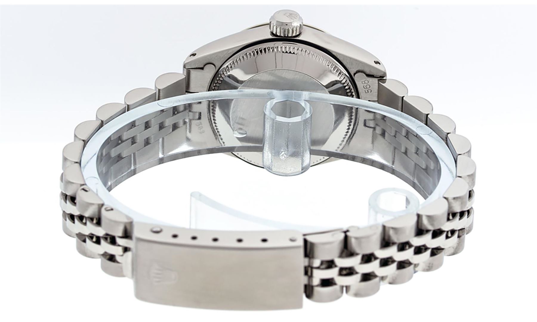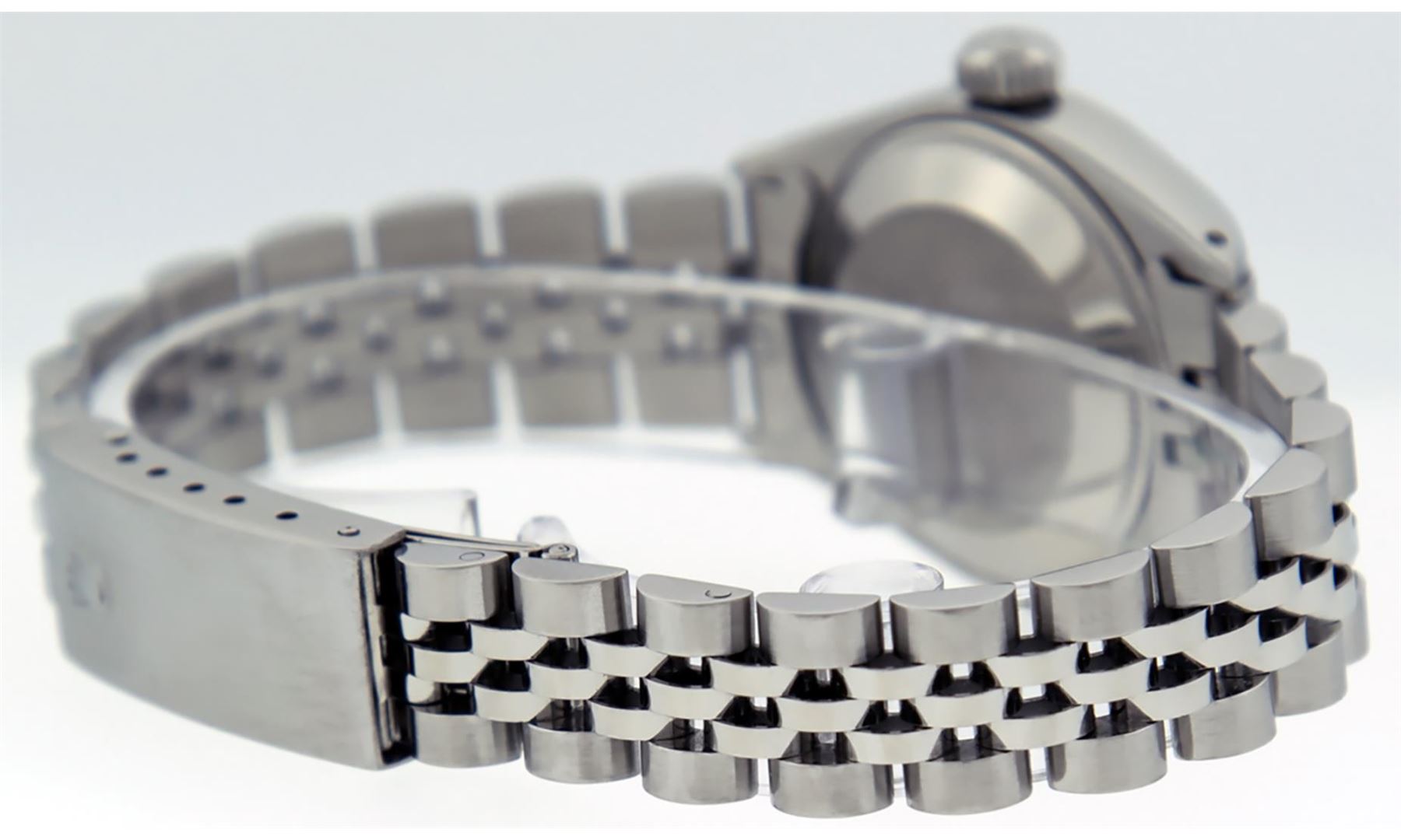 One Ladies Pre Owned Quickset Stainless Steel Rolex Datejust Polished Bright with Satin Finish, Serviced And Electronically Tested, Stainless Steel Case: 26mm, Stainless Steel Crown, Rolex Bezel: 18K White Gold Fluted Bezel. Custom Crystal: New Sapphire With Date Window. Custom Hands: New Luminescent Hands. Rolex Movement: Automatic Winding Movement 2135. Dial: Custom Black Dial With Added Diamonds, Diamond Count: 10 Diamonds On Dial. Date Window: 3 O'Clock Position Date Display, Model: Datejust. Condition: G-6 Extra Fine. Rolex Bracelet: Stainless Steel Jubilee Band. Bright Polish And Satin Finish. 6.0 Inch Length, Adjustable. Standard Clasp, With Rolex Logo. This Watch Has Been Serviced Time Tested And Is In Excellent Condition It Is Free Of All Scratches And Dents.