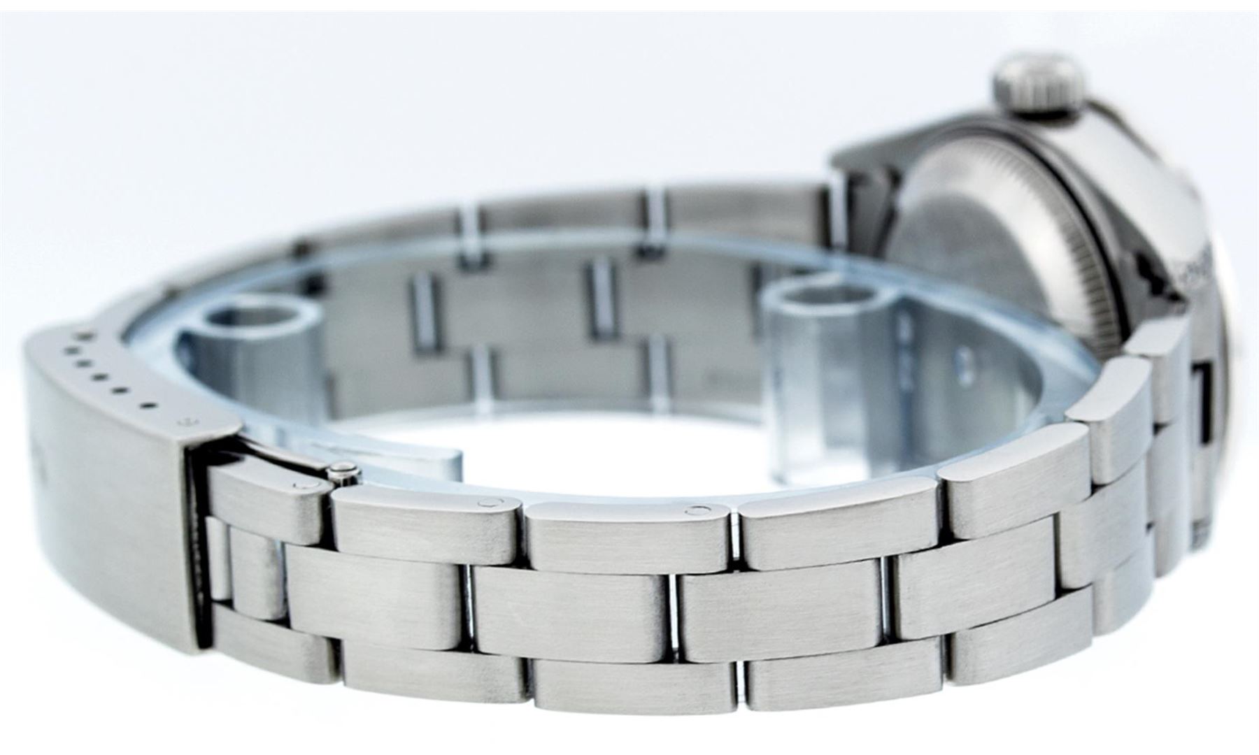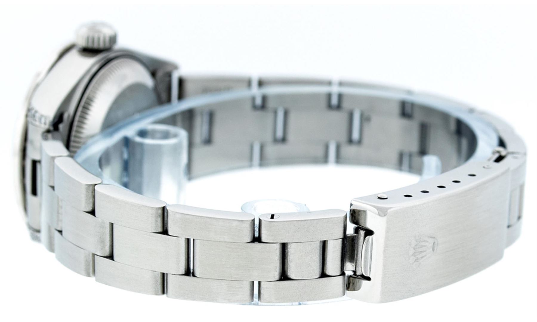 One Ladies Pre Owned Quickset Sapphire Stainless Steel Rolex Datejust Polished Bright with Satin Finish, Serviced And Electronically Tested, Stainless Steel Case: 26mm, Stainless Steel Crown, Custom Diamond Lugs: 24 Added Diamonds On Lugs. Custom Bezel: New 18K White Gold Beadset Diamond Bezel, Diamond Count: 32 Diamonds. Custom Crystal: New Sapphire With Date Window. Custom Hands: New Luminescent Hands. Rolex Movement: Automatic Quickset Winding Movement 2235. Custom Dial: Custom Black Dial With Added Diamonds, 43 Diamonds On Dial. Date Window: 3 O'Clock Position Date Display, Model: Quickset Datejust. Condition: G-6 Extra Fine. Rolex Bracelet: Stainless Steel Oyster Band. Bright Polish And Satin Finish. 6.0 Inch Length, Adjustable. Standard Clasp, With Rolex Logo. This Watch Has Been Serviced Time Tested And Is In Excellent Condition It Is Free Of All Scratches And Dents.