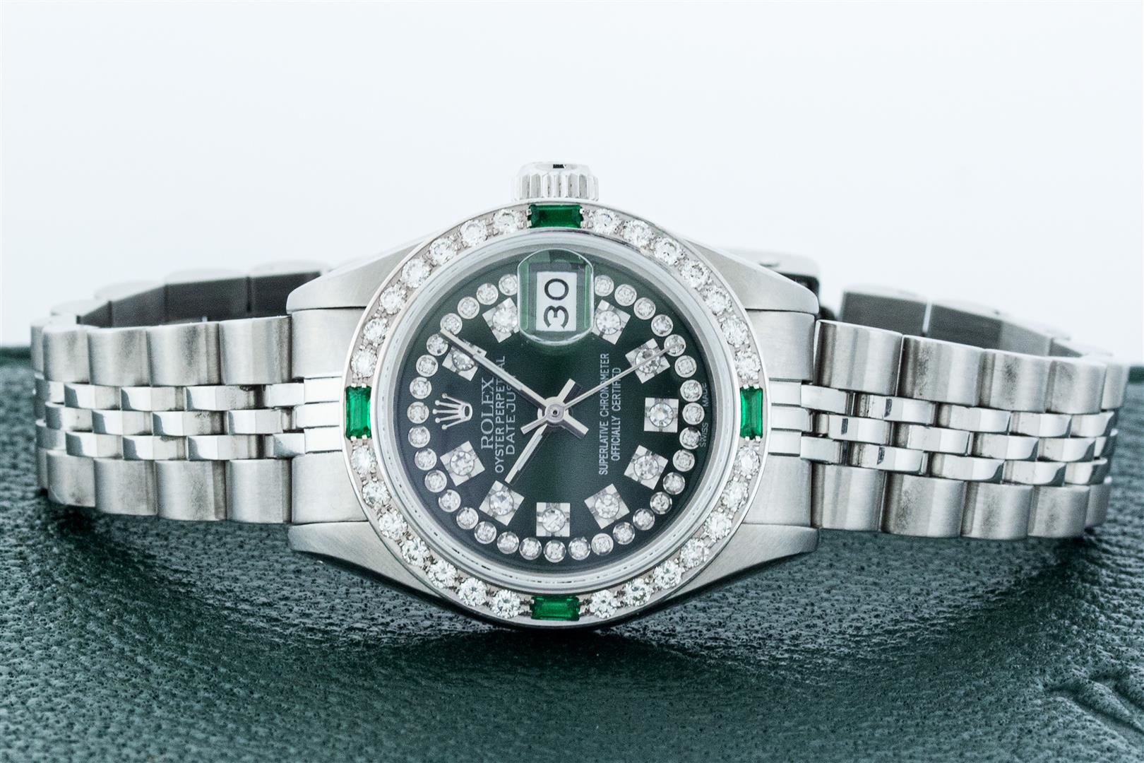 One Ladies Stainless Steel Rolex Datejust Polished Bright with Satin Finish, Serviced & Electronically Tested, Stainless Steel Case: 26mm, Stainless Steel Crown. Custom Bezel: New 18K White Gold Beadset & Emerald Diamond Bezel, Diamond Count: 28 Diamonds + 4 Emeralds. Total Weight .70 Carat, Clarity: SI-VS, Color: G to H. Custom Crystal: New Scratch Resistant Synthetic Sapphire Cyclops Lens. Custom Hands: New Luminescent Hands. Movement: Automatic Winding Movement Caliber 2030. Custom Dial: Refinished Green String Single Cut Diamond Dial, Stone Count: 43 Diamonds On Dial, G To H In Color, Clarity: SI-VS. Date Window: 3 O'Clock Position Date Display, Model: Datejust. Condition: G-6 Extra Fine. Bracelet: Stainless Steel Jubilee Band. Bright Polish & Satin Finish. 6.0 Inch Length, Adjustable. Standard Clasp, With Rolex Logo. This Watch Has Been Serviced Time Tested And Is In Excellent Condition It Is Free Of All Scratches And Dents. This Watch Comes With A Rolex Box.