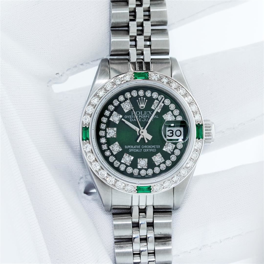 One Ladies Stainless Steel Rolex Datejust Polished Bright with Satin Finish, Serviced & Electronically Tested, Stainless Steel Case: 26mm, Stainless Steel Crown. Custom Bezel: New 18K White Gold Beadset & Emerald Diamond Bezel, Diamond Count: 28 Diamonds + 4 Emeralds. Total Weight .70 Carat, Clarity: SI-VS, Color: G to H. Custom Crystal: New Scratch Resistant Synthetic Sapphire Cyclops Lens. Custom Hands: New Luminescent Hands. Movement: Automatic Winding Movement Caliber 2030. Custom Dial: Refinished Green String Single Cut Diamond Dial, Stone Count: 43 Diamonds On Dial, G To H In Color, Clarity: SI-VS. Date Window: 3 O'Clock Position Date Display, Model: Datejust. Condition: G-6 Extra Fine. Bracelet: Stainless Steel Jubilee Band. Bright Polish & Satin Finish. 6.0 Inch Length, Adjustable. Standard Clasp, With Rolex Logo. This Watch Has Been Serviced Time Tested And Is In Excellent Condition It Is Free Of All Scratches And Dents. This Watch Comes With A Rolex Box.