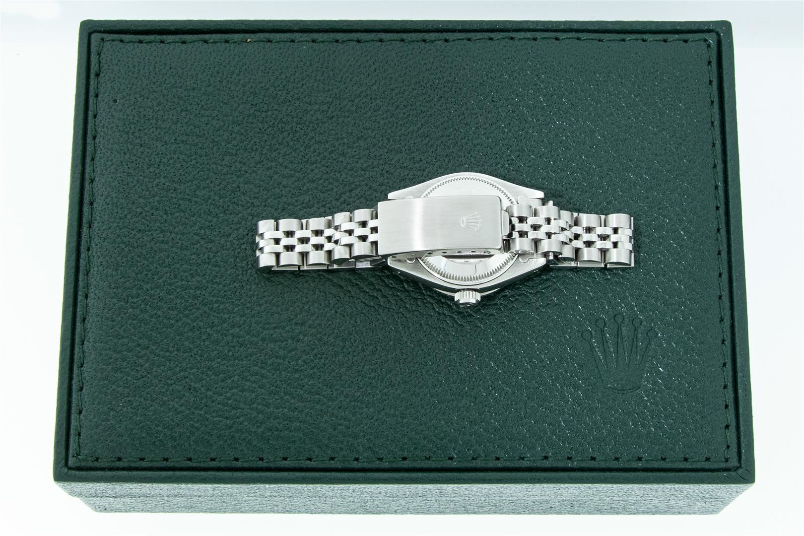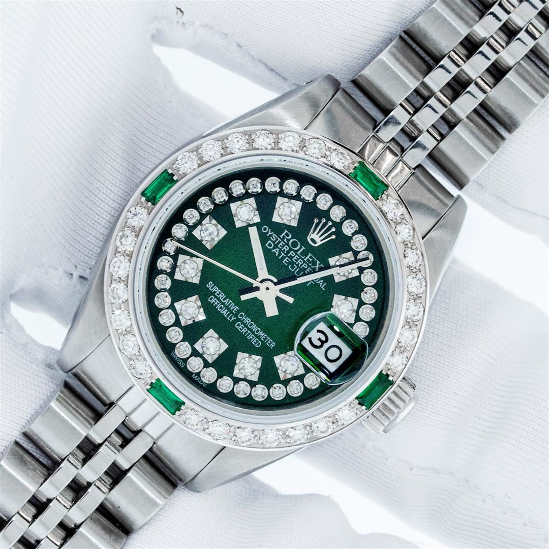 One Ladies Stainless Steel Rolex Datejust Polished Bright with Satin Finish, Serviced & Electronically Tested, Stainless Steel Case: 26mm, Stainless Steel Crown. Custom Bezel: New 18K White Gold Beadset & Emerald Diamond Bezel, Diamond Count: 28 Diamonds + 4 Emeralds. Total Weight .70 Carat, Clarity: SI-VS, Color: G to H. Custom Crystal: New Scratch Resistant Synthetic Sapphire Cyclops Lens. Custom Hands: New Luminescent Hands. Movement: Automatic Winding Movement Caliber 2030. Custom Dial: Refinished Green String Single Cut Diamond Dial, Stone Count: 43 Diamonds On Dial, G To H In Color, Clarity: SI-VS. Date Window: 3 O'Clock Position Date Display, Model: Datejust. Condition: G-6 Extra Fine. Bracelet: Stainless Steel Jubilee Band. Bright Polish & Satin Finish. 6.0 Inch Length, Adjustable. Standard Clasp, With Rolex Logo. This Watch Has Been Serviced Time Tested And Is In Excellent Condition It Is Free Of All Scratches And Dents. This Watch Comes With A Rolex Box.