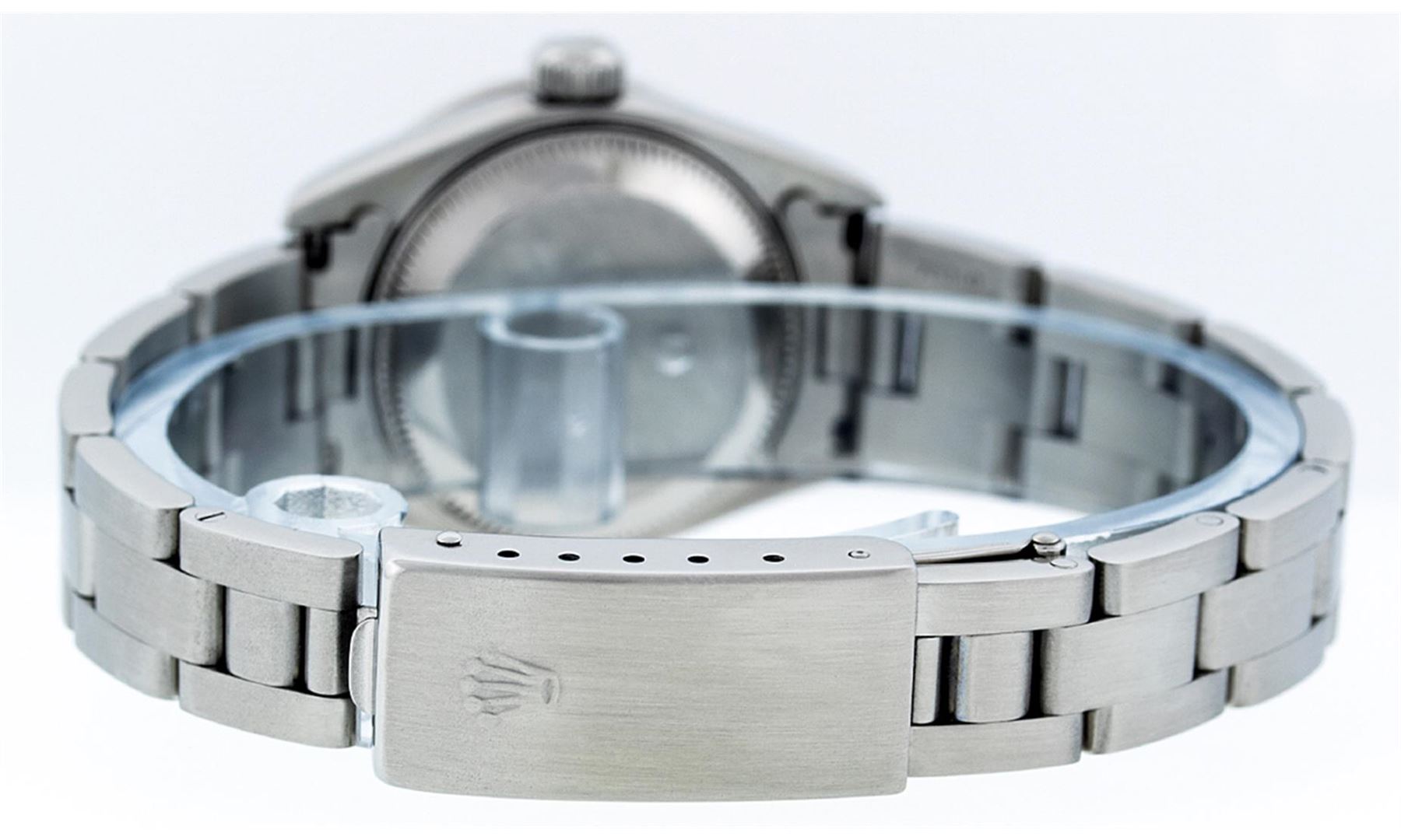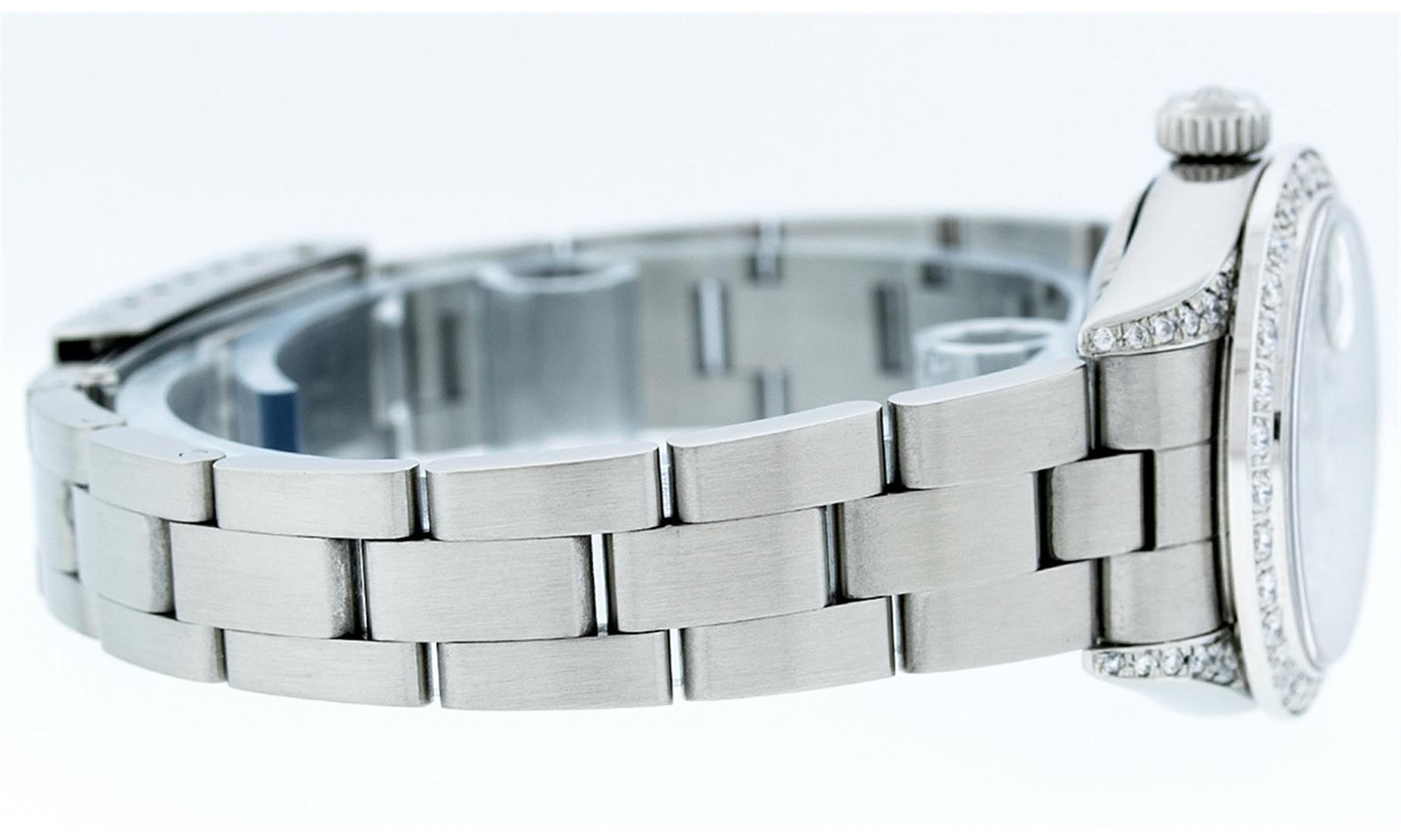 One Quickset Ladies Stainless Steel Rolex Datejust Polished Bright with Satin Finish, Serviced & Electronically Tested, Stainless Steel Case: 26mm, Stainless Steel Crown, Custom Diamond Lugs: 24 Diamonds On Lugs, Clarity: SI-VS, Color: G to H. Custom Bezel: New 18K White Gold Beadset Diamond Bezel, Stone Count: 32 Diamonds On Bezel, Total Bezel Weight .70 Carat, Clarity: SI-VS, Color: G to H. Custom Crystal: New Scratch Resistant Synthetic Sapphire Cyclops Lens. Custom Hands: New Luminescent Hands. Movement: Automatic Winding Movement Caliber 2235. Custom Dial: Refinished Single Cut Black String Diamond Dial, 43 Diamonds in Dial G To H In Color, Clarity: VS. Date Window: 3 O'Clock Position Date Display, Model: Quickset Datejust. Condition: G-6 Extra Fine. Bracelet: Stainless Steel Oyster Band. Bright Polish & Satin Finish. 6.0 Inch Length, Adjustable. Standard Clasp, With Rolex Logo. This Watch Has Been Serviced Time Tested And Is In Excellent Condition It Is Free Of All Scratches And Dents.