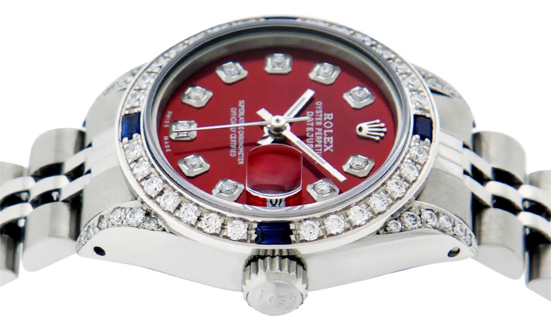 One Ladies Stainless Steel Rolex Datejust Polished Bright with Satin Finish, Serviced & Electronically Tested, Stainless Steel Case: 26mm, Stainless Steel Crown, Diamond Lugs: 24 Diamonds On Lugs, Clarity: SI-VS, Color: G to H. Custom Bezel: New 18K White Gold Diamond & Sapphire Beadset Bezel, Diamond Count: 28 Diamonds + 4 Sapphires, Total Weight .70 Carat, Clarity: SI-VS, Color: G to H. Custom Crystal: New Synthetic Sapphire Cyclops Lens. Custom Hands: New Luminescent Hands. Movement: Automatic Winding Movement Caliber 2030. Custom Dial: Refinished Red Diamond Dial, 10 Diamonds in Dial, G To H In Color, Clarity: SI-VS. Date Window: 3 O'clock Position Date Display, Model: Datejust Condition: G-6 Extra Fine. Bracelet: Stainless Steel Jubilee. Bright Polish & Satin Finish. 6.0 Inch Length, Adjustable. Standard Clasp, With Rolex Logo. This Watch Has Been Serviced Time Tested And Is In Excellent Condition It Is Free Of All Scratches And Dents.