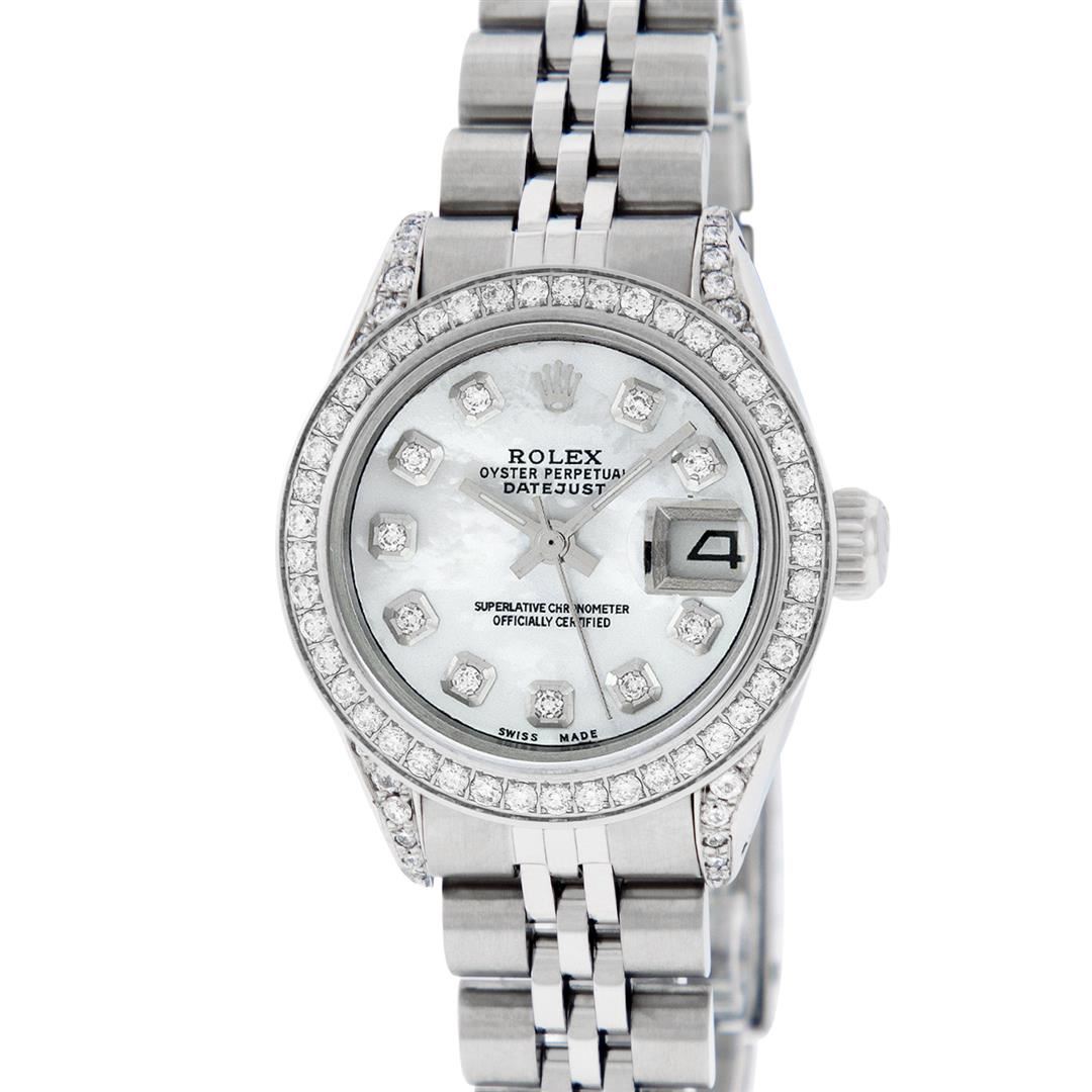 One Ladies Stainless Steel Rolex Datejust Polished Bright with Satin Finish, Serviced & Electronically Tested, Stainless Steel Case: 26mm, Stainless Steel Crown, Diamond Lugs: 24 Diamonds On Lugs, Clarity: SI-VS, Color: G to H. Custom Bezel: New Stainless Steel Beadset Bezel, Diamond Count: 39 Diamonds, Total Weight .70 Carat, Clarity: SI-VS, Color: G to H. Custom Crystal: New Scratch Resistant Synthetic Sapphire Cyclops Lens. Custom Hands: New Luminescent Hands. Movement: Automatic Winding Movement . Custom Dial: Mother Of Pearl Diamond Dial, 10 Diamonds in Dial G To H In Color, Clarity: VS. Date Window: 3 O'clock Position Date Display, Model: Datejust Condition: G-6 Extra Fine. Bracelet: Stainless Steel Jubilee Band. Bright Polish & Satin Finish. 6.0 Inch Length, Adjustable. Standard Clasp, With Rolex Logo. This Watch Has Been Serviced Time Tested And Is In Excellent Condition It Is Free Of All Scratches And Dents.