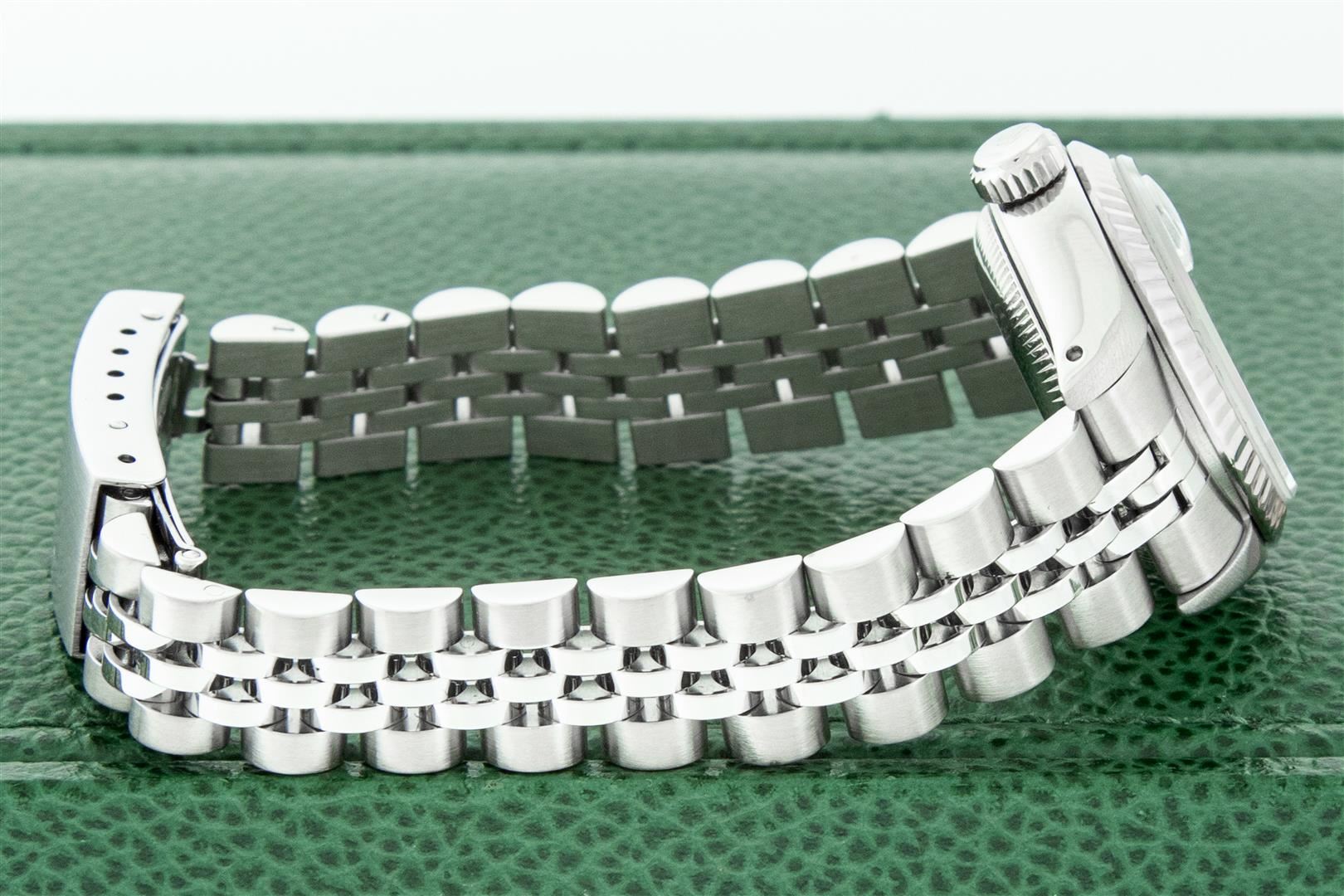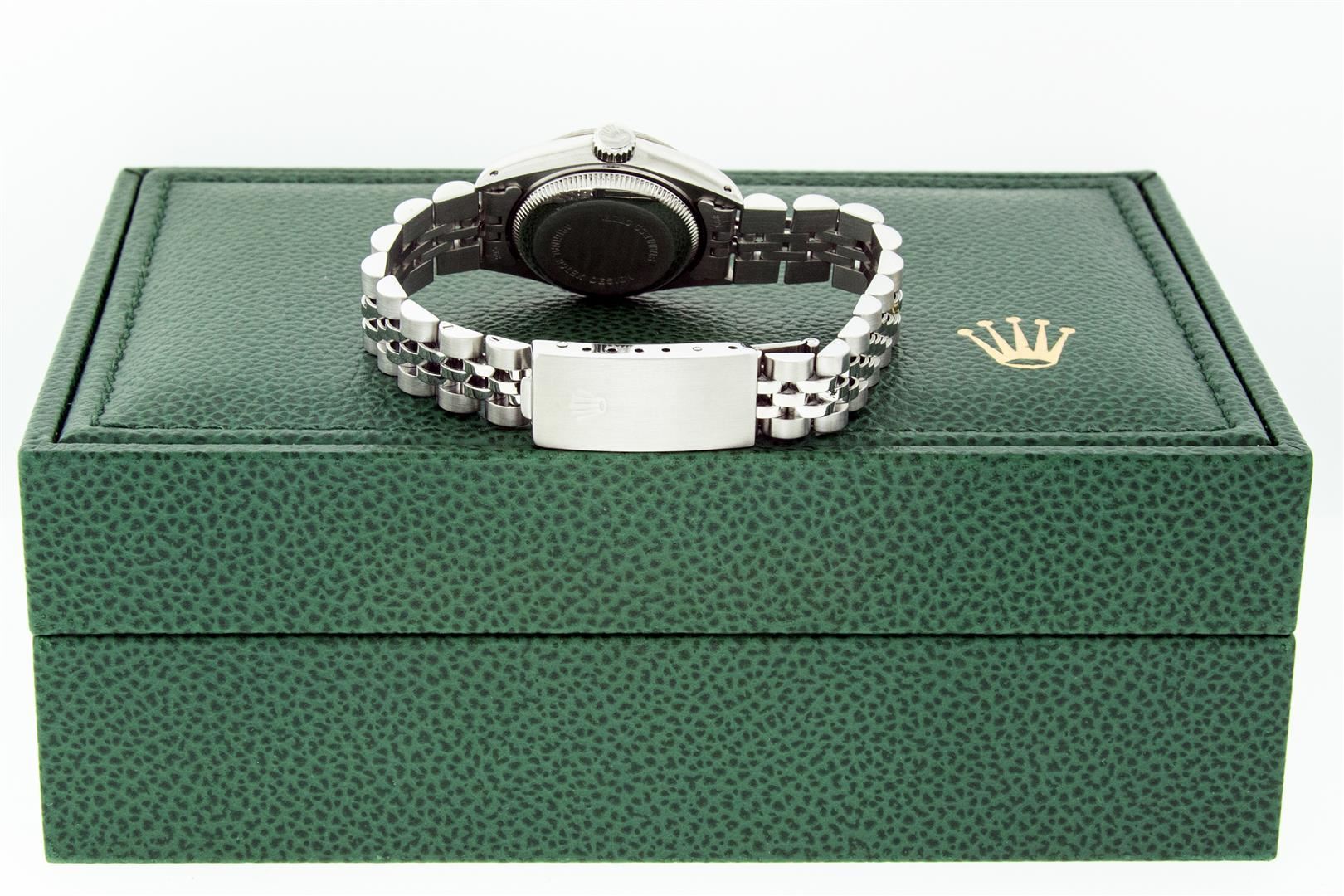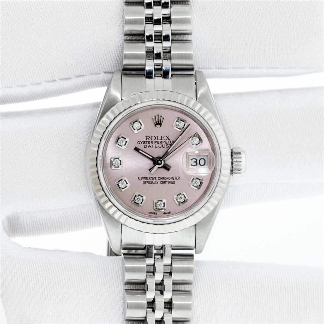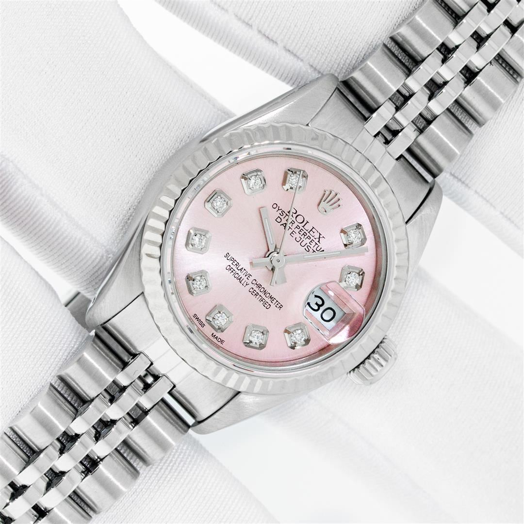 One Ladies Pre Owned Stainless Steel Rolex Datejust Polished Bright with Satin Finish, Serviced & Electronically Tested, Rolex Stainless Steel Case: 26mm, Rolex Stainless Steel Crown, Rolex Bezel: 14K White Gold Bezel. Custom Crystal: New Acrylic Cyclops Lens. Custom Hands: New Luminescent Hands. Rolex Movement: Automatic Winding Movement. Custom Dial: Refinished To Pink With Added Diamonds, Diamond Count: 10 Diamonds In Dial, Color: G to H, Clarity: SI-VS. Date Window: 3 O'Clock Position Date Display, Model: Datejust. Condition: G-6 Extra Fine. Rolex Bracelet: Stainless Steel Jubilee Band. Bright Polish & Satin Finish. 6.0 Inch Length, Adjustable. Standard Clasp, With Rolex Logo. This Watch Has Been Serviced Time Tested And Is In Excellent Condition It Is Free Of All Scratches And Dents. This Watch Comes With A Rolex Box.