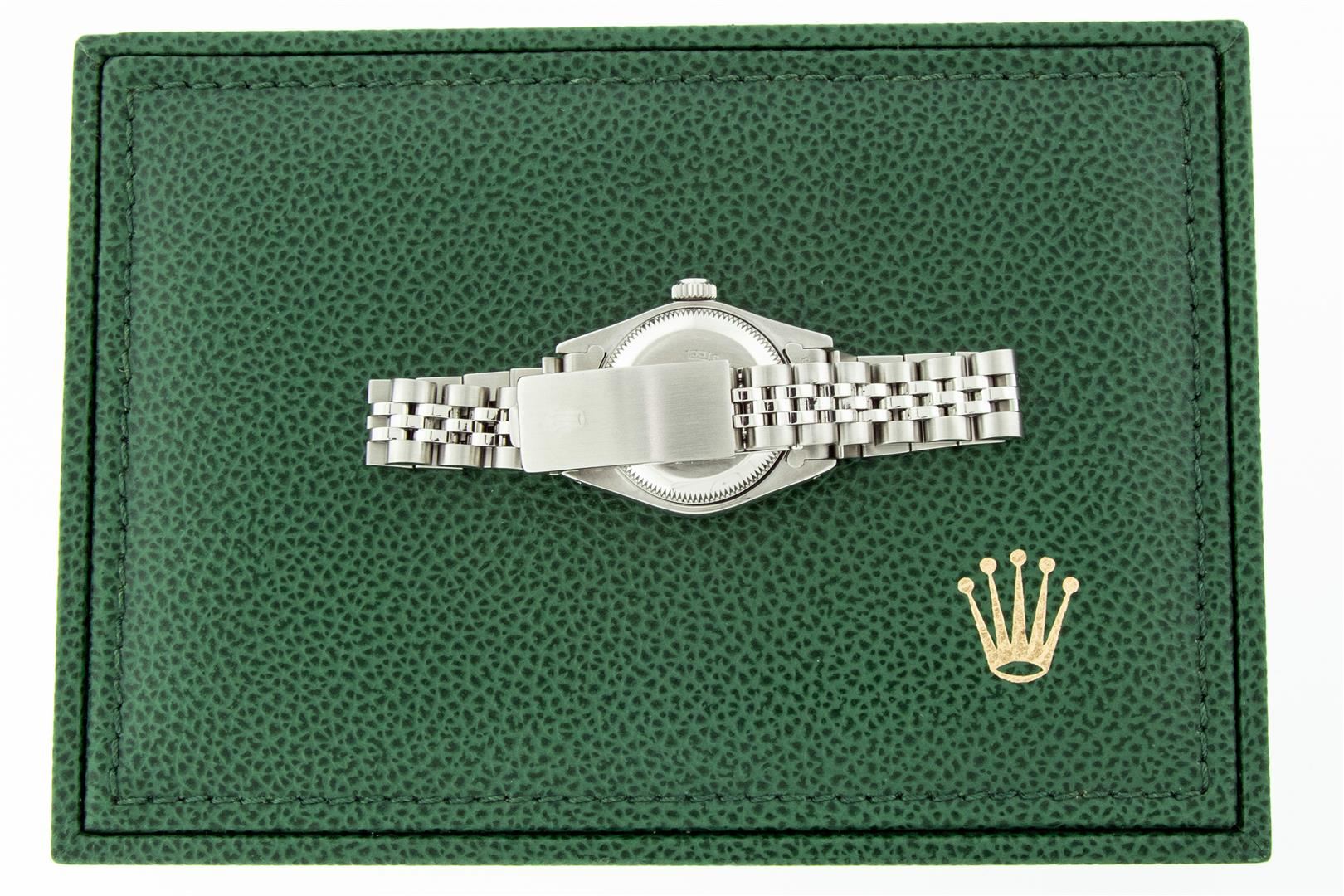 One Ladies Pre Owned Stainless Steel Rolex Datejust Polished Bright with Satin Finish, Serviced & Electronically Tested, Rolex Stainless Steel Case: 26mm, Rolex Stainless Steel Crown, Rolex Bezel: 14K White Gold Bezel. Custom Crystal: New Acrylic Cyclops Lens. Custom Hands: New Luminescent Hands. Rolex Movement: Automatic Winding Movement. Custom Dial: Refinished To Pink With Added Diamonds, Diamond Count: 10 Diamonds In Dial, Color: G to H, Clarity: SI-VS. Date Window: 3 O'Clock Position Date Display, Model: Datejust. Condition: G-6 Extra Fine. Rolex Bracelet: Stainless Steel Jubilee Band. Bright Polish & Satin Finish. 6.0 Inch Length, Adjustable. Standard Clasp, With Rolex Logo. This Watch Has Been Serviced Time Tested And Is In Excellent Condition It Is Free Of All Scratches And Dents. This Watch Comes With A Rolex Box.