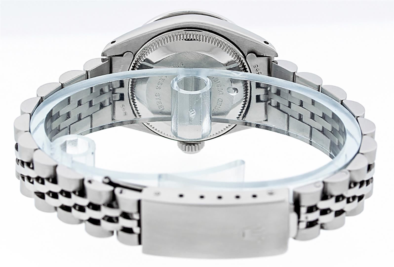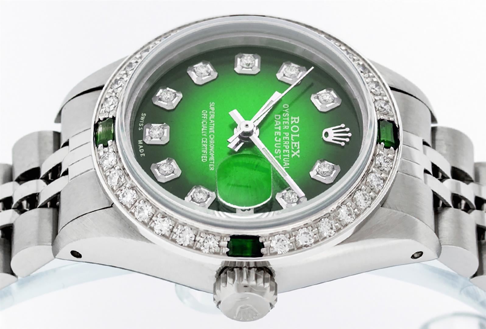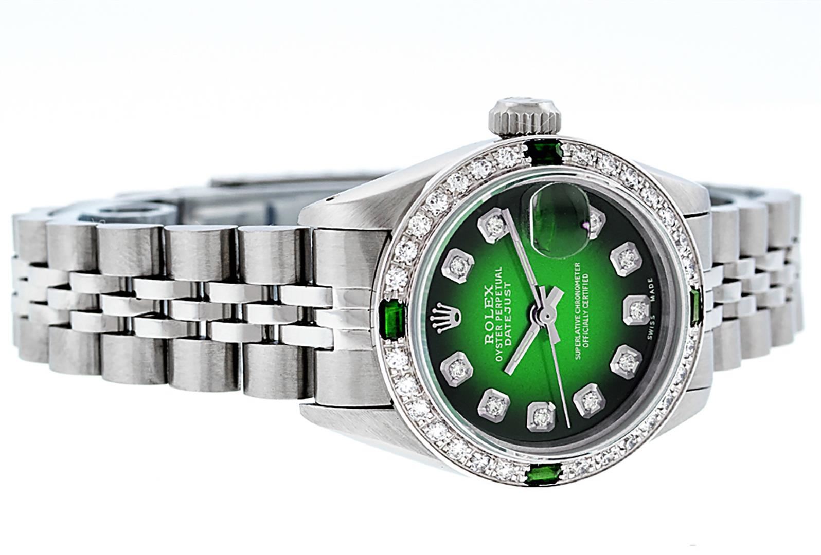 One Ladies Stainless Steel Rolex Datejust Polished Bright with Satin Finish, Serviced & Electronically Tested, Stainless Steel Case: 26mm, Stainless Steel Crown, Custom Bezel: New 18K White Gold Synthetic Emerald Beadset Diamond Bezel, Diamond + Gem Count: 28 Diamonds + 4 Emeralds Total Weight .70 Carat, Clarity: SI-VS, Color: G to H. Custom Crystal: New Synthetic Sapphire Cyclops Lens. Custom Hands: New Luminescent Hands. Movement: Automatic Winding Movement. Custom Dial: Refinished Green Vignette With Diamond Hour Markers. Diamond Count: 10 Diamonds In Dial, Clarity: SI-VS, Color: G to H. Date Window: 3 O'clock Position Date Display, Model: Datejust. Condition: G-6 Extra Fine. Bracelet: Stainless Steel Jubilee. Bright Polish & Satin Finish. 6.0 Inch Length, Adjustable. Standard Clasp, With Rolex Logo. This Watch Has Been Serviced Time Tested And Is In Excellent Condition It Is Free Of All Scratches And Dents.