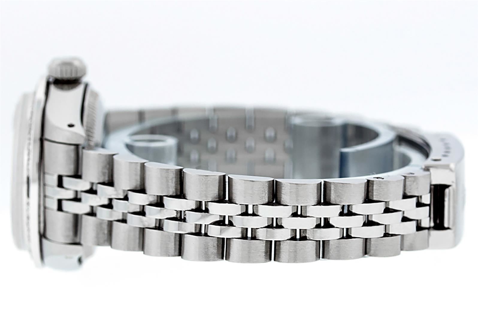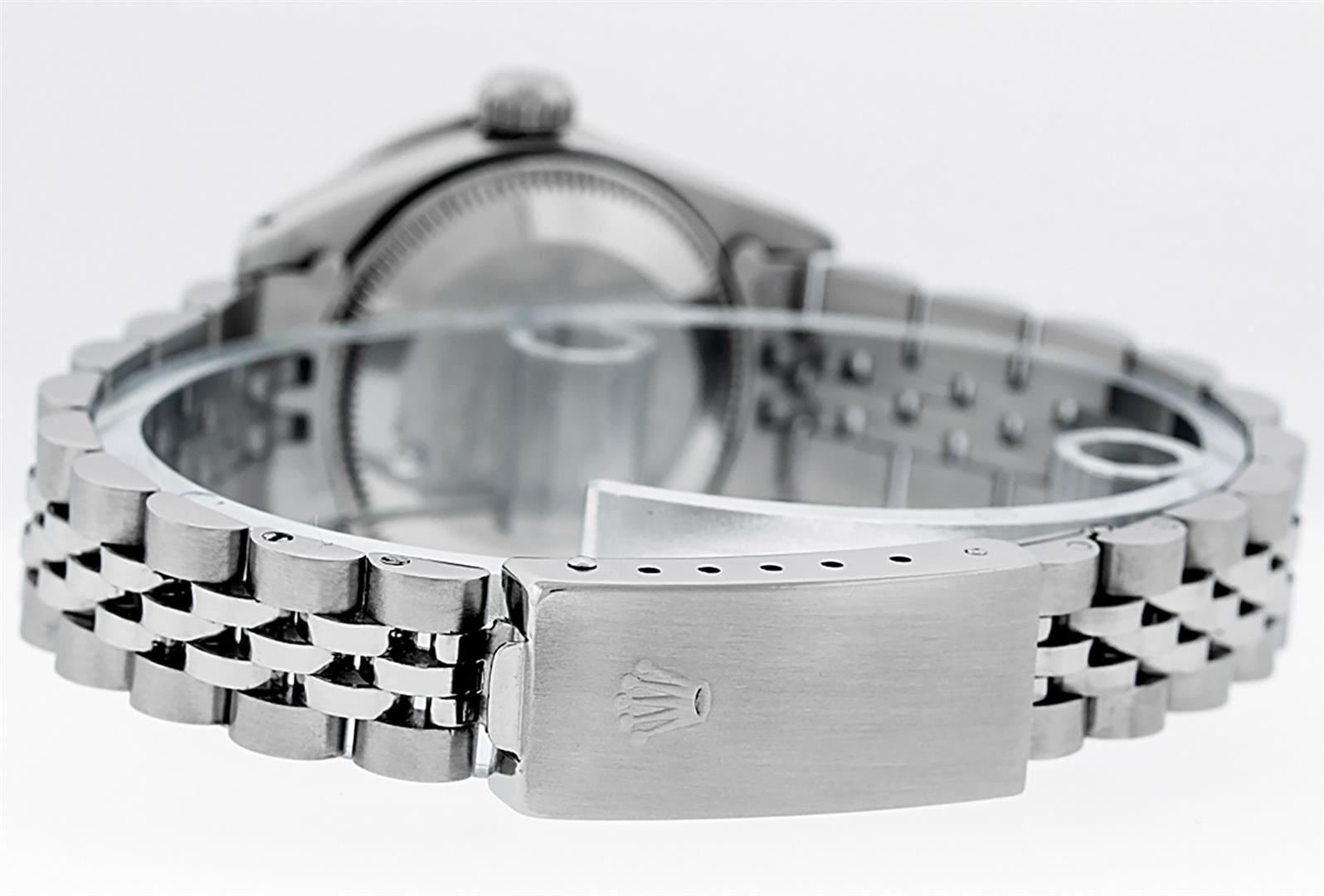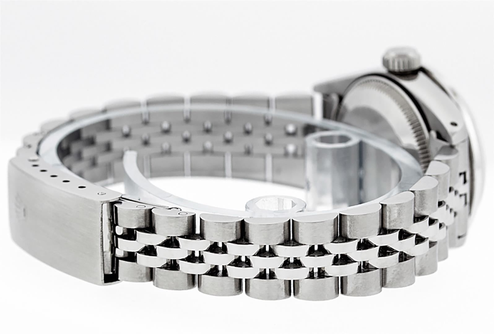 One Ladies Stainless Steel Rolex Datejust Polished Bright with Satin Finish, Serviced & Electronically Tested, Stainless Steel Case: 26mm, Stainless Steel Crown, Custom Bezel: New 18K White Gold Synthetic Emerald Beadset Diamond Bezel, Diamond + Gem Count: 28 Diamonds + 4 Emeralds Total Weight .70 Carat, Clarity: SI-VS, Color: G to H. Custom Crystal: New Synthetic Sapphire Cyclops Lens. Custom Hands: New Luminescent Hands. Movement: Automatic Winding Movement. Custom Dial: Refinished Green Vignette With Diamond Hour Markers. Diamond Count: 10 Diamonds In Dial, Clarity: SI-VS, Color: G to H. Date Window: 3 O'clock Position Date Display, Model: Datejust. Condition: G-6 Extra Fine. Bracelet: Stainless Steel Jubilee. Bright Polish & Satin Finish. 6.0 Inch Length, Adjustable. Standard Clasp, With Rolex Logo. This Watch Has Been Serviced Time Tested And Is In Excellent Condition It Is Free Of All Scratches And Dents.