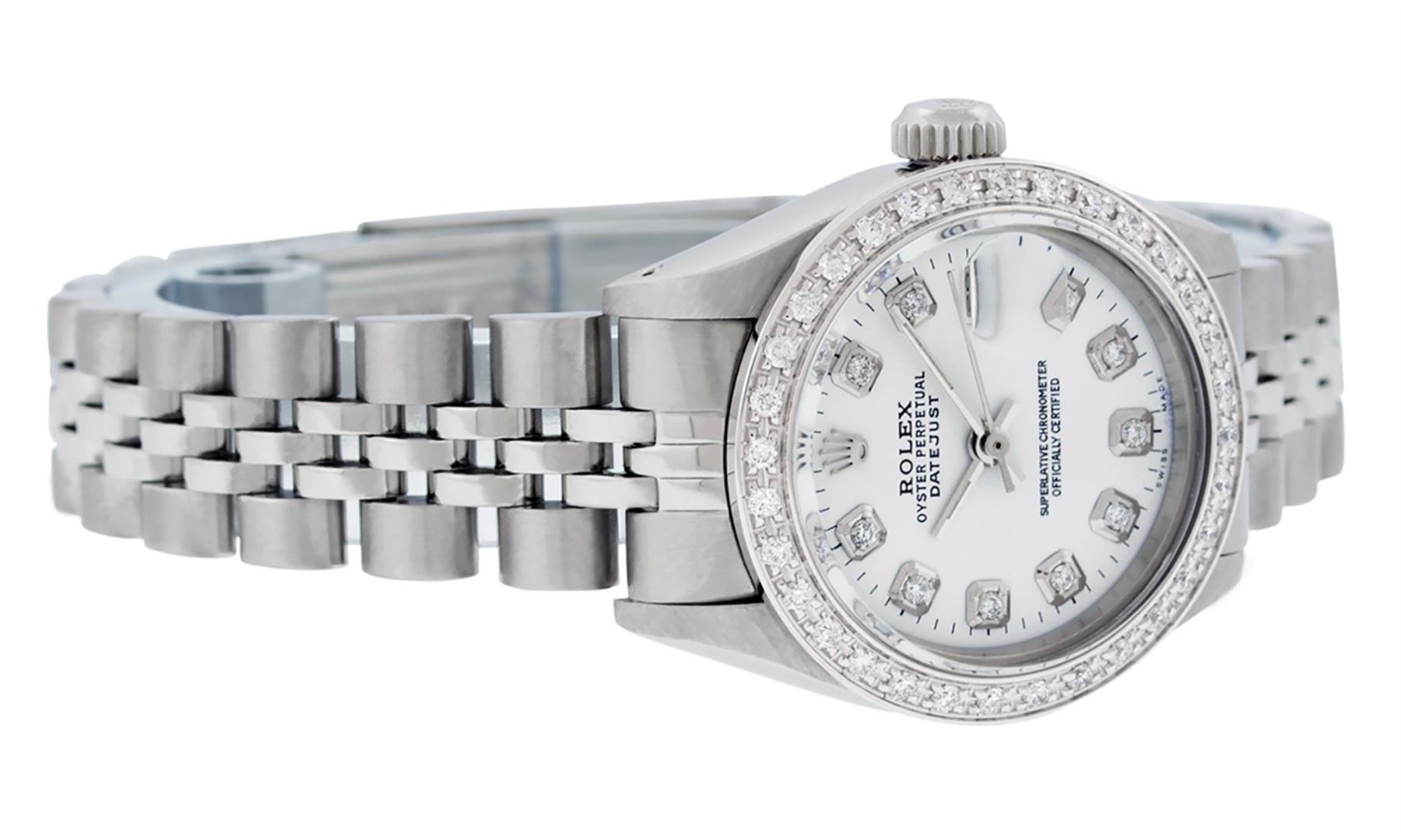 One Ladies Stainless Steel Rolex Datejust Polished Bright with Satin Finish, Serviced & Electronically Tested, Stainless Steel Case: 26mm, Stainless Steel Crown, Custom Bezel: New 18K White Gold Beadset Diamond Bezel, Diamond Count: 32 Diamonds, Total Weight .70 Carat, Clarity: SI-VS, Color: G to H. Custom Crystal: New Synthetic Sapphire Cyclops Lens. Custom Hands: New Luminescent Hands. Movement: Automatic Winding Movement. Custom Dial: White Diamond Dial, Diamond Count: 10 Diamonds In Dial, Color: G To H, Clarity: SI-VS. Date Window: 3 O'Clock Position Date Display, Model: Datejust. Condition: G-6 Extra Fine. Bracelet: Stainless Steel Jubilee. Bright Polish & Satin Finish. 6.0 Inch Length, Adjustable. Standard Clasp, With Rolex Logo. This Watch Has Been Serviced Time Tested And Is In Excellent Condition It Is Free Of All Scratches And Dents.