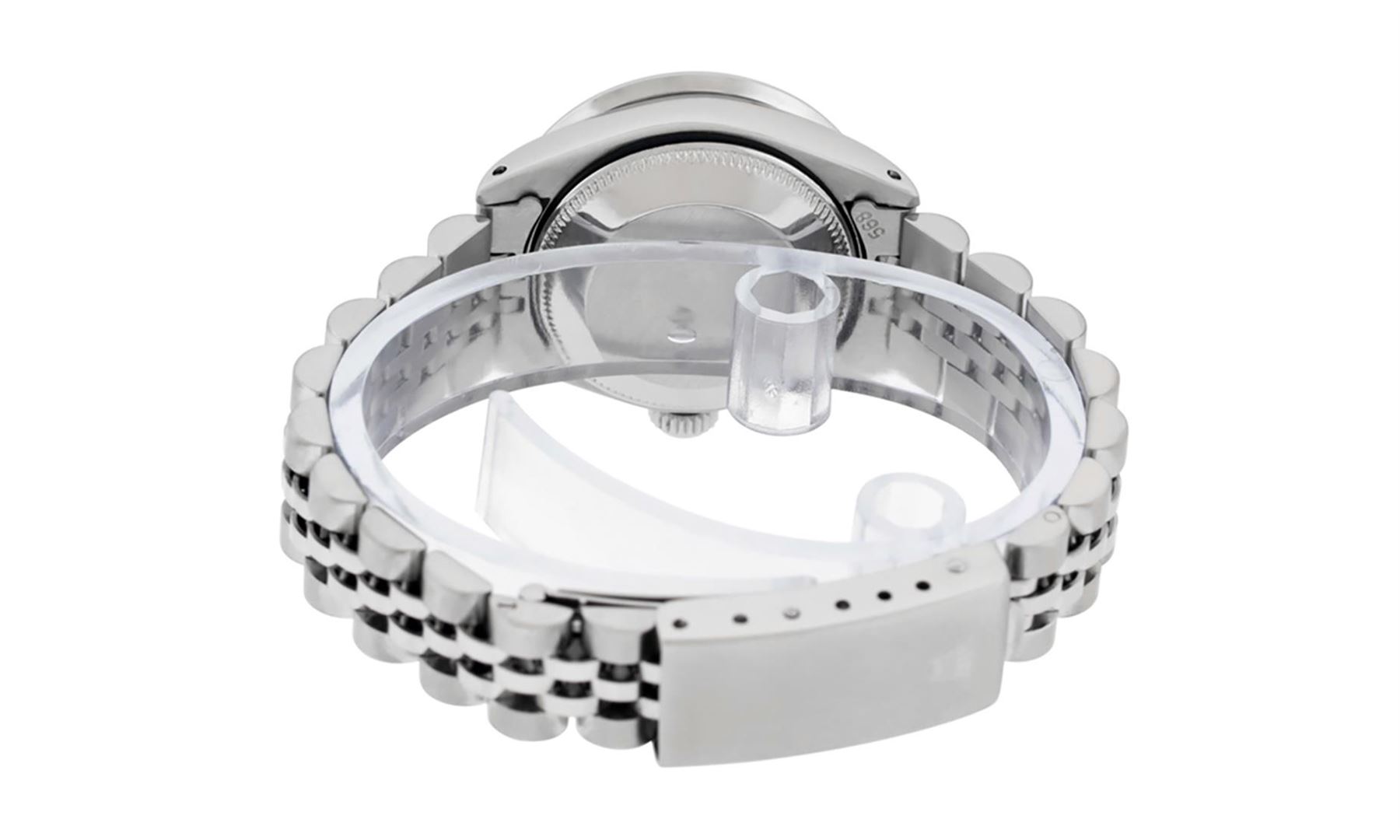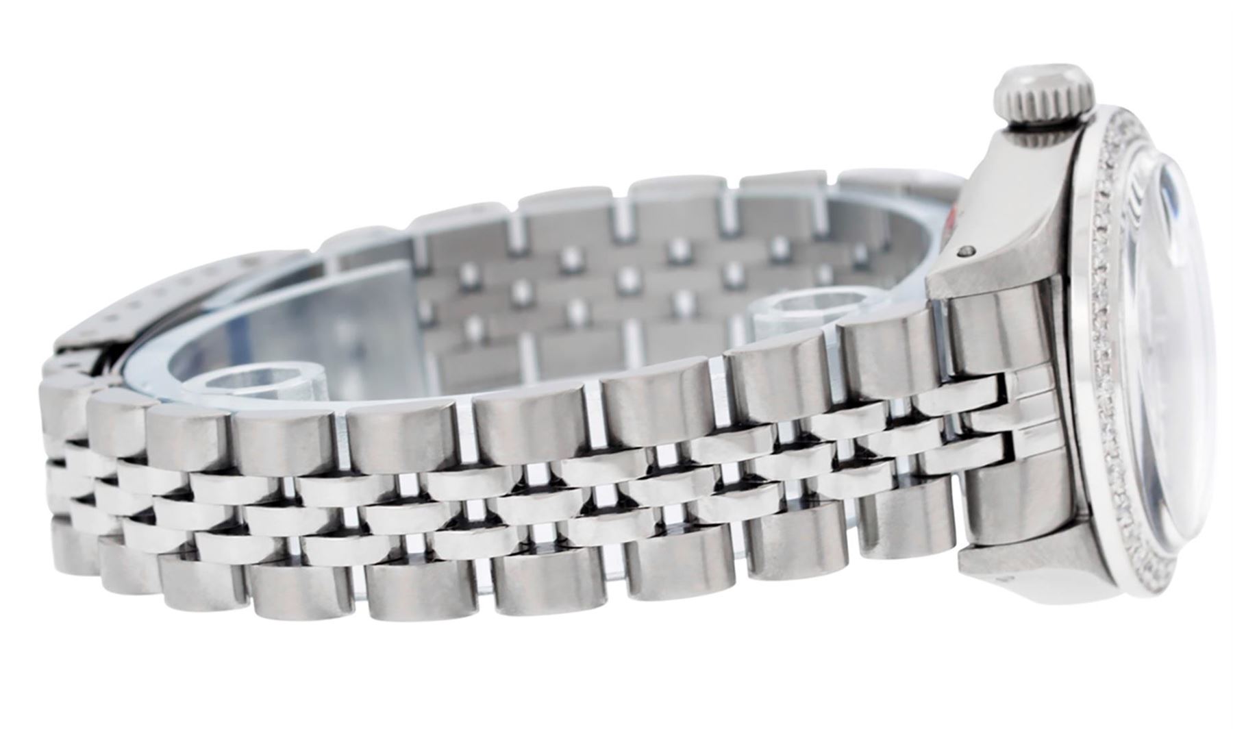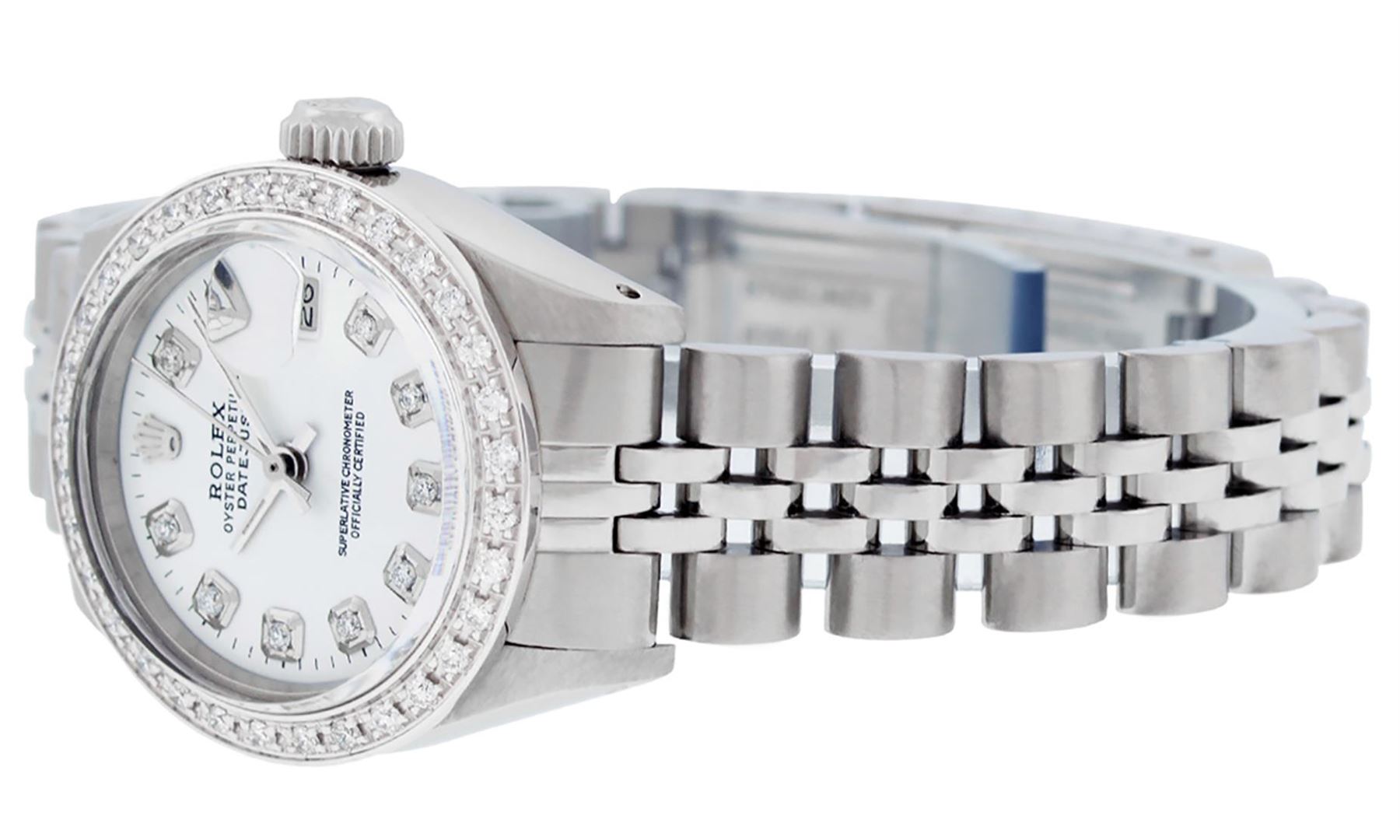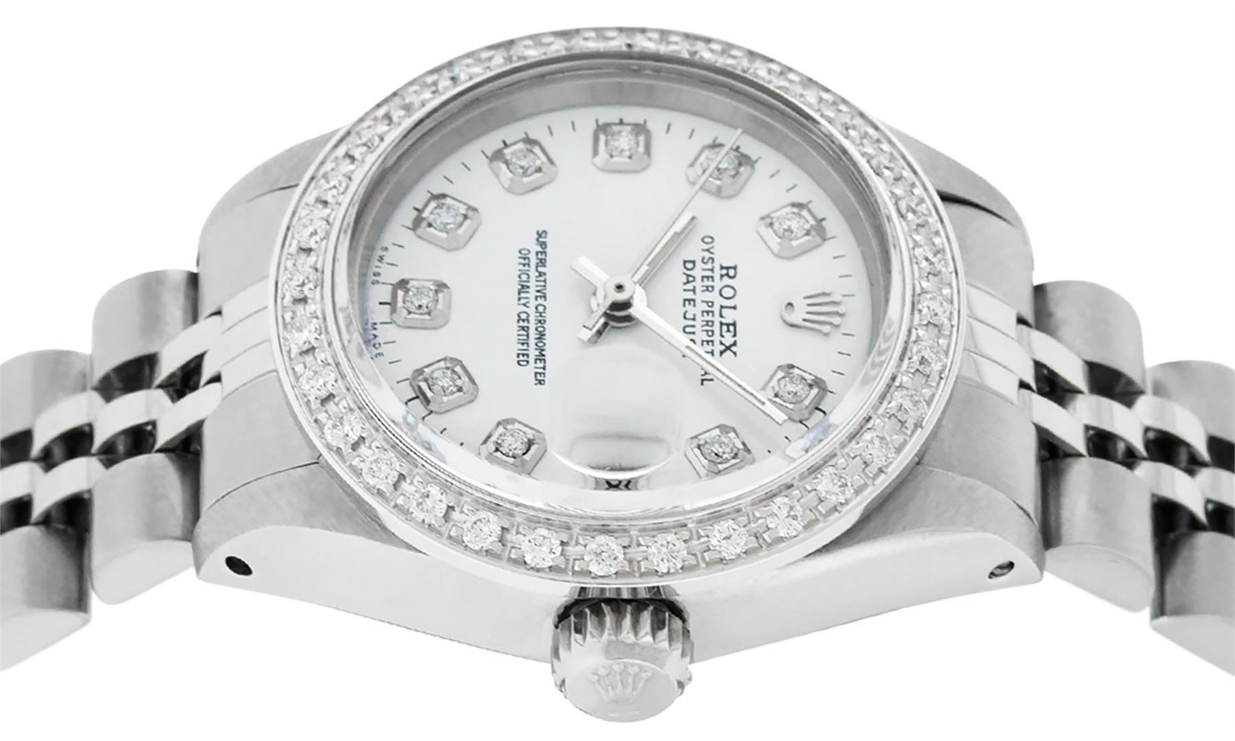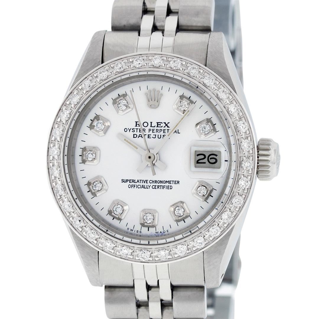 One Ladies Stainless Steel Rolex Datejust Polished Bright with Satin Finish, Serviced & Electronically Tested, Stainless Steel Case: 26mm, Stainless Steel Crown, Custom Bezel: New 18K White Gold Beadset Diamond Bezel, Diamond Count: 32 Diamonds, Total Weight .70 Carat, Clarity: SI-VS, Color: G to H. Custom Crystal: New Synthetic Sapphire Cyclops Lens. Custom Hands: New Luminescent Hands. Movement: Automatic Winding Movement. Custom Dial: White Diamond Dial, Diamond Count: 10 Diamonds In Dial, Color: G To H, Clarity: SI-VS. Date Window: 3 O'Clock Position Date Display, Model: Datejust. Condition: G-6 Extra Fine. Bracelet: Stainless Steel Jubilee. Bright Polish & Satin Finish. 6.0 Inch Length, Adjustable. Standard Clasp, With Rolex Logo. This Watch Has Been Serviced Time Tested And Is In Excellent Condition It Is Free Of All Scratches And Dents.