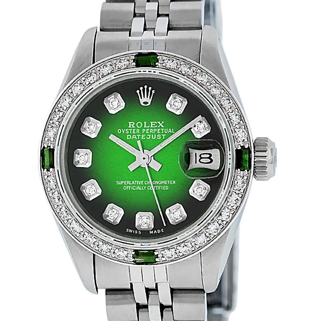One Ladies Stainless Steel Rolex Datejust Polished Bright with Satin Finish, Serviced & Electronically Tested, Stainless Steel Case: 26mm, Stainless Steel Crown, Custom Bezel: New 18K White Gold Synthetic Emerald Beadset Diamond Bezel, Diamond + Gem Count: 28 Diamonds + 4 Emeralds Total Weight .70 Carat, Clarity: SI-VS, Color: G to H. Custom Crystal: New Synthetic Sapphire Cyclops Lens. Custom Hands: New Luminescent Hands. Movement: Automatic Winding Movement. Custom Dial: Refinished Green Vignette With Diamond Hour Markers. Diamond Count: 10 Diamonds In Dial, Clarity: SI-VS, Color: G to H. Date Window: 3 O'clock Position Date Display, Model: Datejust. Condition: G-6 Extra Fine. Bracelet: Stainless Steel Jubilee. Bright Polish & Satin Finish. 6.0 Inch Length, Adjustable. Standard Clasp, With Rolex Logo. This Watch Has Been Serviced Time Tested And Is In Excellent Condition It Is Free Of All Scratches And Dents.
