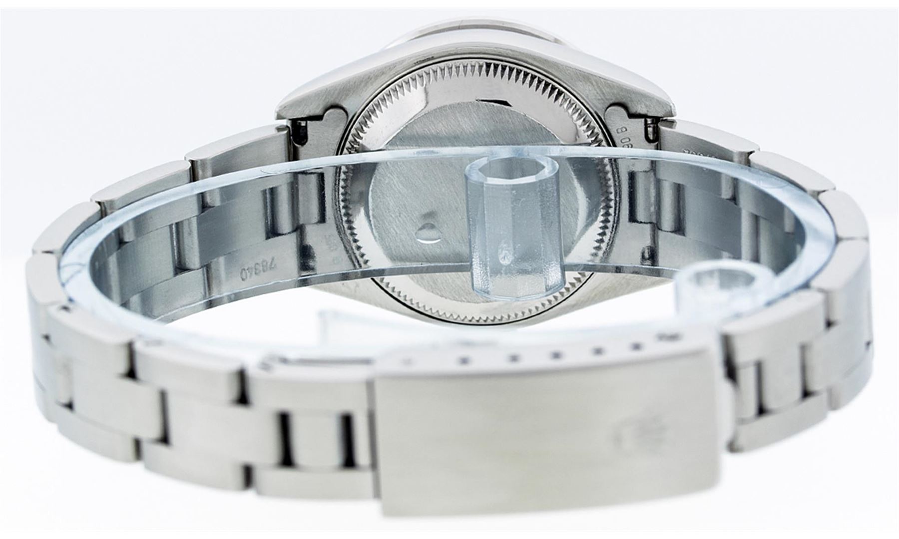 One Ladies Stainless Steel Quickset Rolex Datejust Polished Bright with Satin Finish, Serviced & Electronically Tested, Stainless Steel Case: 26mm, Stainless Steel Crown, Custom Diamond Lugs: 24 Diamonds On Lugs, Clarity: SI-VS, Color: G to H. Custom Bezel: New 18K White Gold Beadset Diamond Bezel, Diamond Count: 32 Diamonds Total Weight .70 Carat, Clarity: SI-VS, Color: G to H. Custom Crystal: New Scratch Resistant Synthetic Sapphire Cyclops Lens. Custom Hands: New Luminescent Hands. Movement: Automatic Quickset Winding Movement Caliber 2135. Custom Dial: Refinished Black With String Diamond Dial, 43 Single Cut Diamonds in Dial G To H In Color, Clarity: SI-VS. Date Window: 3 O'Clock Position Date Display, Model: Quickset Datejust. Condition: G-6 Extra Fine. Bracelet: Stainless Steel Oyster Band. Bright Polish & Satin Finish. 6.0 Inch Length, Adjustable. Standard Clasp, With Rolex Logo. This Watch Has Been Serviced Time Tested And Is In Excellent Condition It Is Free Of All Scratches And Dents. This Watch Comes With A Rolex Box.