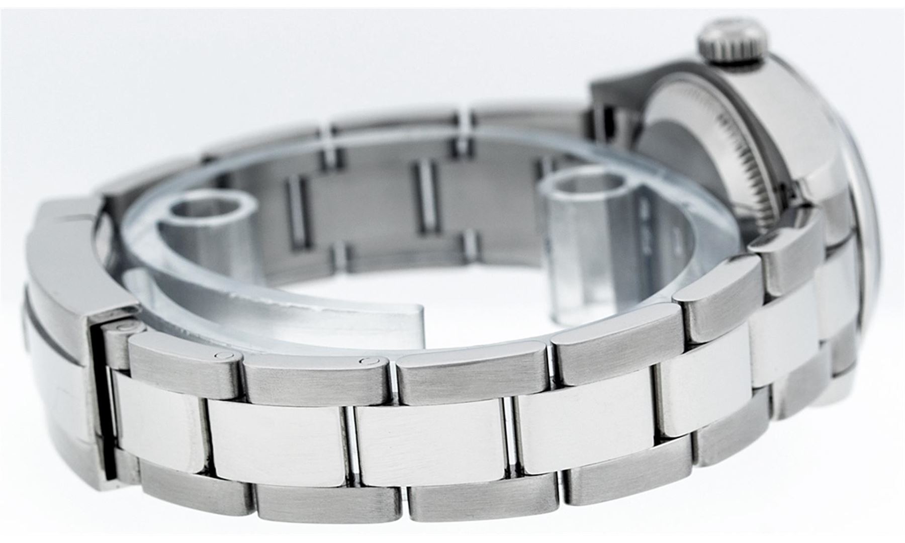 One Ladies Quickset Stainless Steel Rolex Datejust Polished Bright with Satin Finish, Serviced & Electronically Tested, Stainless Steel Case: 26mm, Stainless Steel Crown, Bezel: Stainless Steel Smooth Bezel. Custom Crystal: New Scratch Resistant Sapphire Cyclops Lens. Custom Hands: New Luminescent Hands. Movement: Automatic Winding Movement Caliber 2235. Custom Dial: Green Vignette Single Cut VS Diamond Dial, Diamond Count: 10 Single Cut Diamonds In Dial, Color: G to H, Clarity: VS. Date Window: 3 O'Clock Position Date Display, Model: 179160 Quickset Datejust. Condition: G-6 Extra Fine. Bracelet: Stainless Steel Oyster Band. Bright Polish & Satin Finish. 6.0 Inch Length, Adjustable. Standard Clasp, With Rolex Logo. This Watch Has Been Serviced Time Tested And Is In Excellent Condition It Is Free Of All Scratches And Dents. This Watch Comes With A Rolex Box.