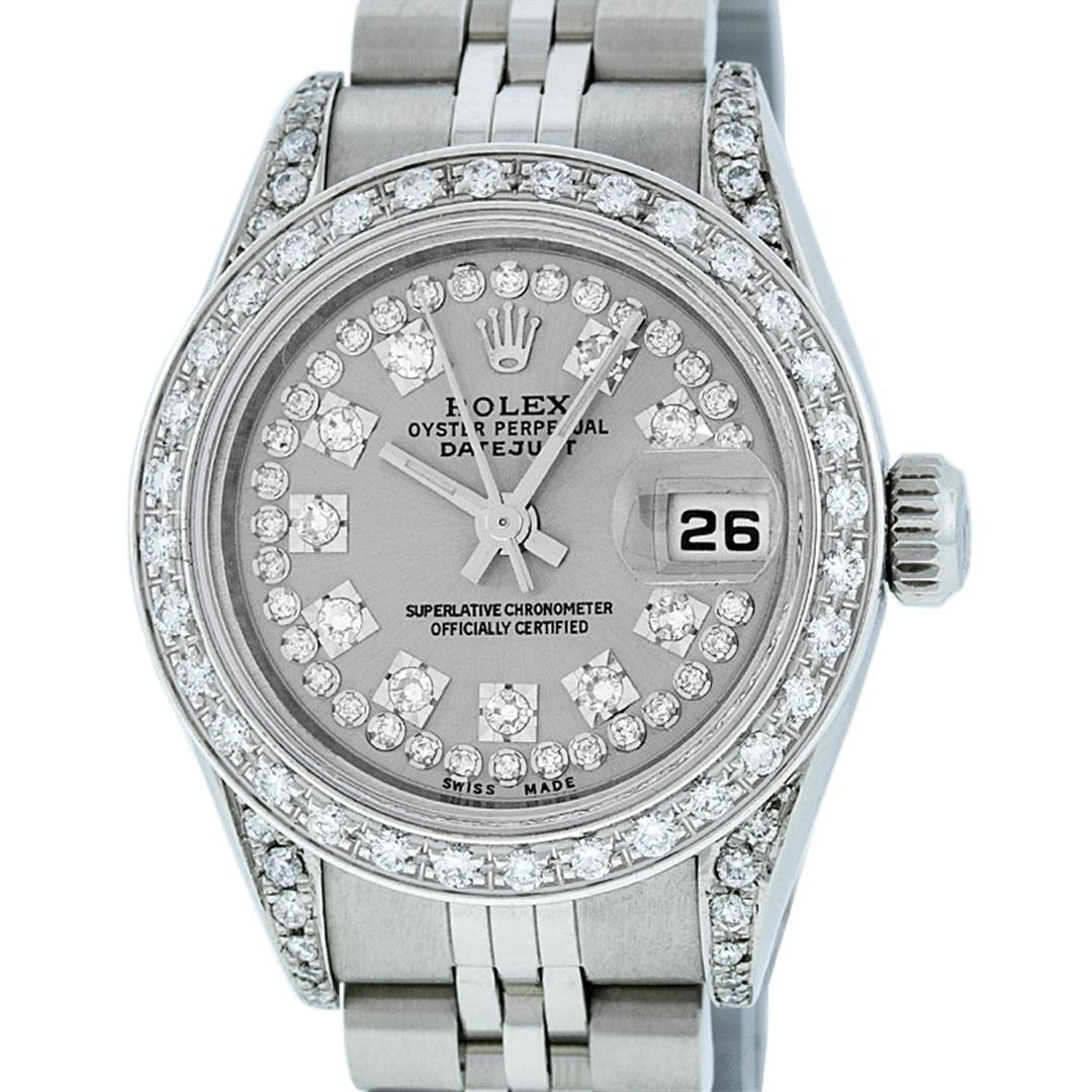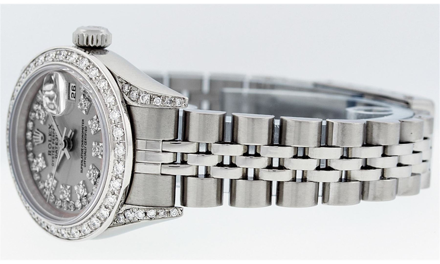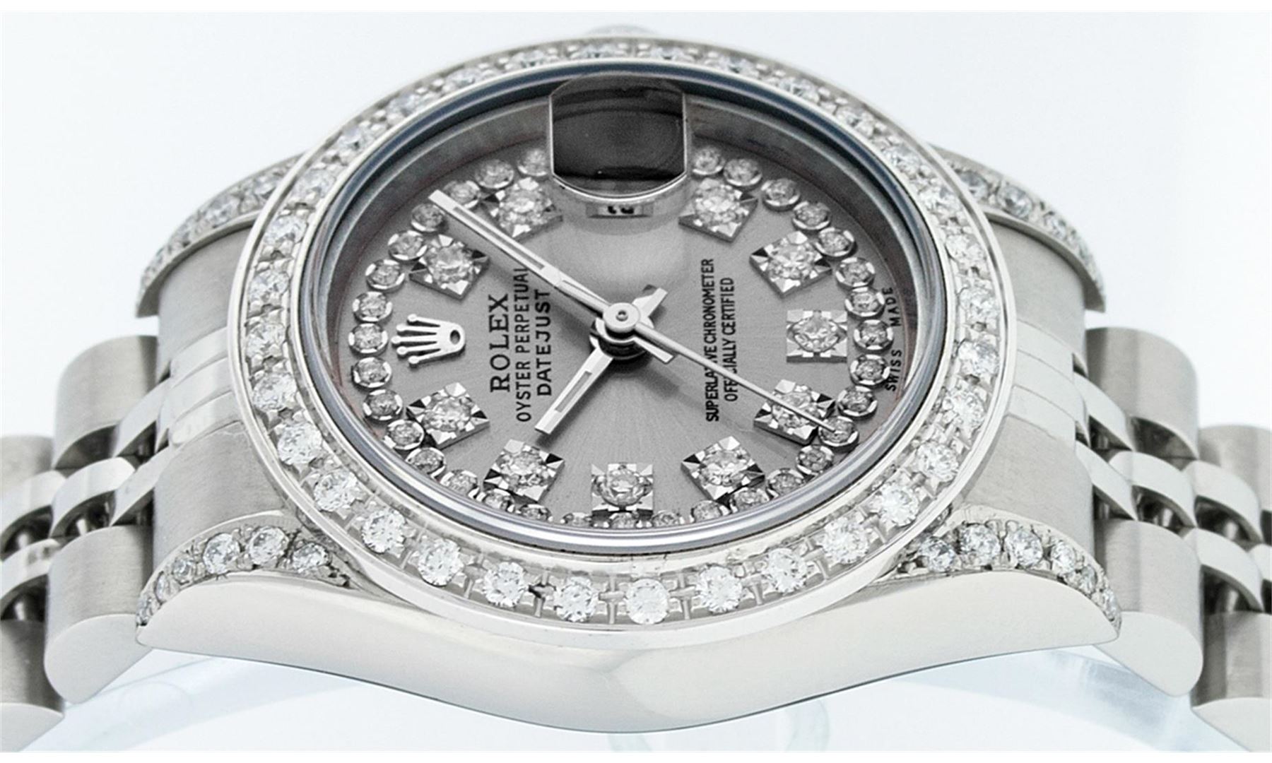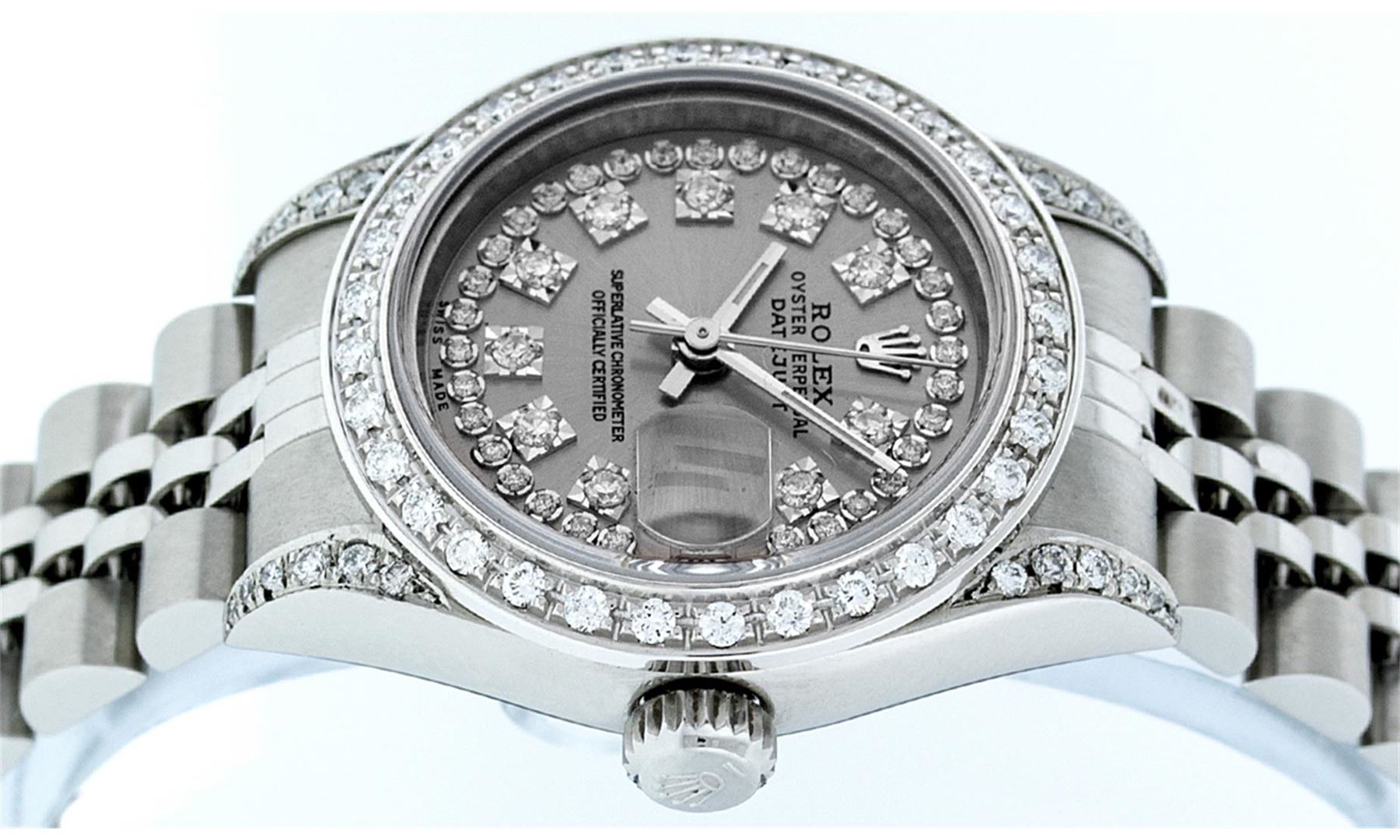 One Quickset Ladies Stainless Steel Rolex Datejust Polished Bright with Satin Finish, Serviced & Electronically Tested, Stainless Steel Case: 26mm, Stainless Steel Crown, Custom Diamond Lugs: 24 Diamonds On Lugs, Clarity: SI-VS, Color: G to H. Custom Bezel: New 18K White Gold Beadset Diamond Bezel, Stone Count: 32 Diamonds On Bezel, Total Weight .70 Carat, Clarity: SI-VS, Color: G to H. Custom Crystal: New Scratch Resistant Synthetic Sapphire Cyclops Lens. Custom Hands: New Luminescent Hands. Movement: Automatic Winding Movement. Custom Dial: Refinished Single Cut Slate Grey String Diamond Dial, 43 Diamonds in Dial, G To H In Color, Clarity: VS. Date Window: 3 O'Clock Position Date Display, Model: 79174 Quickjset Datejust. Condition: G-6 Extra Fine. Bracelet: Stainless Steel Jubilee Band. Bright Polish & Satin Finish. 6.0 Inch Length, Adjustable. Standard Clasp, With Rolex Logo. This Watch Has Been Serviced Time Tested And Is In Excellent Condition It Is Free Of All Scratches And Dents.