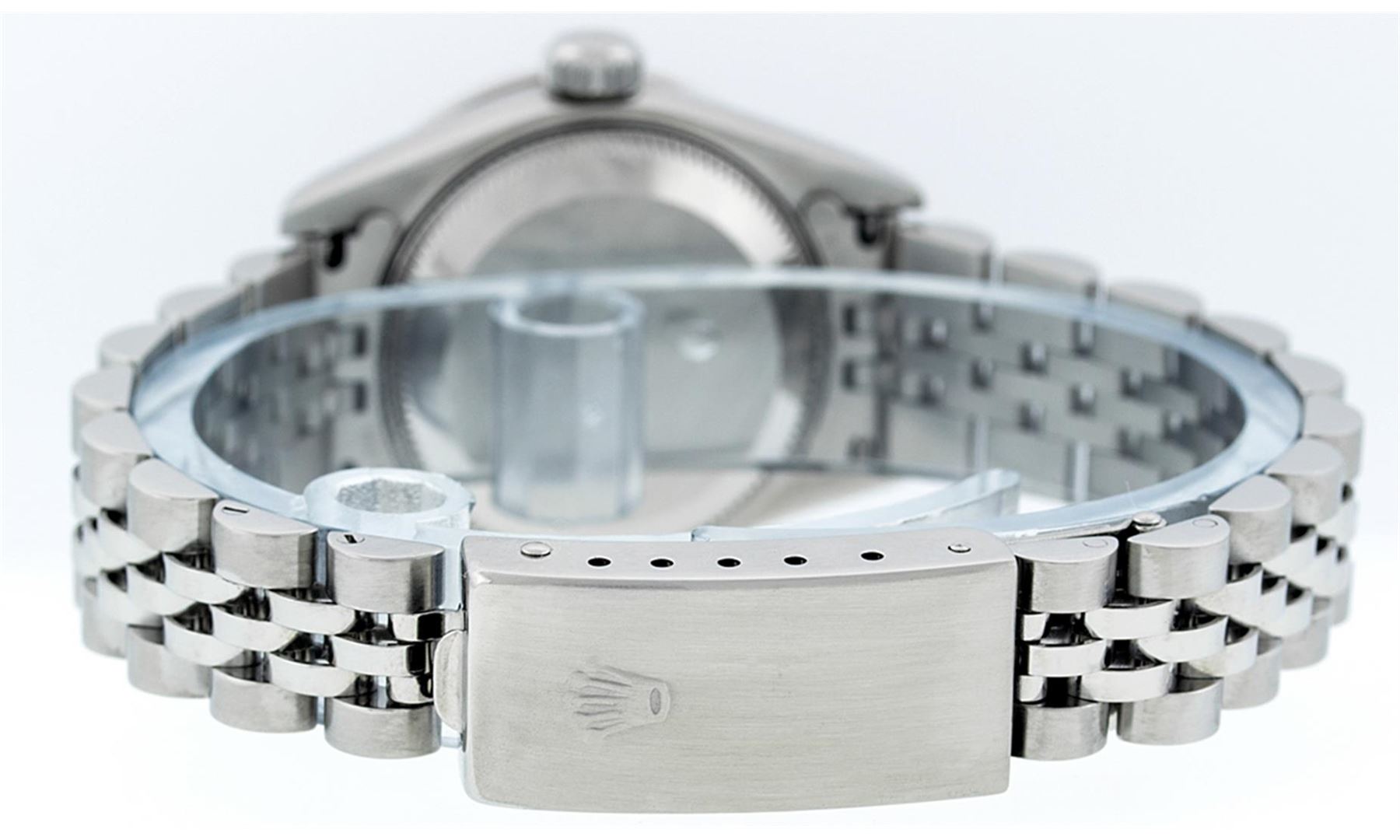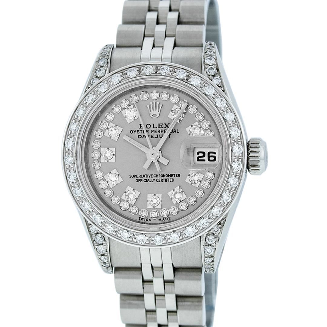 One Quickset Ladies Stainless Steel Rolex Datejust Polished Bright with Satin Finish, Serviced & Electronically Tested, Stainless Steel Case: 26mm, Stainless Steel Crown, Custom Diamond Lugs: 24 Diamonds On Lugs, Clarity: SI-VS, Color: G to H. Custom Bezel: New 18K White Gold Beadset Diamond Bezel, Stone Count: 32 Diamonds On Bezel, Total Weight .70 Carat, Clarity: SI-VS, Color: G to H. Custom Crystal: New Scratch Resistant Synthetic Sapphire Cyclops Lens. Custom Hands: New Luminescent Hands. Movement: Automatic Winding Movement. Custom Dial: Refinished Single Cut Slate Grey String Diamond Dial, 43 Diamonds in Dial, G To H In Color, Clarity: VS. Date Window: 3 O'Clock Position Date Display, Model: 79174 Quickjset Datejust. Condition: G-6 Extra Fine. Bracelet: Stainless Steel Jubilee Band. Bright Polish & Satin Finish. 6.0 Inch Length, Adjustable. Standard Clasp, With Rolex Logo. This Watch Has Been Serviced Time Tested And Is In Excellent Condition It Is Free Of All Scratches And Dents.