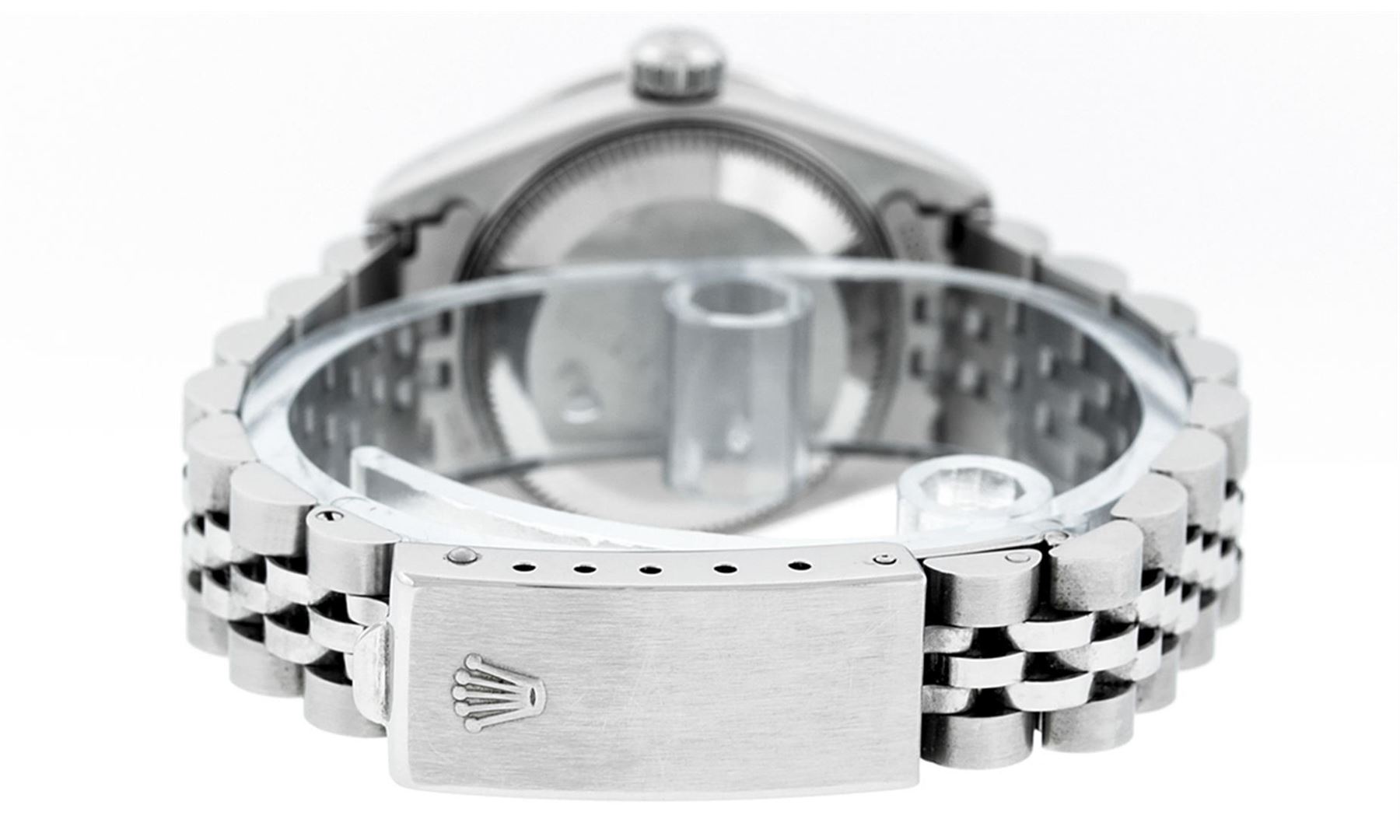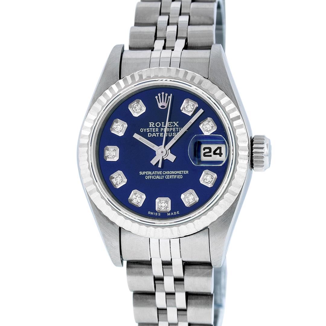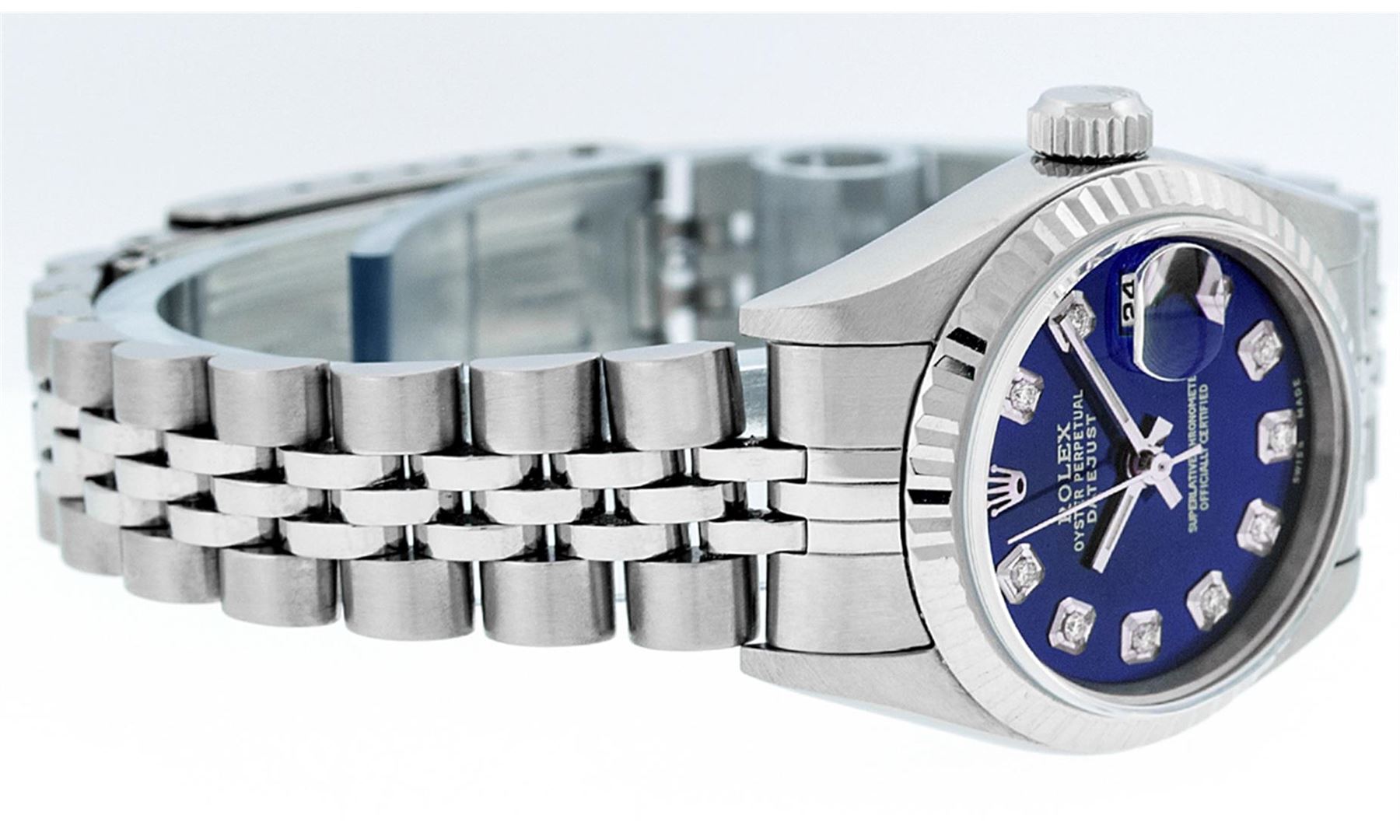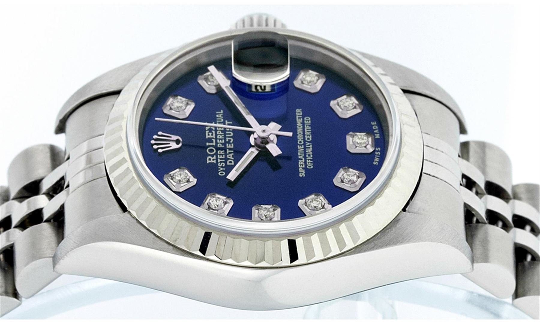 One Rolex Ladies Pre Owned Quickset Stainless Steel Oyster Perpetual Datejust Polished Bright with Satin Finish, Serviced & Electronically Tested, Rolex Stainless Steel Case: 26mm, Rolex Stainless Steel Crown, Rolex Bezel: 18K White Gold Fluted Bezel. Custom Crystal: New Scratch Resistant Sapphire Cyclops Lens. Custom Hands: New Luminescent Hands. Rolex Movement: Automatic Winding Movement. Custom Dial: Refinished To Blue With Custom Added Diamonds, Diamond Count: 10 Diamonds In Dial, Color: G to H, Clarity: SI1 Date Window: 3 O'Clock Position Date Display, Model: Quickset Datejust 79174. Condition: G-6 Extra Fine. Rolex Bracelet: Stainless Steel Jubilee Band. Bright Polish & Satin Finish. 6.0 Inch Length, Adjustable. Standard Clasp, With Rolex Logo. This Watch Has Been Serviced Time Tested And Is In Excellent Condition It Is Free Of All Scratches And Dents.