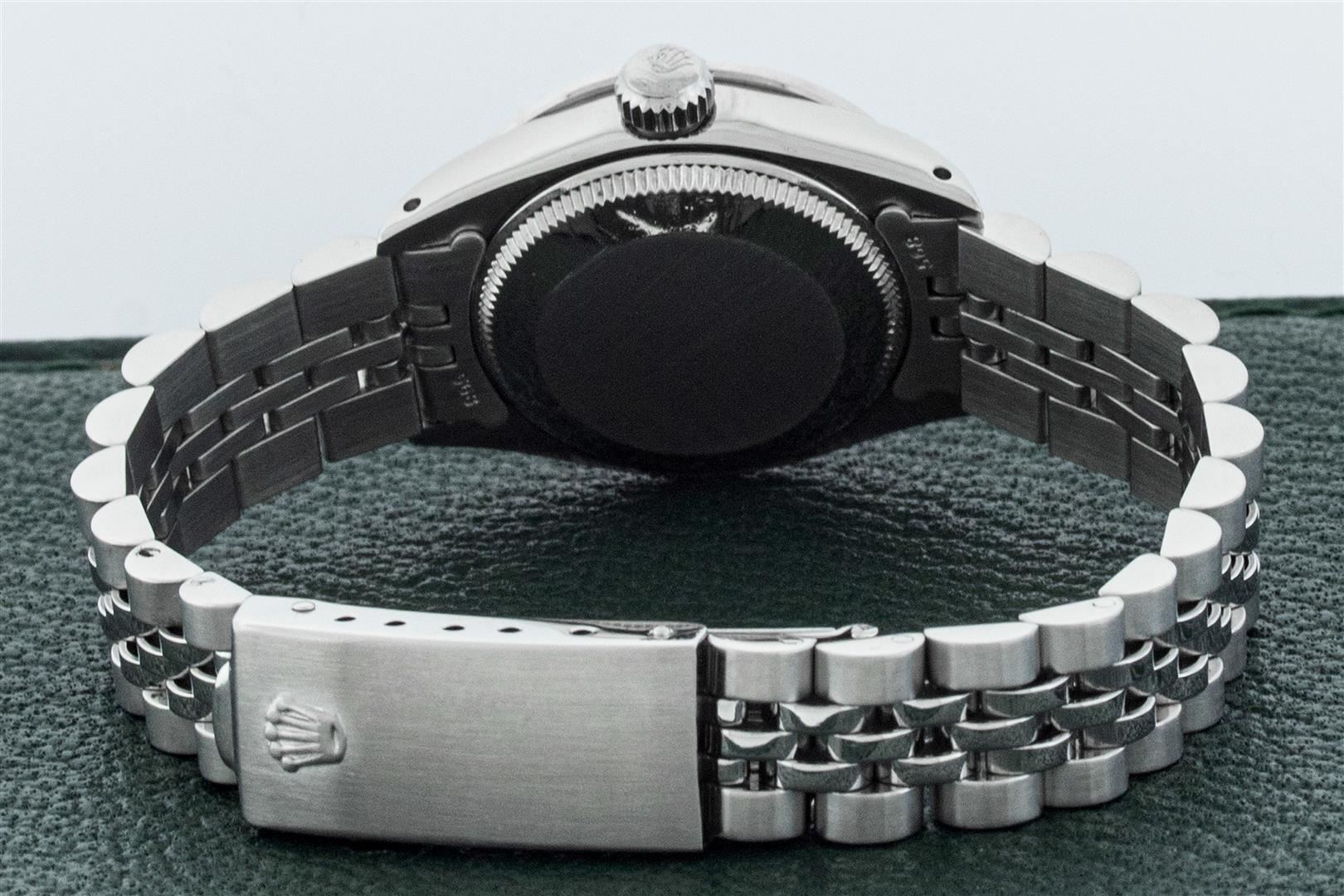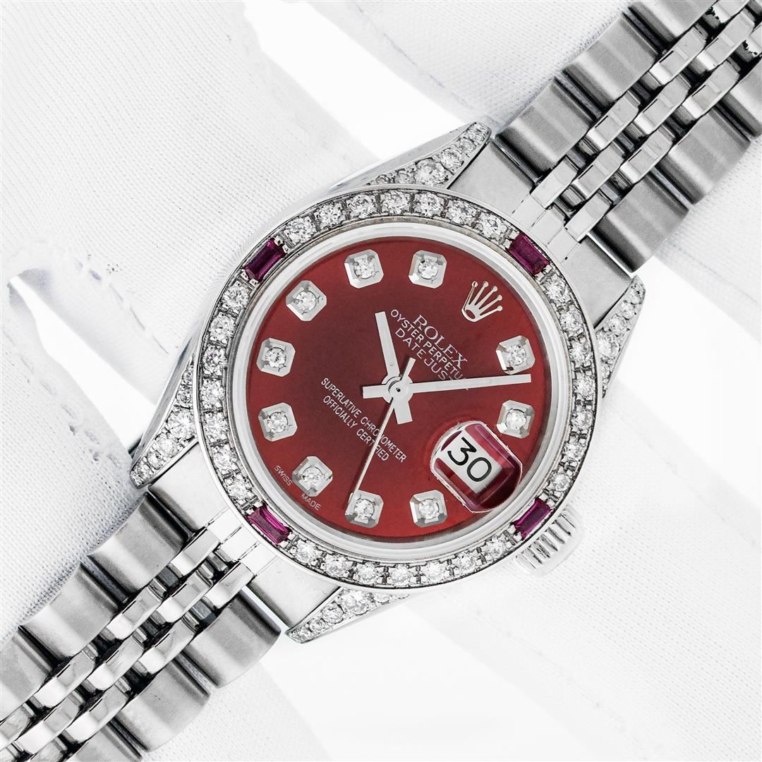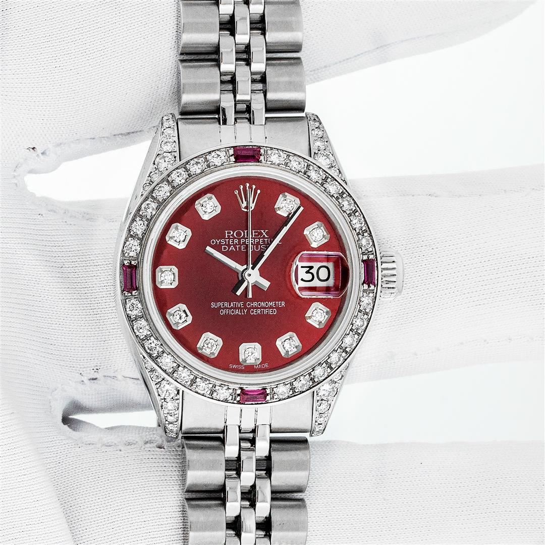 One Ladies Stainless Steel Rolex Datejust Polished Bright with Satin Finish, Serviced & Electronically Tested, Stainless Steel Case: 26mm, Stainless Steel Crown, Diamond Lugs: 24 Diamonds On Lugs, Clarity: SI-VS, Color: G to H. Custom Bezel: New 18K White Gold Diamond & Ruby Beadset Bezel, Diamond Count: 28 Diamonds + 4 Rubies, Total Weight .70 Carat, Clarity: SI-VS, Color: G to H. Custom Crystal: New Scratch Resistant Synthetic Sapphire Cyclops Lens. Custom Hands: New Luminescent Hands. Movement: Automatic Winding Movement. Custom Dial: Refinished Red Diamond Dial, Diamond Count: 10 Diamonds in Dial, G To H In Color, Clarity: SI-VS. Date Window: 3 O'Clock Position Date Display, Model: Datejust Condition: G-6 Extra Fine. Bracelet: Stainless Steel Jubilee. Bright Polish & Satin Finish. 6.0 Inch Length, Adjustable. Standard Clasp, With Rolex Logo. This Watch Has Been Serviced Time Tested And Is In Excellent Condition It Is Free Of All Scratches And Dents. This watch comes with a Rolex Box.