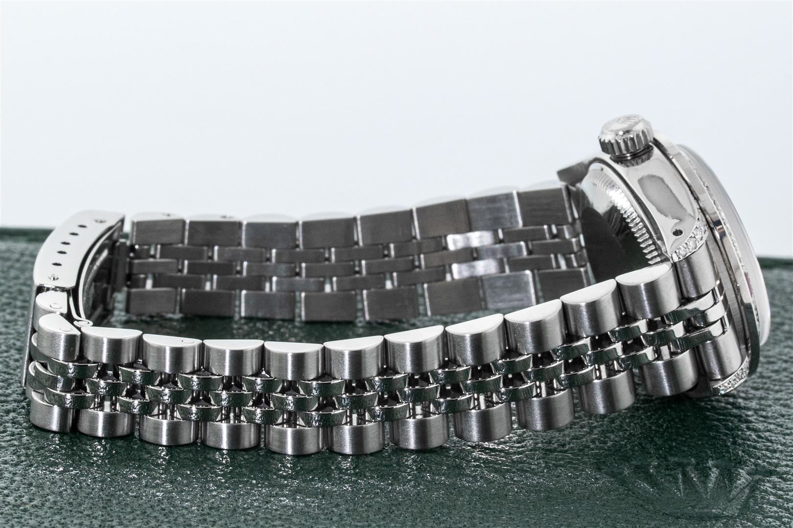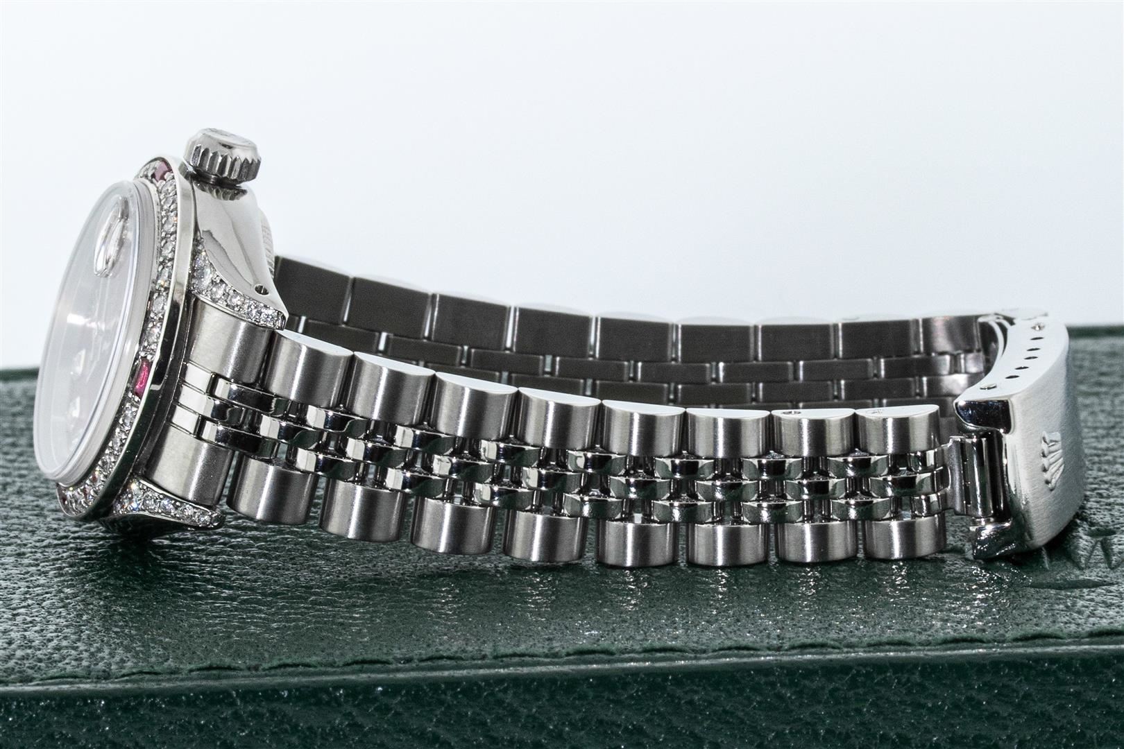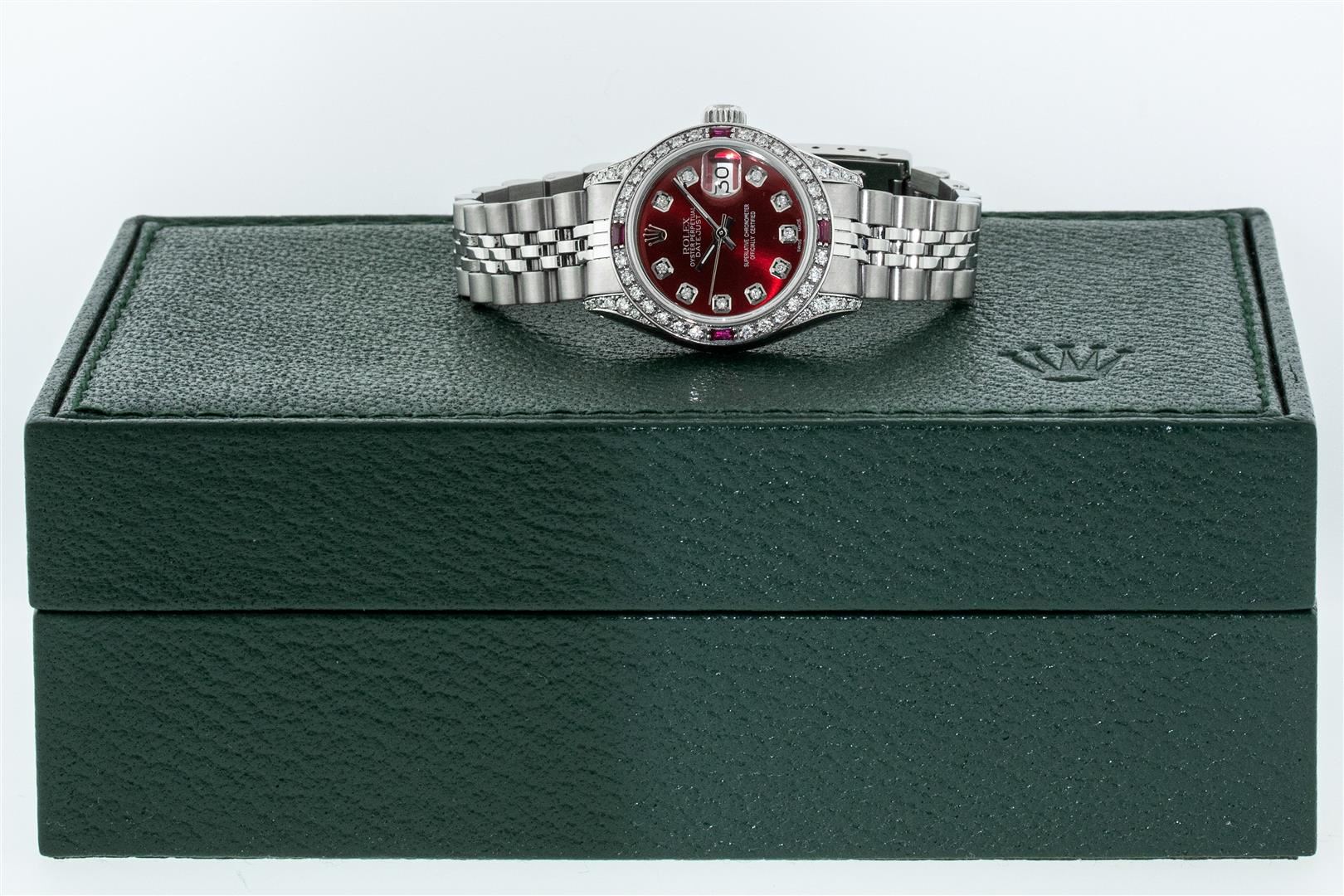 One Ladies Stainless Steel Rolex Datejust Polished Bright with Satin Finish, Serviced & Electronically Tested, Stainless Steel Case: 26mm, Stainless Steel Crown, Diamond Lugs: 24 Diamonds On Lugs, Clarity: SI-VS, Color: G to H. Custom Bezel: New 18K White Gold Diamond & Ruby Beadset Bezel, Diamond Count: 28 Diamonds + 4 Rubies, Total Weight .70 Carat, Clarity: SI-VS, Color: G to H. Custom Crystal: New Scratch Resistant Synthetic Sapphire Cyclops Lens. Custom Hands: New Luminescent Hands. Movement: Automatic Winding Movement. Custom Dial: Refinished Red Diamond Dial, Diamond Count: 10 Diamonds in Dial, G To H In Color, Clarity: SI-VS. Date Window: 3 O'Clock Position Date Display, Model: Datejust Condition: G-6 Extra Fine. Bracelet: Stainless Steel Jubilee. Bright Polish & Satin Finish. 6.0 Inch Length, Adjustable. Standard Clasp, With Rolex Logo. This Watch Has Been Serviced Time Tested And Is In Excellent Condition It Is Free Of All Scratches And Dents. This watch comes with a Rolex Box.