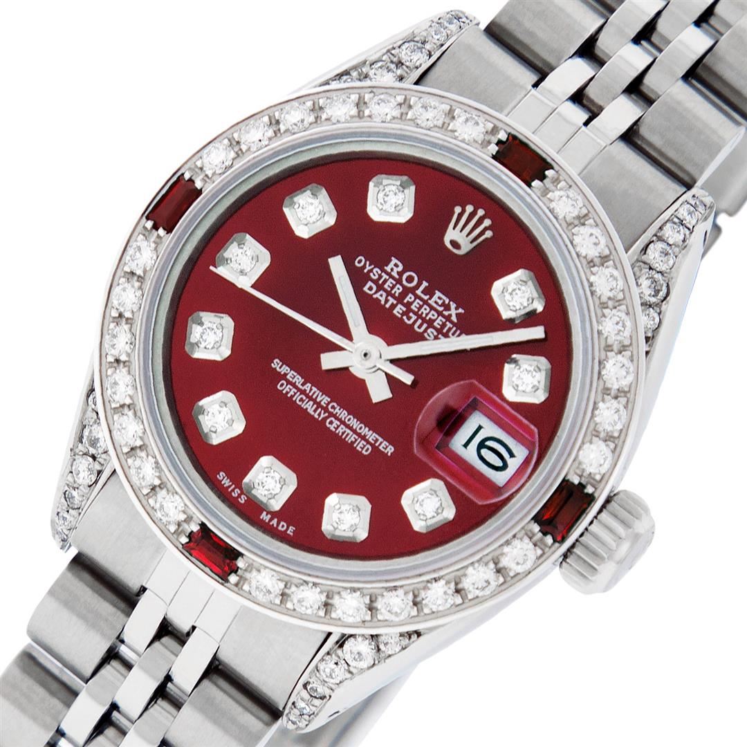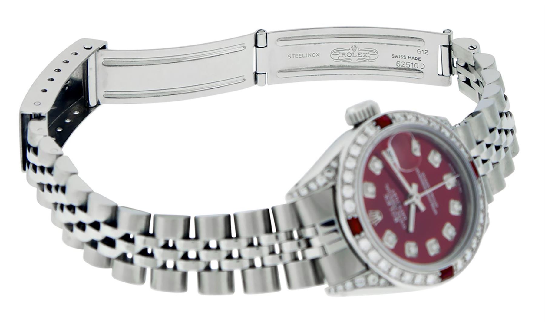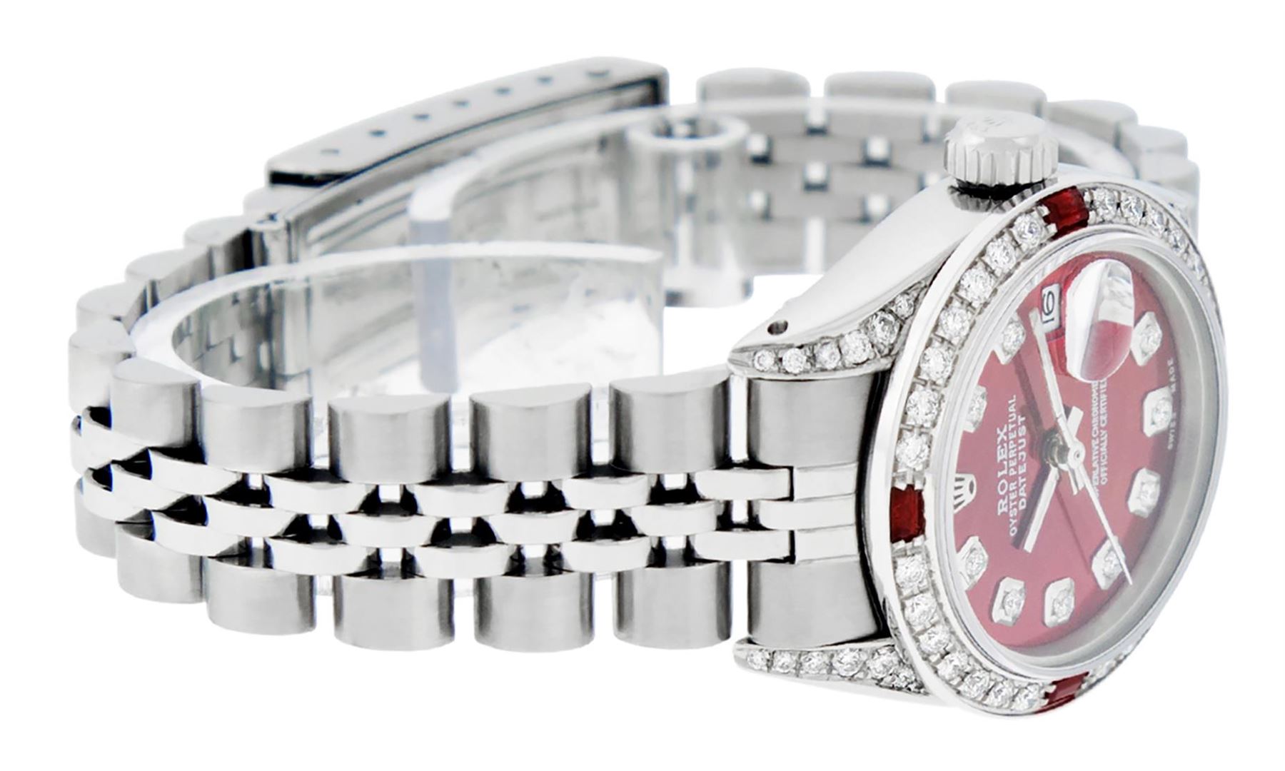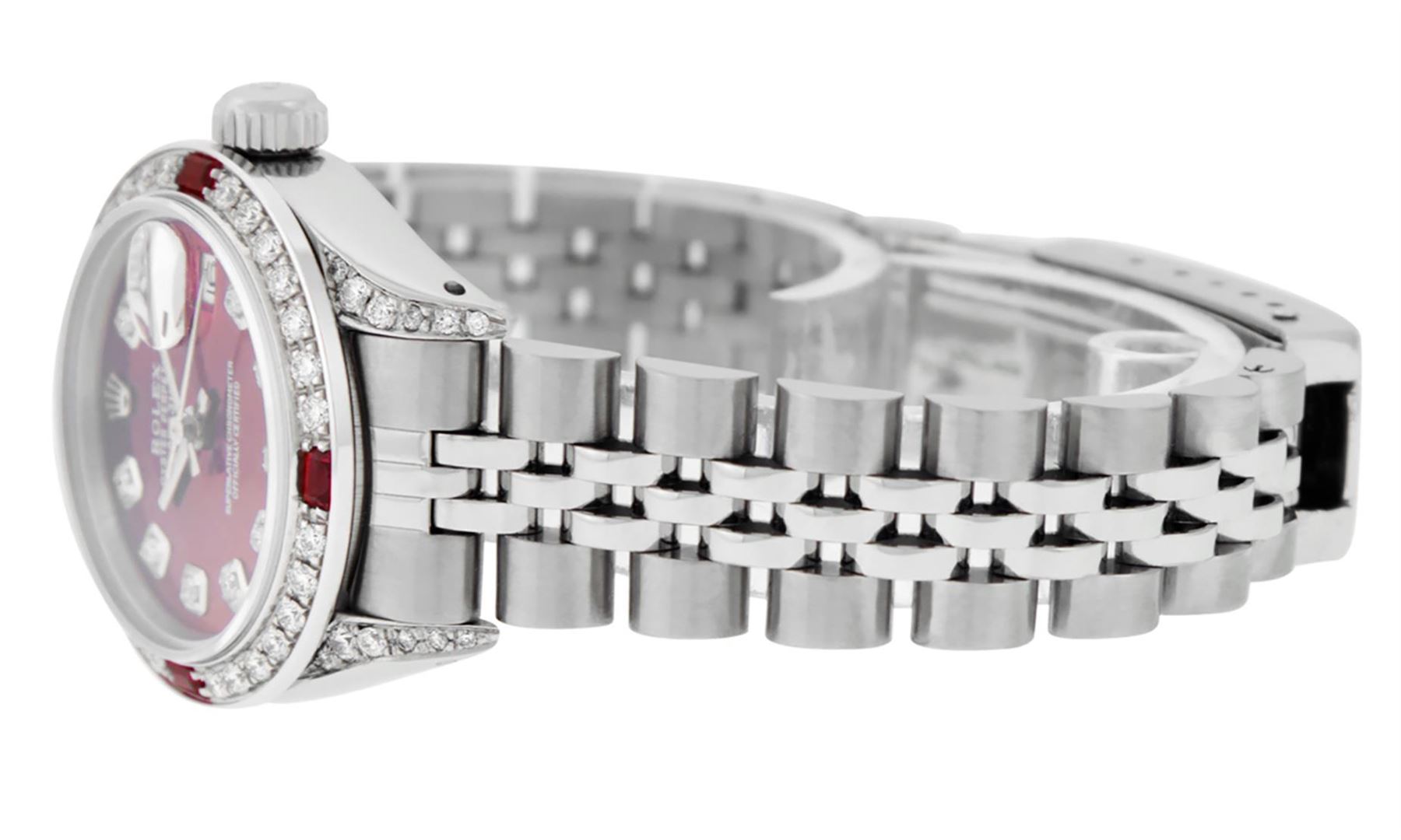 One Ladies Stainless Steel Rolex Datejust Polished Bright with Satin Finish, Serviced & Electronically Tested, Stainless Steel Case: 26mm, Stainless Steel Crown, Diamond Lugs: 24 Diamonds On Lugs, Clarity: SI-VS, Color: G to H. Custom Bezel: New 18K White Gold Diamond & Ruby Beadset Bezel, Diamond Count: 28 Diamonds + 4 Rubies, Total Weight .70 Carat, Clarity: SI-VS, Color: G to H. Custom Crystal: New Scratch Resistant Synthetic Sapphire Cyclops Lens. Custom Hands: New Luminescent Hands. Movement: Automatic Winding Movement. Custom Dial: Refinished Red Diamond Dial, Diamond Count: 10 Diamonds in Dial, G To H In Color, Clarity: SI-VS. Date Window: 3 O'clock Position Date Display, Model: Datejust Condition: G-6 Extra Fine. Bracelet: Stainless Steel Jubilee. Bright Polish & Satin Finish. 6.0 Inch Length, Adjustable. Standard Clasp, With Rolex Logo. This Watch Has Been Serviced Time Tested And Is In Excellent Condition It Is Free Of All Scratches And Dents.