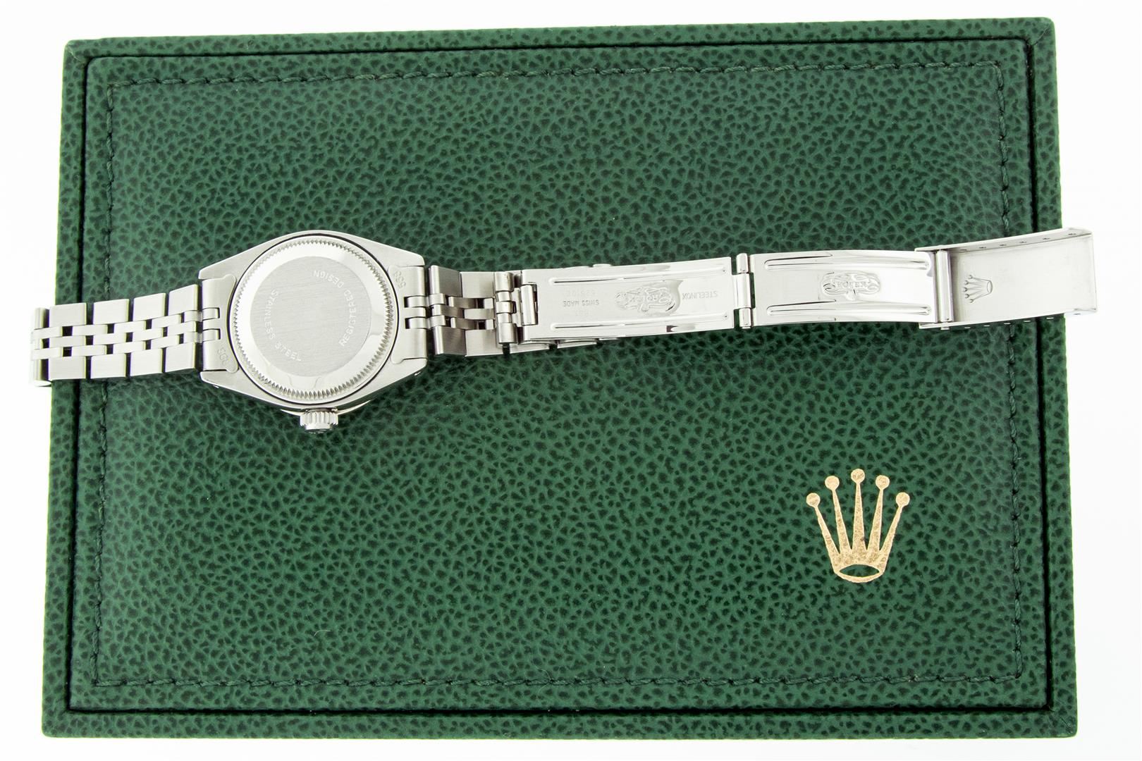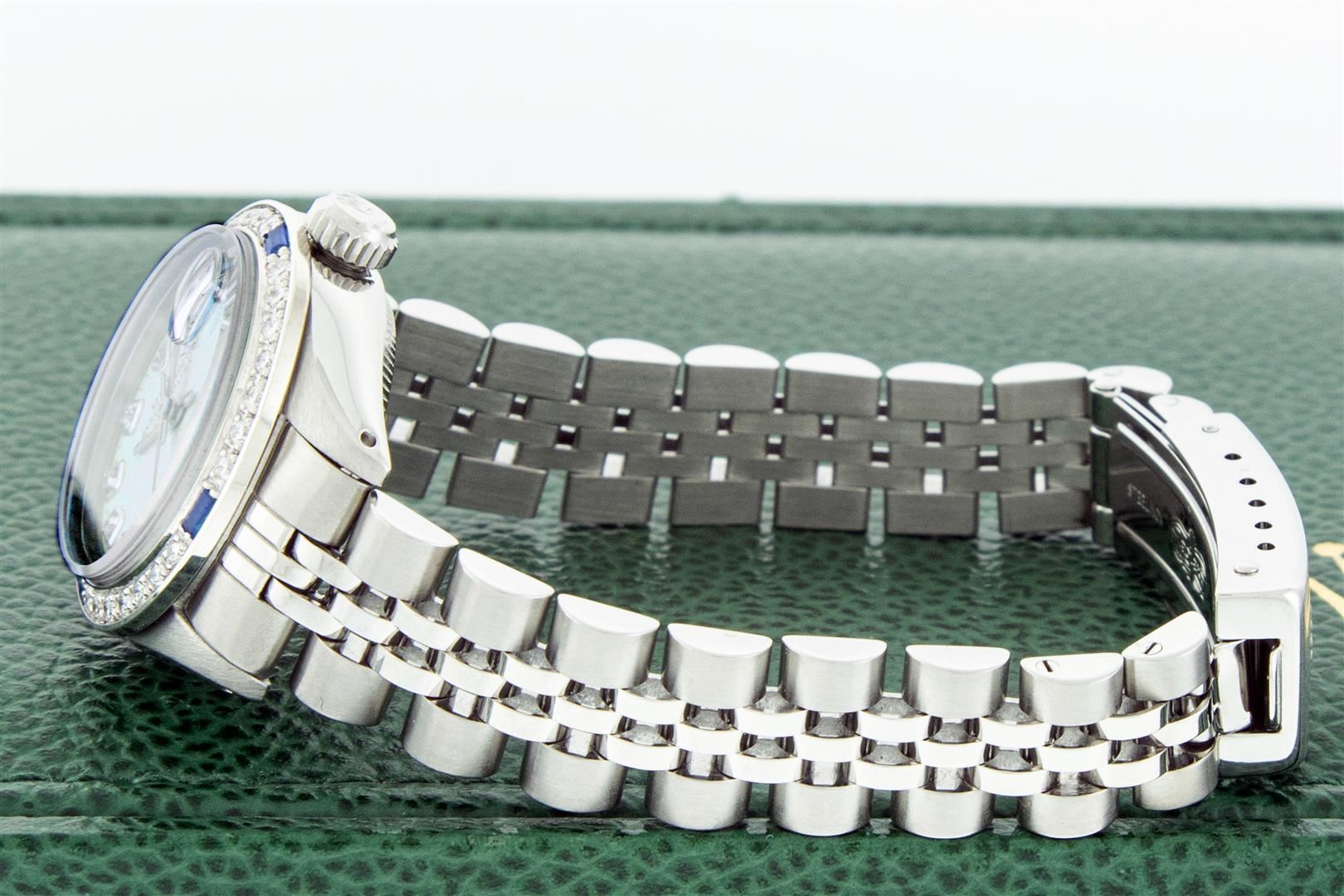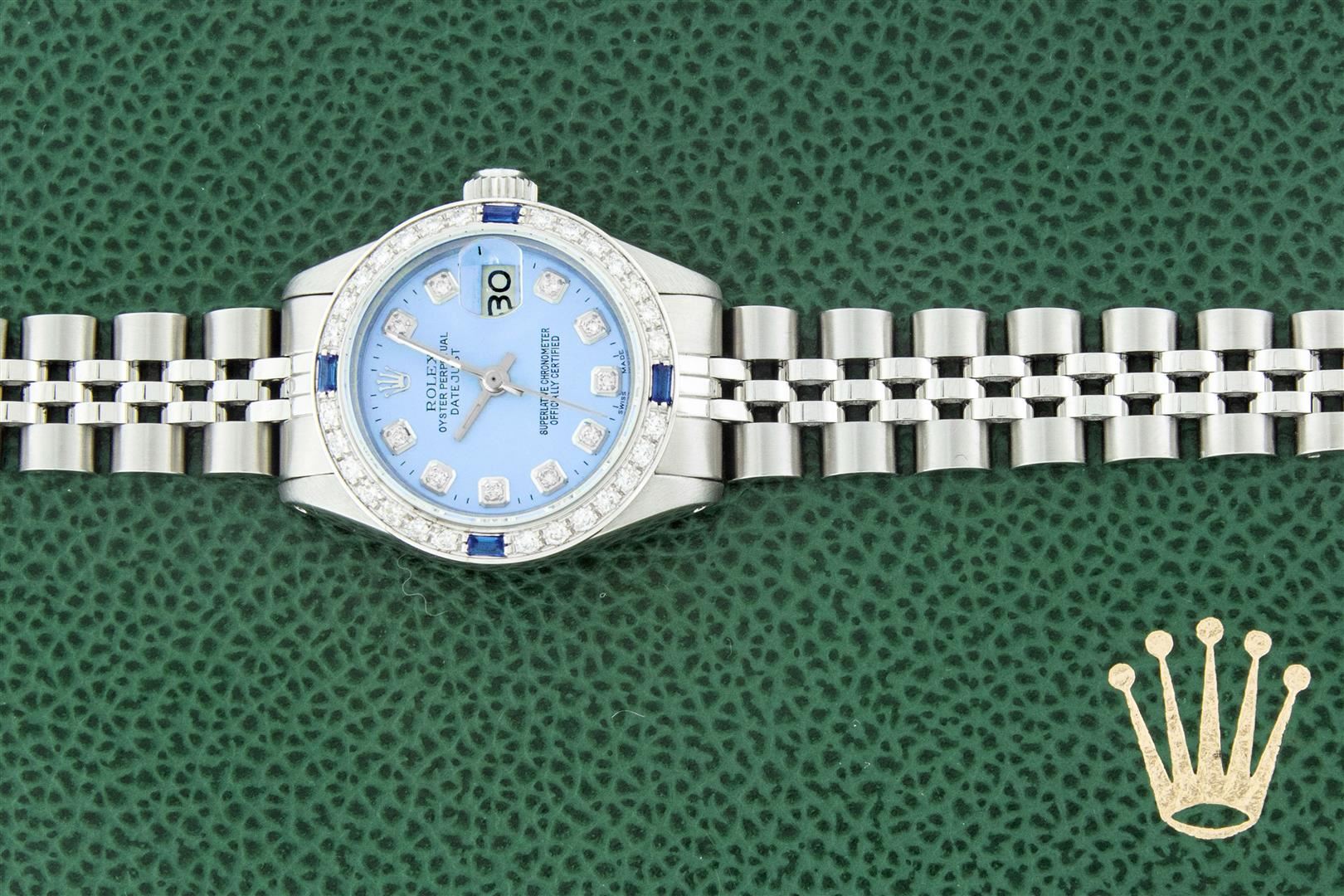 One Ladies Stainless Steel Rolex Datejust Polished Bright with Satin Finish, Serviced & Electronically Tested, Rolex Stainless Steel Case: 26mm, Rolex Stainless Steel Crown, Custom Bezel: New 18K White Gold Sapphire Beadset Diamond Bezel, Diamond + Gem Count: 28 Diamonds + 4 Sapphires, Clarity: SI-VS, Color: G to H. Custom Crystal: New Sapphire with Magnified Date Window. Custom Hands: New Luminescent Hands. Rolex Movement: Automatic Winding Movement. Custom Dial: Refinished To Blue with Added Diamond Hour Markers. Diamond Count: 10 Diamonds In Dial, Clarity: SI-VS, Color: G to H. Date Window: 3 O'Clock Position Date Display, Model: Datejust. Condition: G-6 Extra Fine. Rolex Bracelet: Stainless Steel Jubilee Band. Bright Polish & Satin Finish. 6.0 Inch Length, Adjustable. Standard Clasp, with Rolex Logo. This Pre Owned Watch Has Been Serviced Time Tested And Is In Excellent Condition It Is Free Of All Scratches And Dents. This Watch Comes with A Rolex Box.