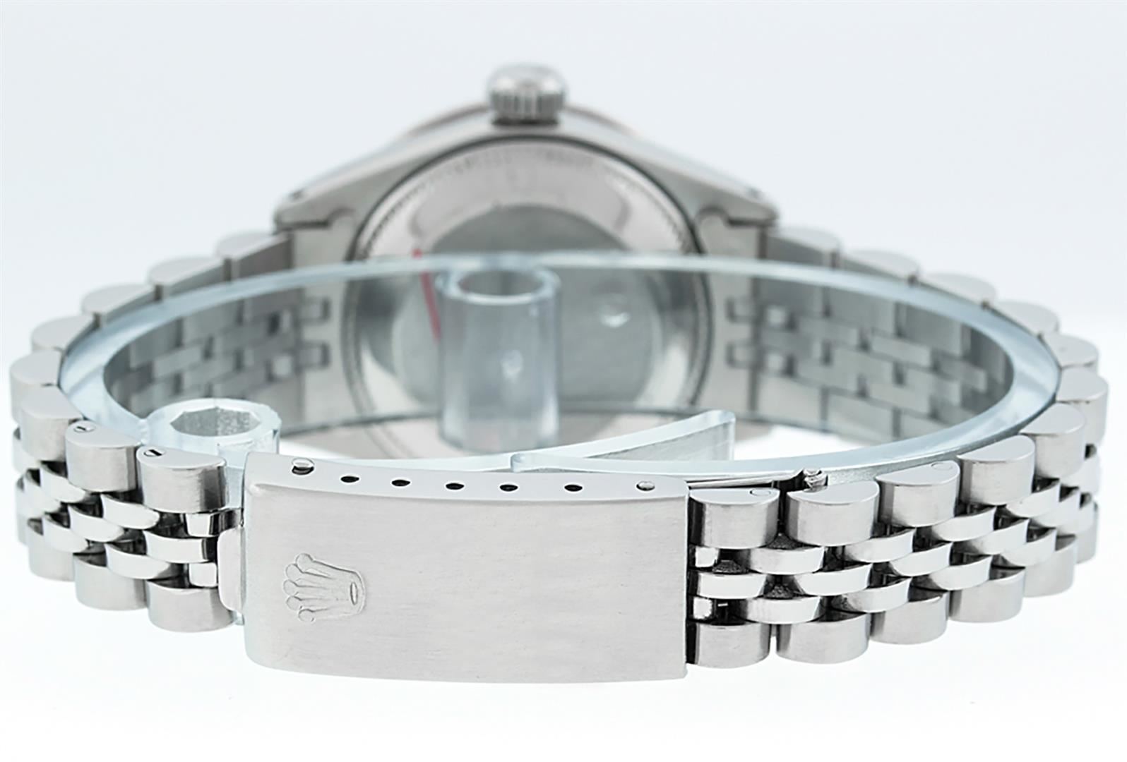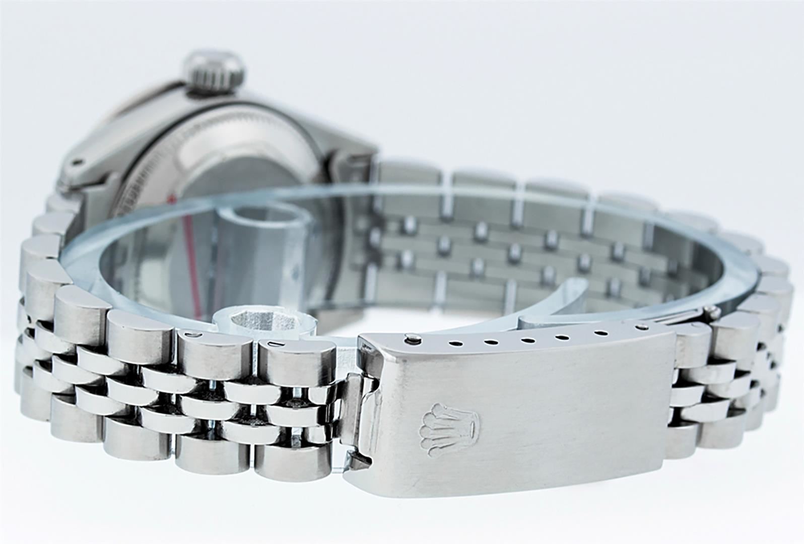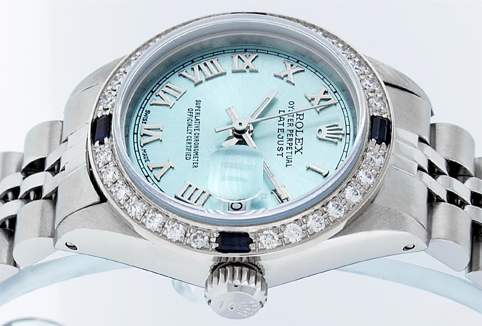 One Ladies Stainless Steel Rolex Datejust Polished Bright with Satin Finish, Serviced & Electronically Tested, Stainless Steel Case: 26mm, Stainless Steel Crown, Custom Bezel: New 18K White Gold Sapphire Beadset Diamond Bezel, Diamond + Gem Count: 28 Diamonds + 4 Sapphires, Total Weight .70 Carat, Clarity: SI-VS, Color: G to H. Custom Crystal: New Synthetic Sapphire Cyclops Lens. Custom Hands: New Luminescent Hands. Movement: Automatic Winding Movement. Custom Dial: Ice Blue Roman Dial. Date Window: 3 O'clock Position Date Display, Model: Datejust. Condition: G-6 Extra Fine. Bracelet: Stainless Steel Jubilee. Bright Polish & Satin Finish. 6.0 Inch Length, Adjustable. Standard Clasp, With Rolex Logo. This Watch Has Been Serviced Time Tested And Is In Excellent Condition It Is Free Of All Scratches And Dents.