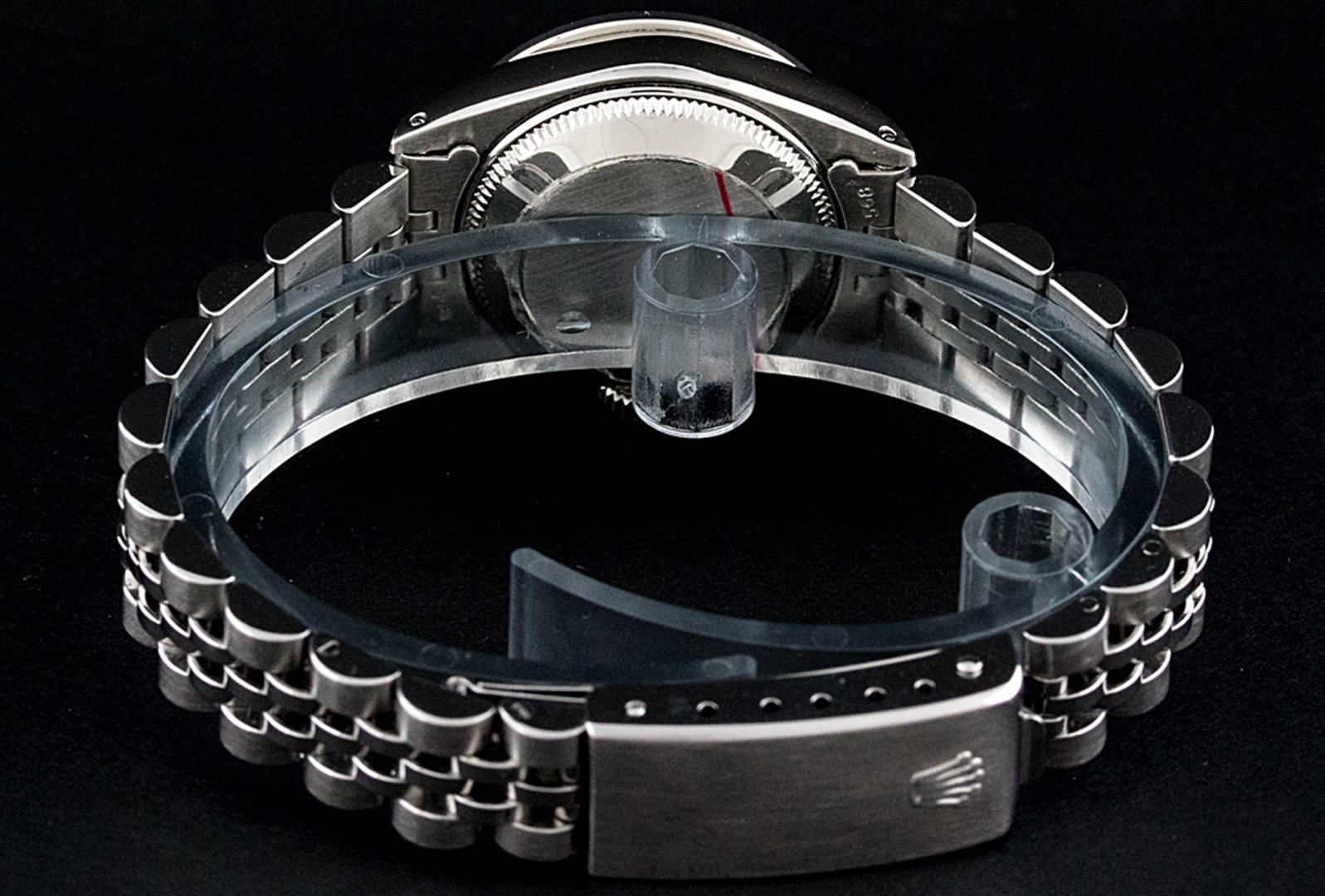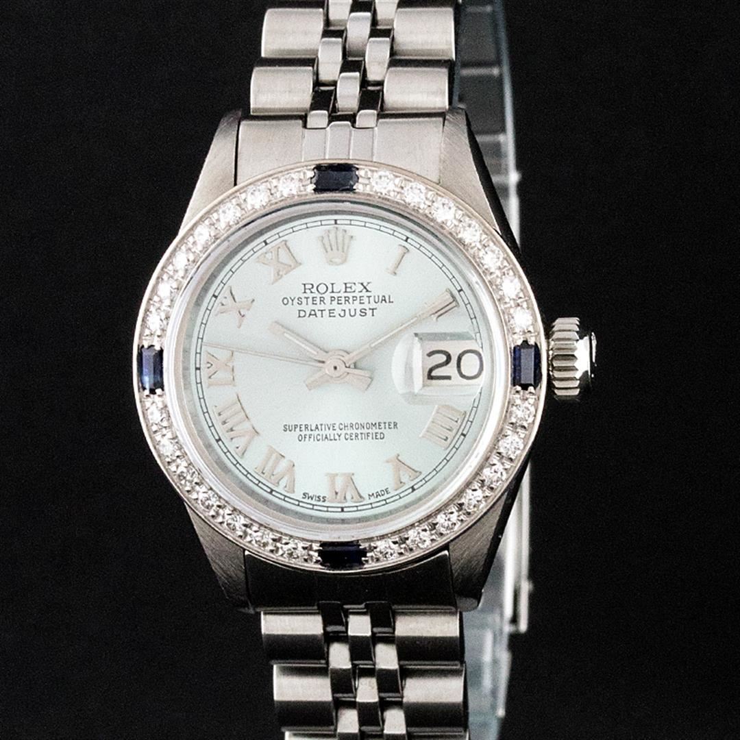 One Ladies Stainless Steel Rolex Datejust Polished Bright with Satin Finish, Serviced & Electronically Tested, Stainless Steel Case: 26mm, Stainless Steel Crown, Custom Bezel: New 18K White Gold Sapphire Beadset Diamond Bezel, Diamond + Gem Count: 28 Diamonds + 4 Sapphires, Total Weight .70 Carat, Clarity: SI-VS, Color: G to H. Custom Crystal: New Synthetic Sapphire Cyclops Lens. Custom Hands: New Luminescent Hands. Movement: Automatic Winding Movement. Custom Dial: Ice Blue Roman Dial. Date Window: 3 O'clock Position Date Display, Model: Datejust. Condition: G-6 Extra Fine. Bracelet: Stainless Steel Jubilee. Bright Polish & Satin Finish. 6.0 Inch Length, Adjustable. Standard Clasp, With Rolex Logo. This Watch Has Been Serviced Time Tested And Is In Excellent Condition It Is Free Of All Scratches And Dents.