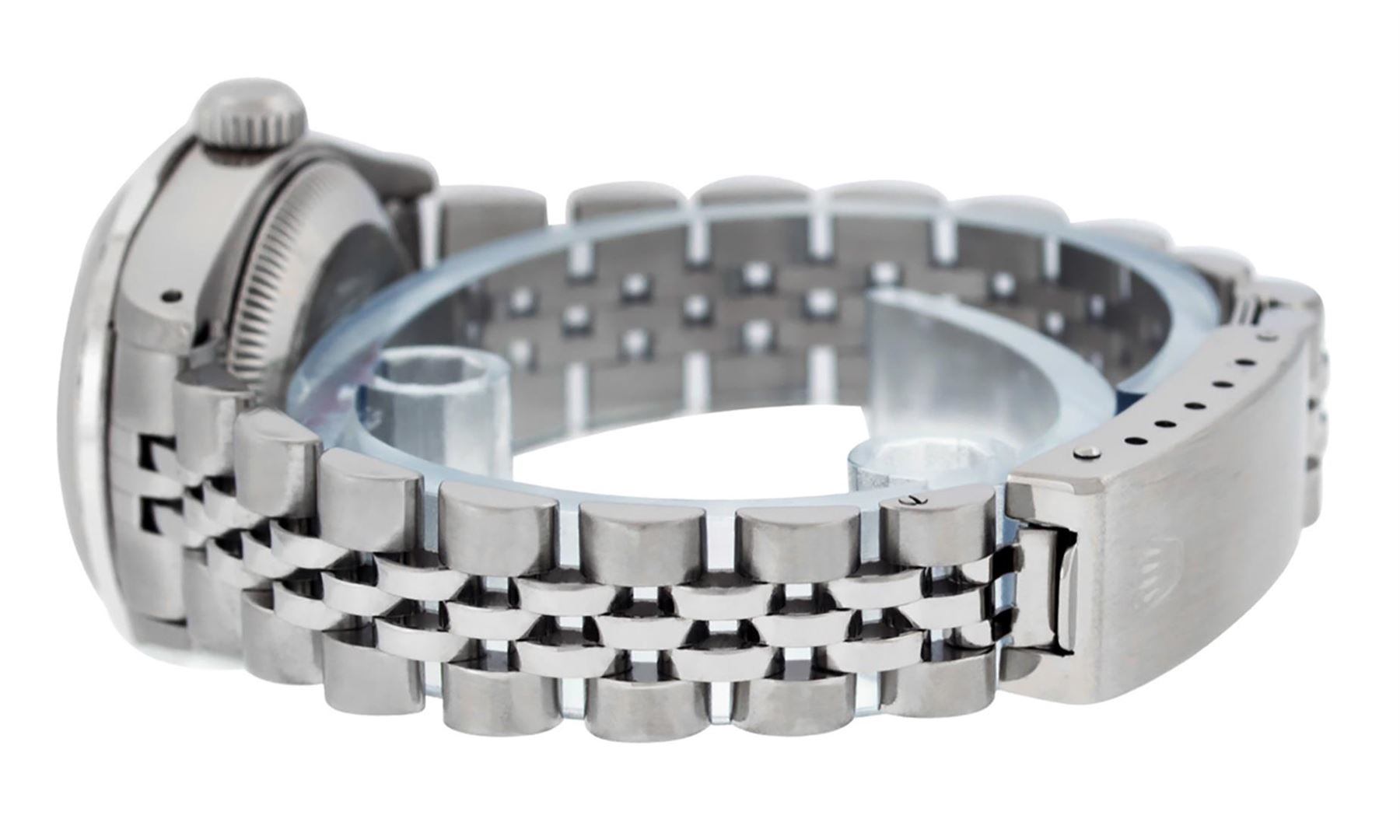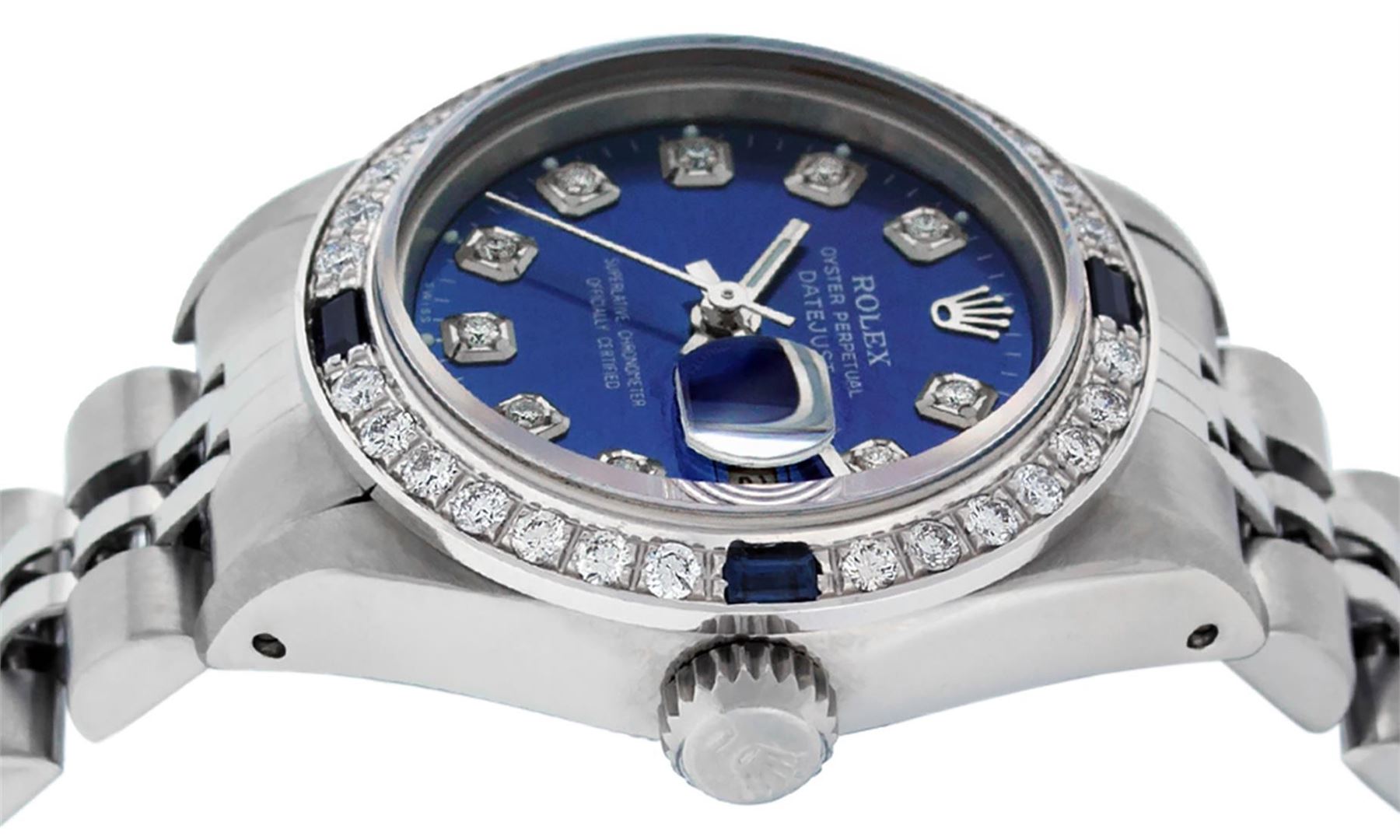 One Ladies Stainless Steel Rolex Oyster Perpetual Datejust Polished Bright with Satin Finish, Serviced & Electronically Tested, Stainless Steel Case: 26mm, Stainless Steel Crown, Custom Bezel: New 18K White Gold Sapphire Beadset Diamond Bezel, Diamond + Gem Count: 28 Diamonds + 4 Sapphires Total Weight .70 Carat, Clarity: SI-VS, Color: G to H. Custom Crystal: New Synthetic Sapphire Cyclops Lens. Custom Hands: New Luminescent Hands. Movement: Automatic Winding Movement. Custom Dial: Refinished Blue With Diamond Hour Markers, 10 Diamond in Dial G To H In Color, Clarity: SI-VS. Date Window: 3 O'clock Position Date Display, Model: Datejust. Condition: G-6 Extra Fine. Bracelet: Stainless Steel Jubilee. Bright Polish & Satin Finish. 6.0 Inch Length, Adjustable. Standard Clasp, With Rolex Logo. This Watch Has Been Serviced Time Tested And Is In Excellent Condition It Is Free Of All Scratches And Dents.