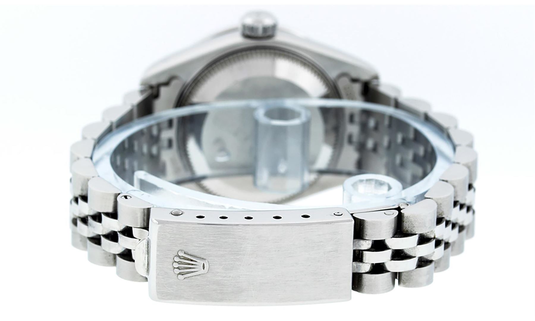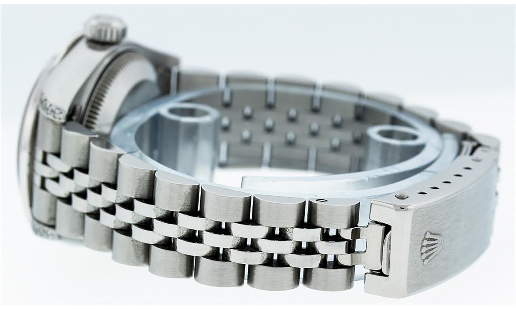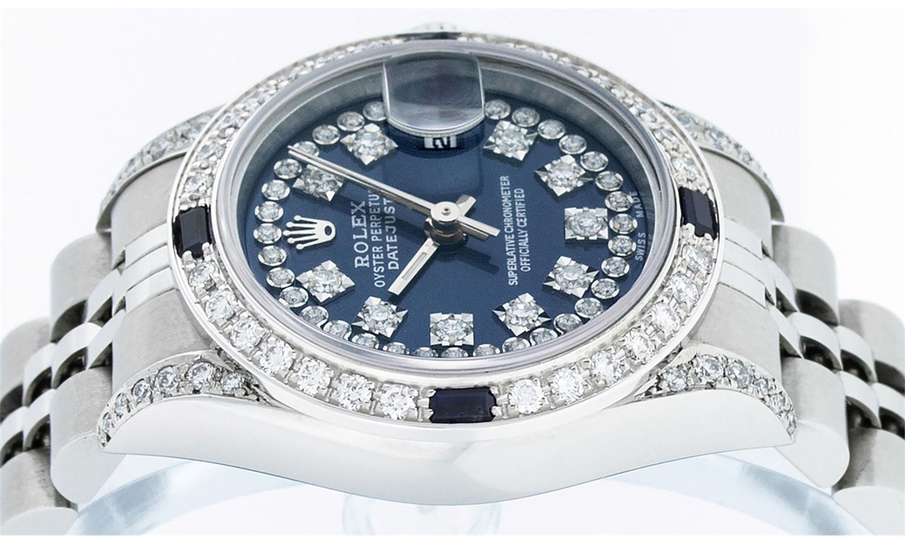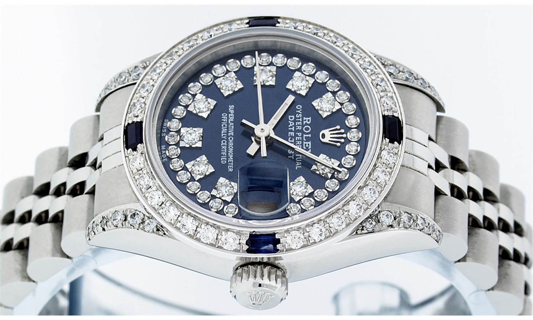 One Quickset Ladies Stainless Steel Sapphire Rolex Datejust Polished Bright with Satin Finish, Serviced & Electronically Tested, Stainless Steel Case: 26mm, Stainless Steel Crown, Custom Diamond Lugs: 24 Diamonds On Lugs, Clarity: SI-VS, Color: G to H. Custom Bezel: New 18K White Gold Diamond + Sapphire Beadset Diamond Bezel, Stone Count: 28 Diamonds + 4 Sapphires, Total Weight .70 Carat, Clarity: SI-VS, Color: G to H. Custom Crystal: New Scratch Resistant Synthetic Sapphire Cyclops Lens. Custom Hands: New Luminescent Hands. Movement: Automatic Winding Movement. Custom Dial: Refinished Single Cut Blue String Diamond Dial, 43 Diamonds in Dial G To H In Color, Clarity: VS. Date Window: 3 O'Clock Position Date Display, Model: Quickset Caliber 2230 Datejust. Condition: G-6 Extra Fine. Bracelet: Stainless Steel Jubilee Band. Bright Polish & Satin Finish. 6.0 Inch Length, Adjustable. Standard Clasp, With Rolex Logo. This Watch Has Been Serviced Time Tested And Is In Excellent Condition It Is Free Of All Scratches And Dents.