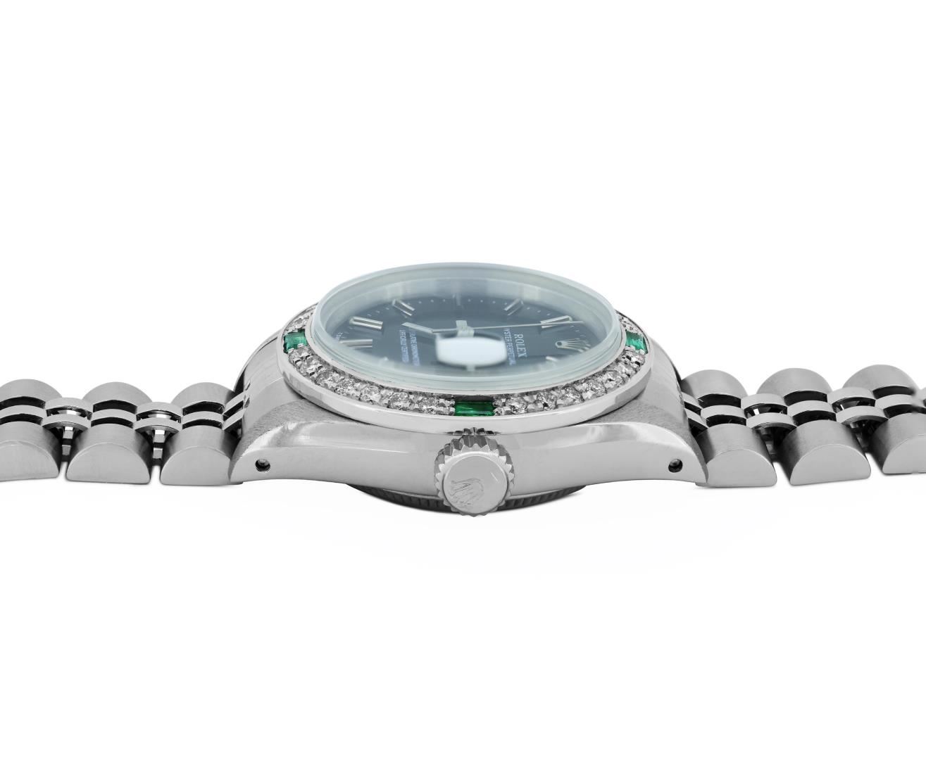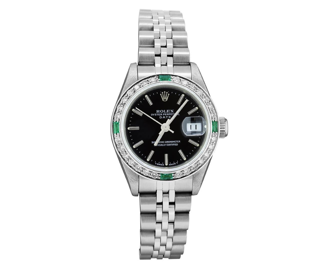 One Rolex Ladies Quickset Pre Owned Stainless Steel Date Wristwatch Polished Bright with Satin Finish, Serviced & Electronically Tested, Stainless Steel Case: 26mm, Stainless Steel Crown, Custom Bezel: New 18K White Gold Emerald Beadset Diamond Bezel, Diamond + Gem Count: 36 Diamonds + 4 Emeralds, Clarity: SI-VS, Color: G to H. Custom Crystal: New Sapphire With Magnified Date Window. Custom Hands: New Luminescent Hands. Rolex Movement: 2135 Automatic Winding Movement. Rolex Dial: Factory Black Dial With Index Hour Markers And Lumi Dots. Date Window: 3 O'Clock Position Date Display, Model: Quickset Datejust. Condition: G-6 Extra Fine. Rolex Bracelet: Stainless Steel Jubilee Band. Bright Polish & Satin Finish. 6.0 Inch Length, Adjustable. Standard Clasp, With Rolex Logo. This Watch Has Been Serviced And Time Tested. It Is In Excellent Condition, Free Of All Scratches And Dents. This Watch Comes With A Rolex Box.
