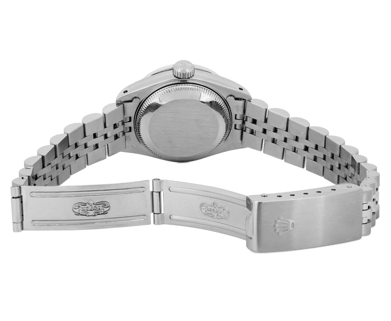 One Rolex Ladies Quickset Pre Owned Stainless Steel Date Wristwatch Polished Bright with Satin Finish, Serviced & Electronically Tested, Stainless Steel Case: 26mm, Stainless Steel Crown, Custom Bezel: New 18K White Gold Emerald Beadset Diamond Bezel, Diamond + Gem Count: 36 Diamonds + 4 Emeralds, Clarity: SI-VS, Color: G to H. Custom Crystal: New Sapphire With Magnified Date Window. Custom Hands: New Luminescent Hands. Rolex Movement: 2135 Automatic Winding Movement. Rolex Dial: Factory Black Dial With Index Hour Markers And Lumi Dots. Date Window: 3 O'Clock Position Date Display, Model: Quickset Datejust. Condition: G-6 Extra Fine. Rolex Bracelet: Stainless Steel Jubilee Band. Bright Polish & Satin Finish. 6.0 Inch Length, Adjustable. Standard Clasp, With Rolex Logo. This Watch Has Been Serviced And Time Tested. It Is In Excellent Condition, Free Of All Scratches And Dents. This Watch Comes With A Rolex Box.