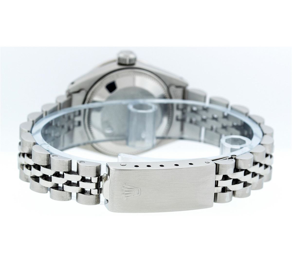 Ladies Rolex Datejust Polished Bright with Satin Finish, Serviced & Electronically Tested, Stainless Steel Case:26mm, Stainless Steel Crown, Custom Bezel: 18K White Gold Emerald Beadset Diamond Bezel, Diamond + Gem Count: 28 Diamonds + 4 Emerald. Total Weight .70 Carat, Clarity: SI-VS, Color: G to H. Custom Crystal: Synthetic Sapphire Cyclops Lens. Movement: Automatic Winding Movement Caliber 2030. Custom Dial: Refinished Pink With Diamond Hour Markers. Diamond Count: 10 Diamonds, Color: G To H, Clarity: SI-VS. Date Window: 3 O'Clock Position Date Display, Model: Datejust. Condition: G-6 Extra Fine. Bracelet: Stainless Steel Jubilee. Bright Polish & Satin Finish. 6.0 Inch Length, Adjustable. Standard Clasp, With Rolex Logo.