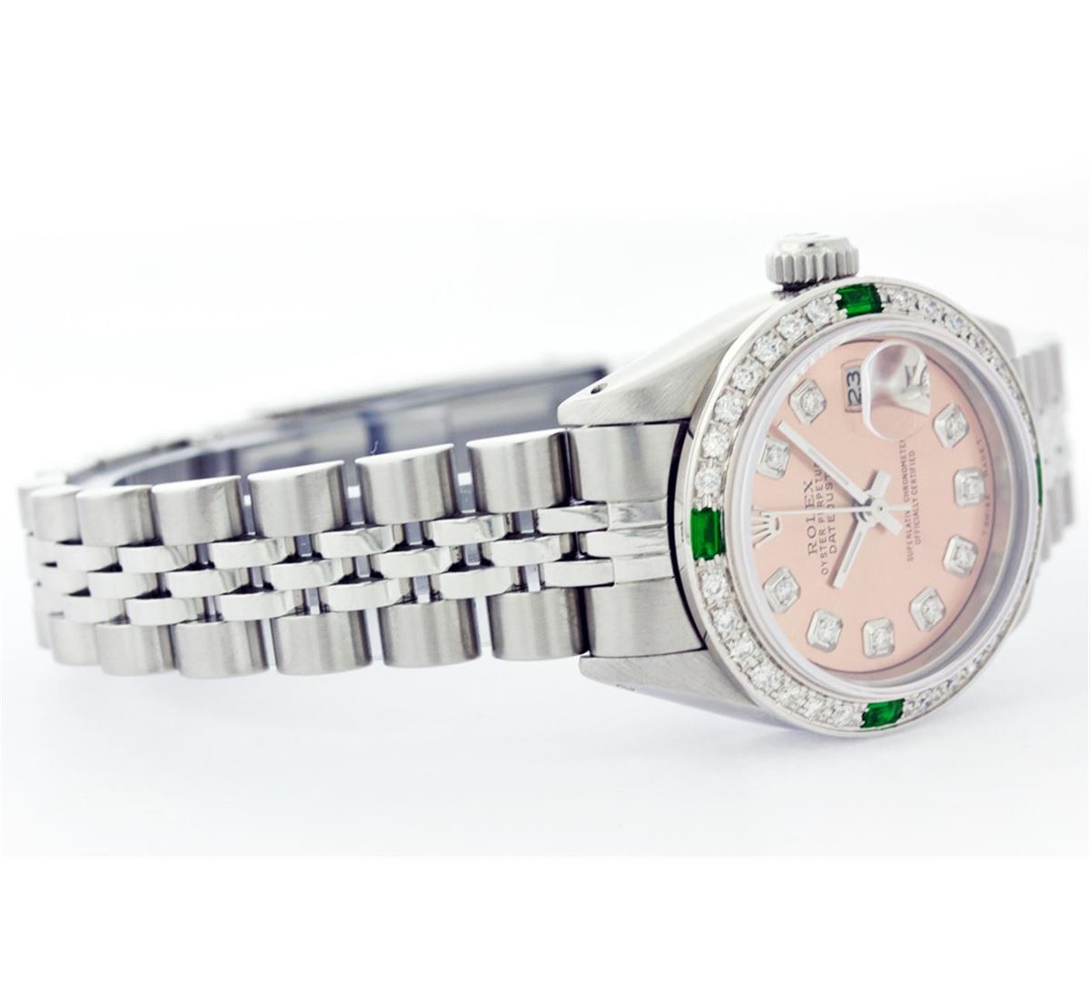 One Womens Rolex Datejust Polished Bright with Satin Finish, Serviced & Electronically Tested, Stainless Steel Case:26mm, Stainless Steel Crown, Custom Bezel: 18K White Gold Emerald Beadset Diamond Bezel, Diamond + Gem Count: 28 Diamonds + 4 Emeralds Total Weight .70 Carat, Clarity: SI-VS, Color: G to H. Custom Crystal: Synthetic Sapphire Cyclops Lens. Movement: Automatic Winding Movement Caliber 2135. Custom Dial: Ice Salmon Diamond Dial, Diamond Count: 10 Diamonds, Clarity: SI-VS, Color:G to H. Date Window: 3 O'Clock Position Date Display, Quickset, Model: Datejust, Condition: G-6 Extra Fine. Bracelet:Stainless Steel Jubilee. Bright Polish & Satin Finish. 5.5 Inch Length, Adjustable. Standard Clasp, With Rolex Logo.