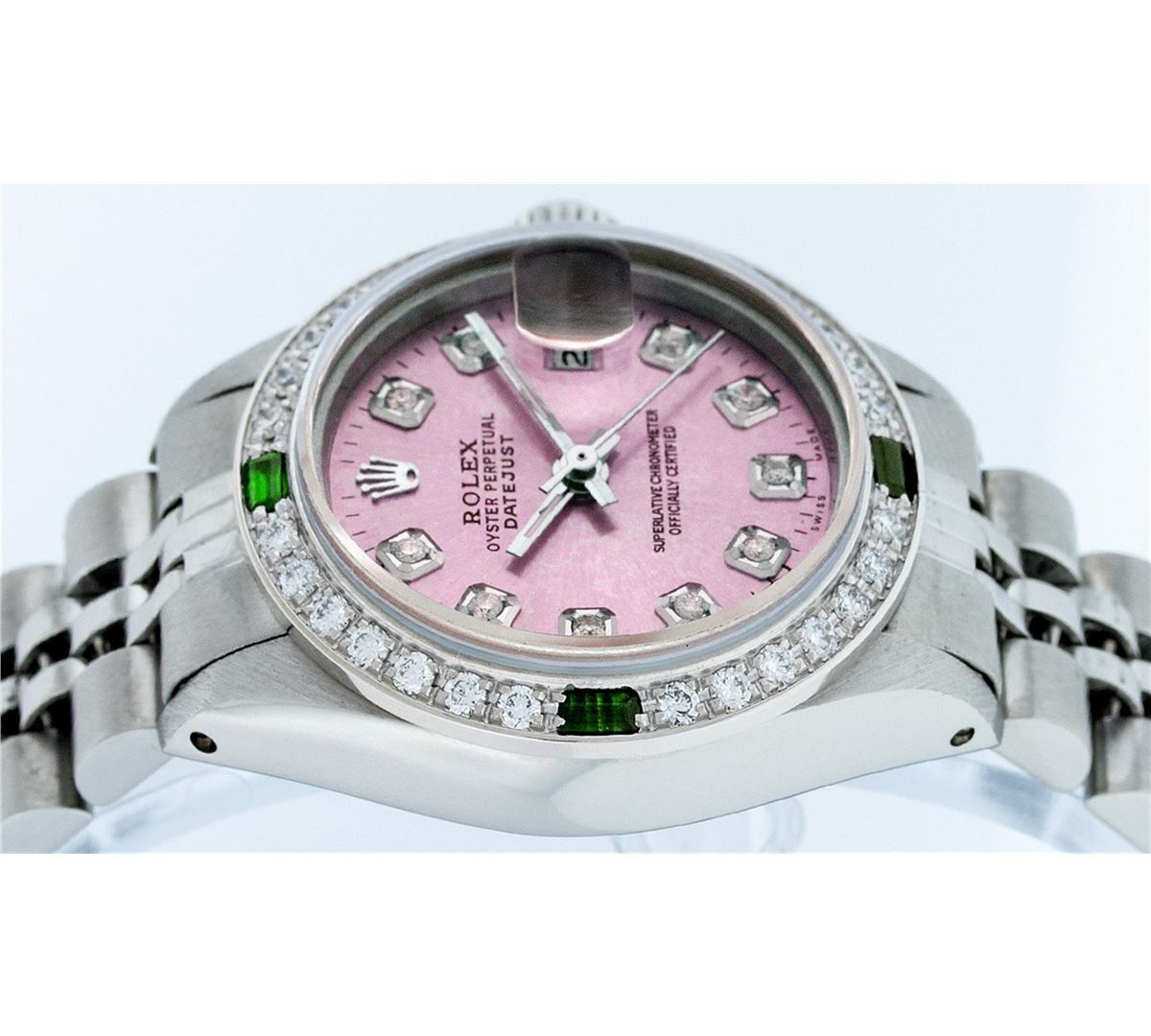 Ladies Rolex Datejust Polished Bright with Satin Finish, Serviced & Electronically Tested, Stainless Steel Case:26mm, Stainless Steel Crown, Custom Bezel: 18K White Gold Emerald Beadset Diamond Bezel, Diamond + Gem Count: 28 Diamonds + 4 Emerald. Total Weight .70 Carat, Clarity: SI-VS, Color: G to H. Custom Crystal: Synthetic Sapphire Cyclops Lens. Movement: Automatic Winding Movement Caliber 2030. Custom Dial: Refinished Pink With Diamond Hour Markers. Diamond Count: 10 Diamonds, Color: G To H, Clarity: SI-VS. Date Window: 3 O'Clock Position Date Display, Model: Datejust. Condition: G-6 Extra Fine. Bracelet: Stainless Steel Jubilee. Bright Polish & Satin Finish. 6.0 Inch Length, Adjustable. Standard Clasp, With Rolex Logo.