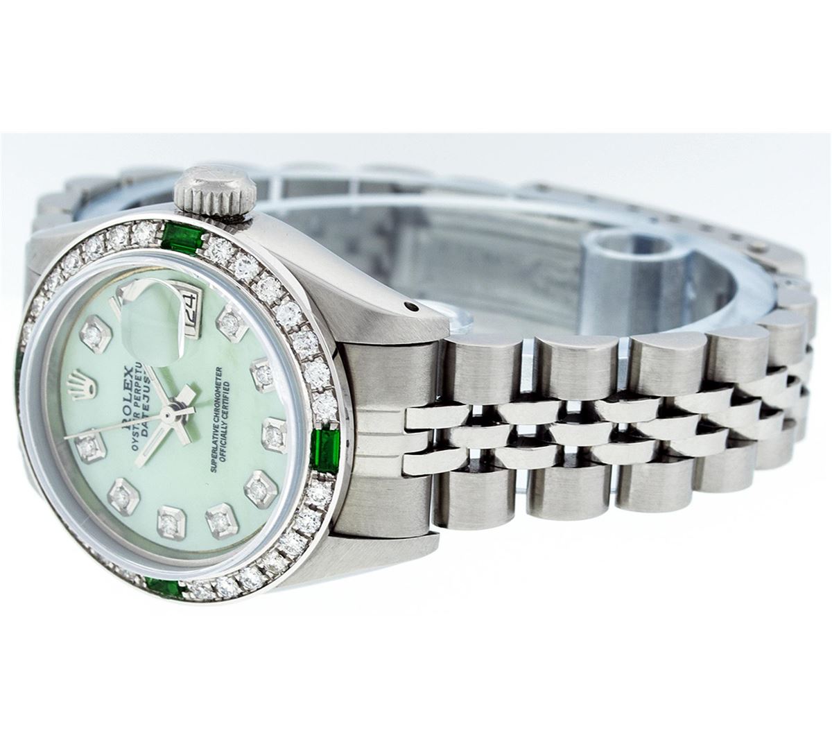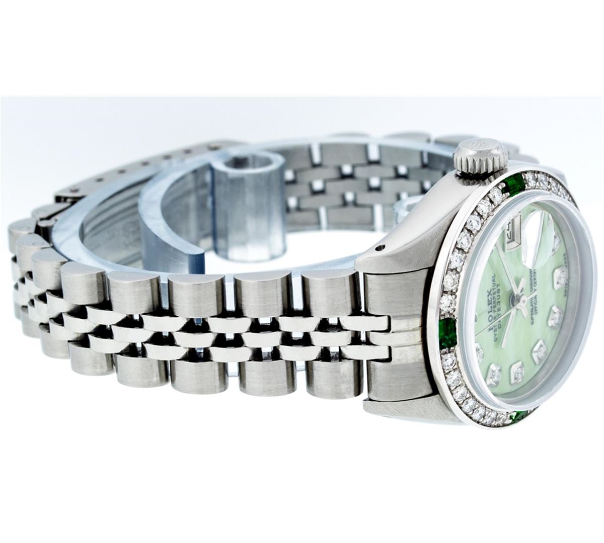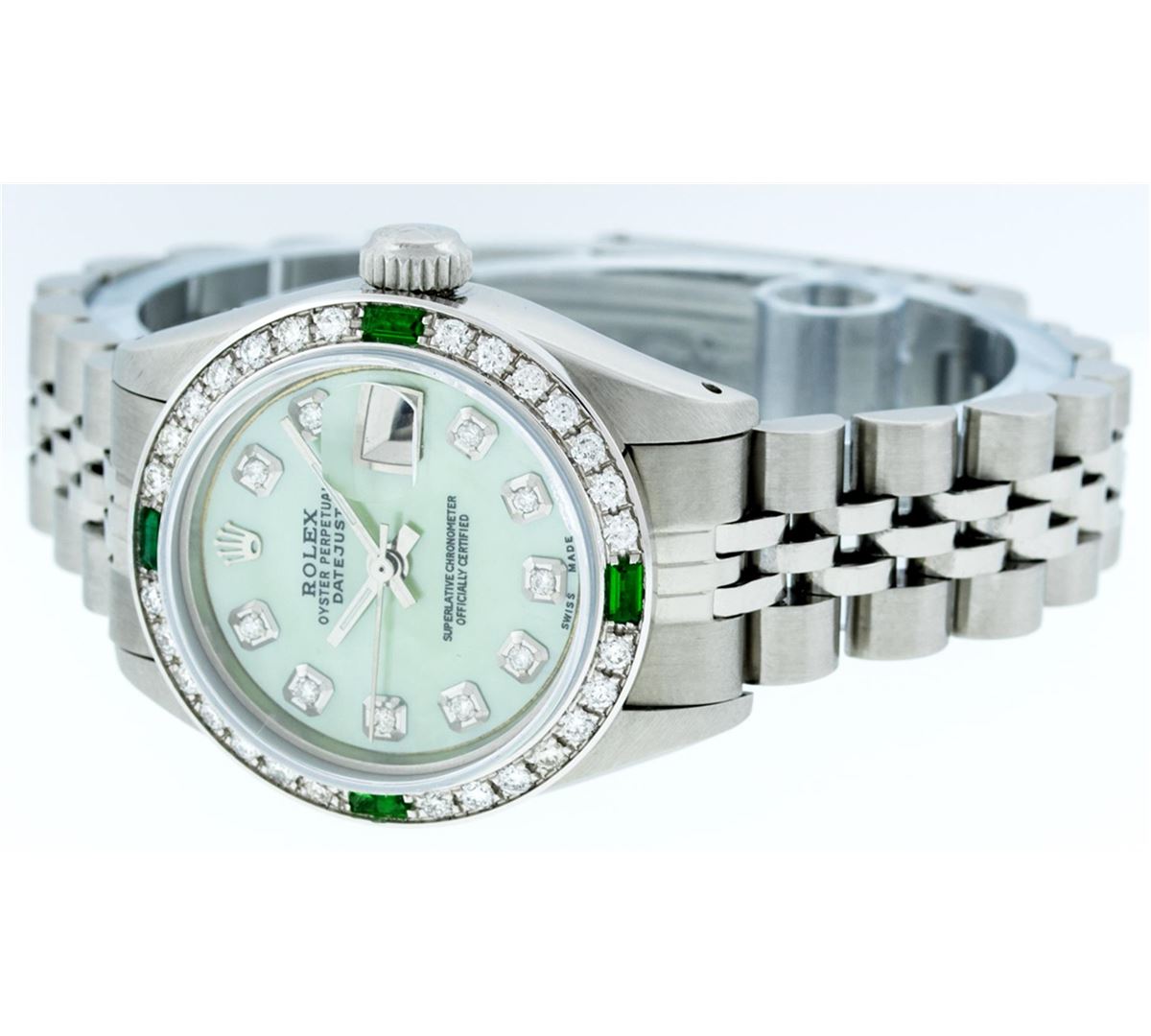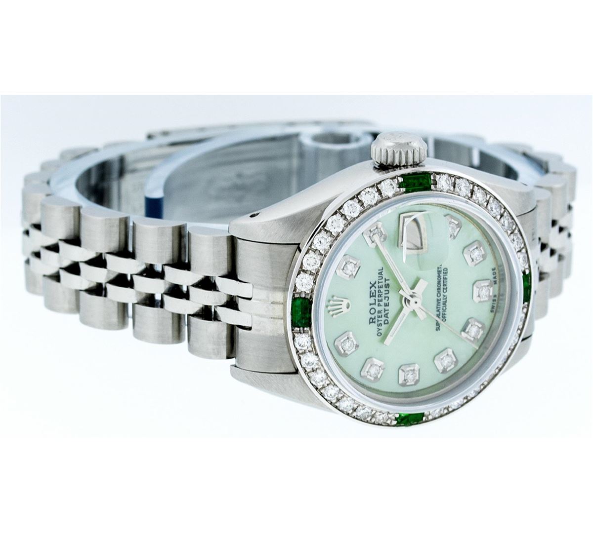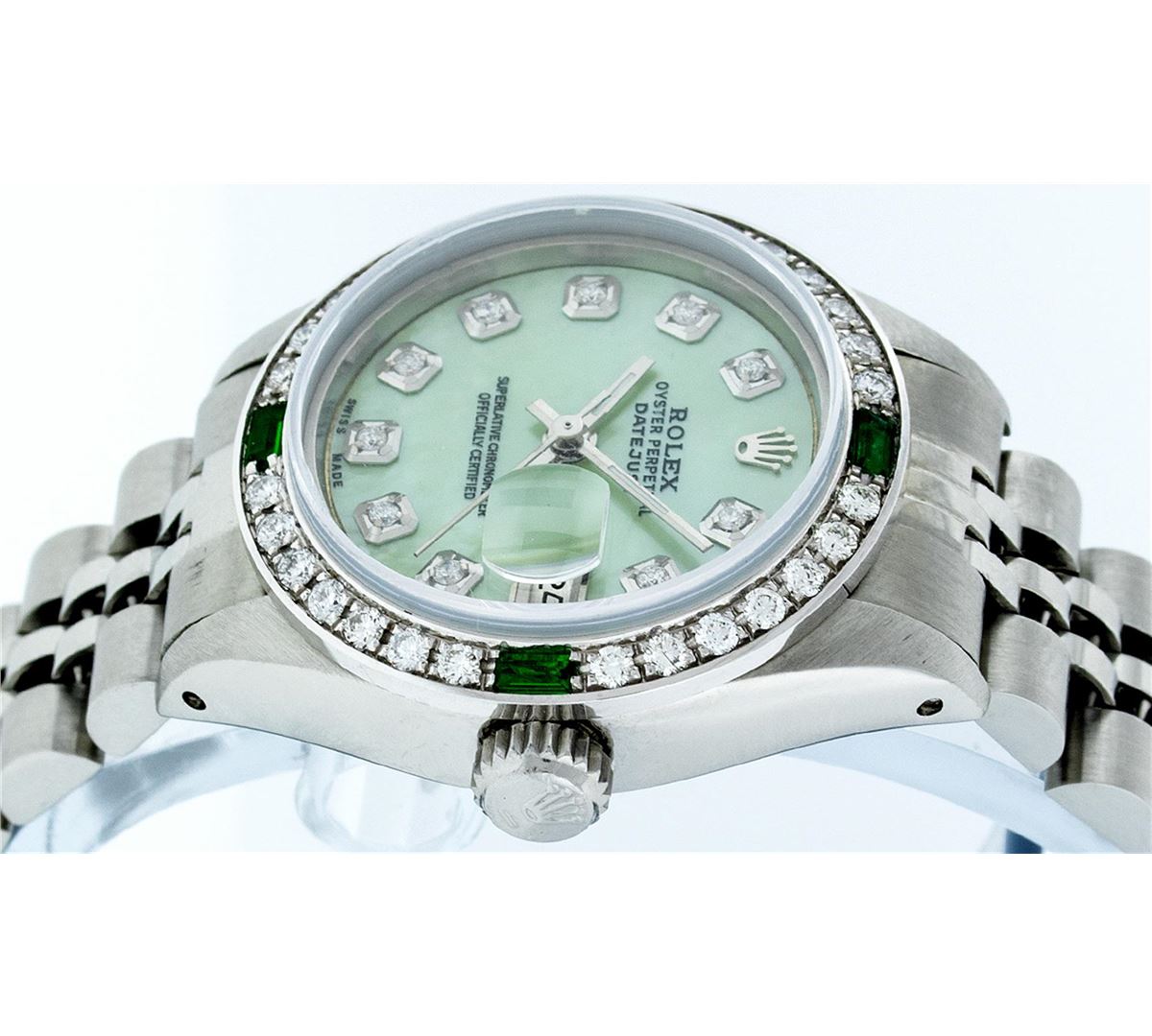 Ladies Rolex Datejust Polished Bright with Satin Finish, Serviced & Electronically Tested, Stainless Steel Case:26mm, Stainless Steel Crown, Custom Bezel: 18K White Gold Emerald Beadset Diamond Bezel, Diamond + Gem Count: 28 Diamonds + 4 Emeralds Total Weight .70 Carat, Clarity: SI-VS, Color: G to H. Custom Crystal: Synthetic Sapphire Cyclops Lens. Movement: Automatic Winding Movement Caliber 2030. Custom Dial: Refinished Green Mother Of Pearl With Diamond Hour Markers. Date Window: 3 O'Clock Position Date Display, Model: Datejust Condition: G-6 Extra Fine. Bracelet:Stainless Steel Jubilee. Bright Polish & Satin Finish. 6.0 Inch Length, Adjustable. Standard Clasp, With Rolex Logo.