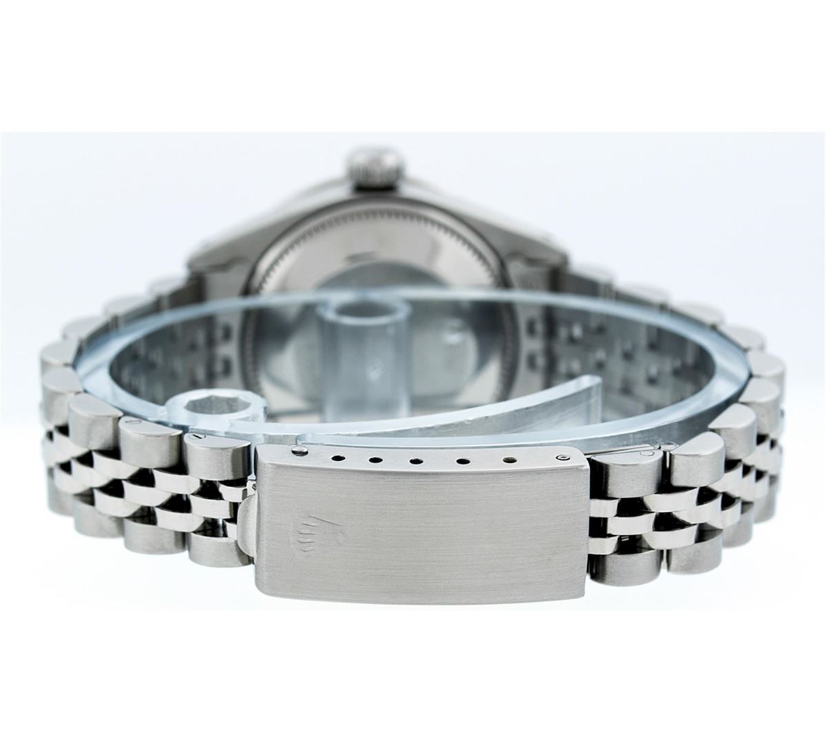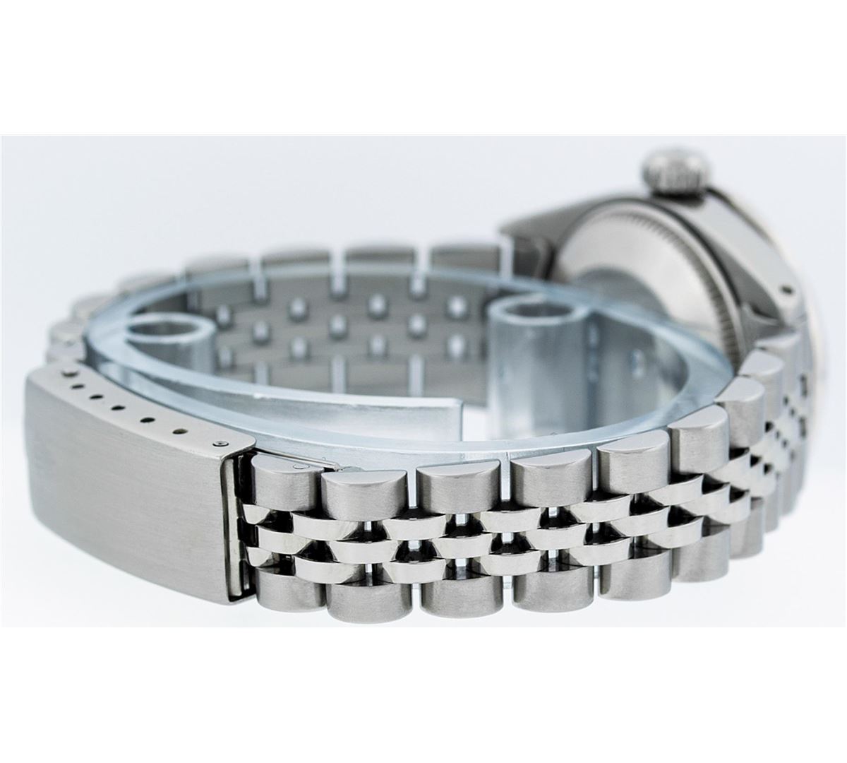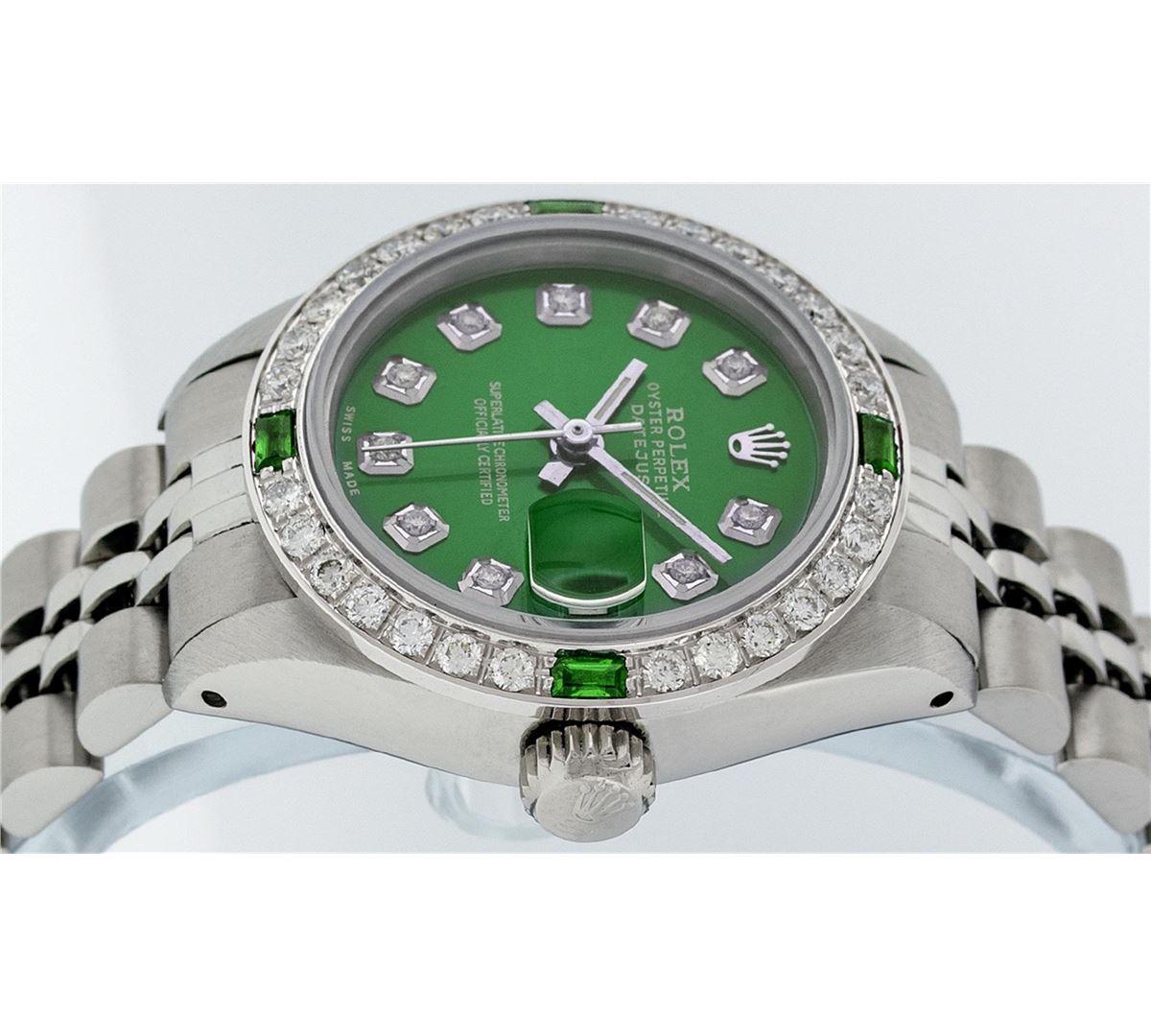 One Ladies Rolex Datejust Polished Bright with Satin Finish, Serviced & Electronically Tested, Stainless Steel Case:26mm, Stainless Steel Crown, Custom Bezel: 18K White Gold Emerald Beadset Diamond Bezel, Diamond + Gem Count: 28 Diamonds + 4 Emeralds Total Weight .70 Carat, Clarity: SI-VS, Color: G to H. Custom Crystal: Synthetic Sapphire Cyclops Lens. Movement: Automatic Winding Movement Caliber 2030. Custom Dial: Refinished Green Diamond Dial. Diamond Count: 10 Diamonds In Dial, Color: G To H, VS SI1. Date Window: 3 O'Clock Position Date Display, Model: Datejust Condition: G-6 Extra Fine. Bracelet:Stainless Steel Jubilee. Bright Polish & Satin Finish. 6.0 Inch Length, Adjustable. Standard Clasp, With Rolex Logo.