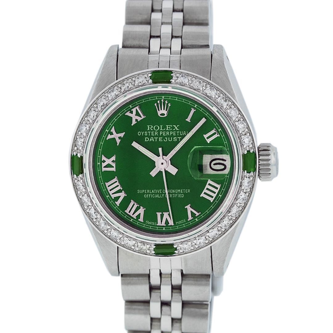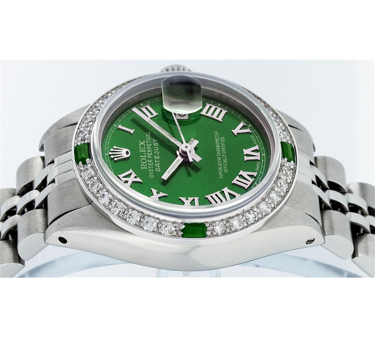 One Ladies Rolex Datejust Polished Bright with Satin Finish, Serviced & Electronically Tested, Stainless Steel Case:26mm, Stainless Steel Crown, Custom Bezel: 18K White Gold Emerald Beadset Diamond Bezel, Diamond + Gem Count: 28 Diamonds + 4 Emeralds Total Weight .70 Carat, Clarity: SI-VS, Color: G to H. Custom Crystal: Synthetic Sapphire Cyclops Lens. Movement: Automatic Winding Movement Caliber 2030. Custom Dial: Refinished Green Roman Dial With Square Track. Date Window: 3 O'Clock Position Date Display, Model: Datejust. Condition: G-6 Extra Fine. Bracelet: Stainless Steel Jubilee. Bright Polish & Satin Finish. 6.0 Inch Length, Adjustable. Standard Clasp, With Rolex Logo.