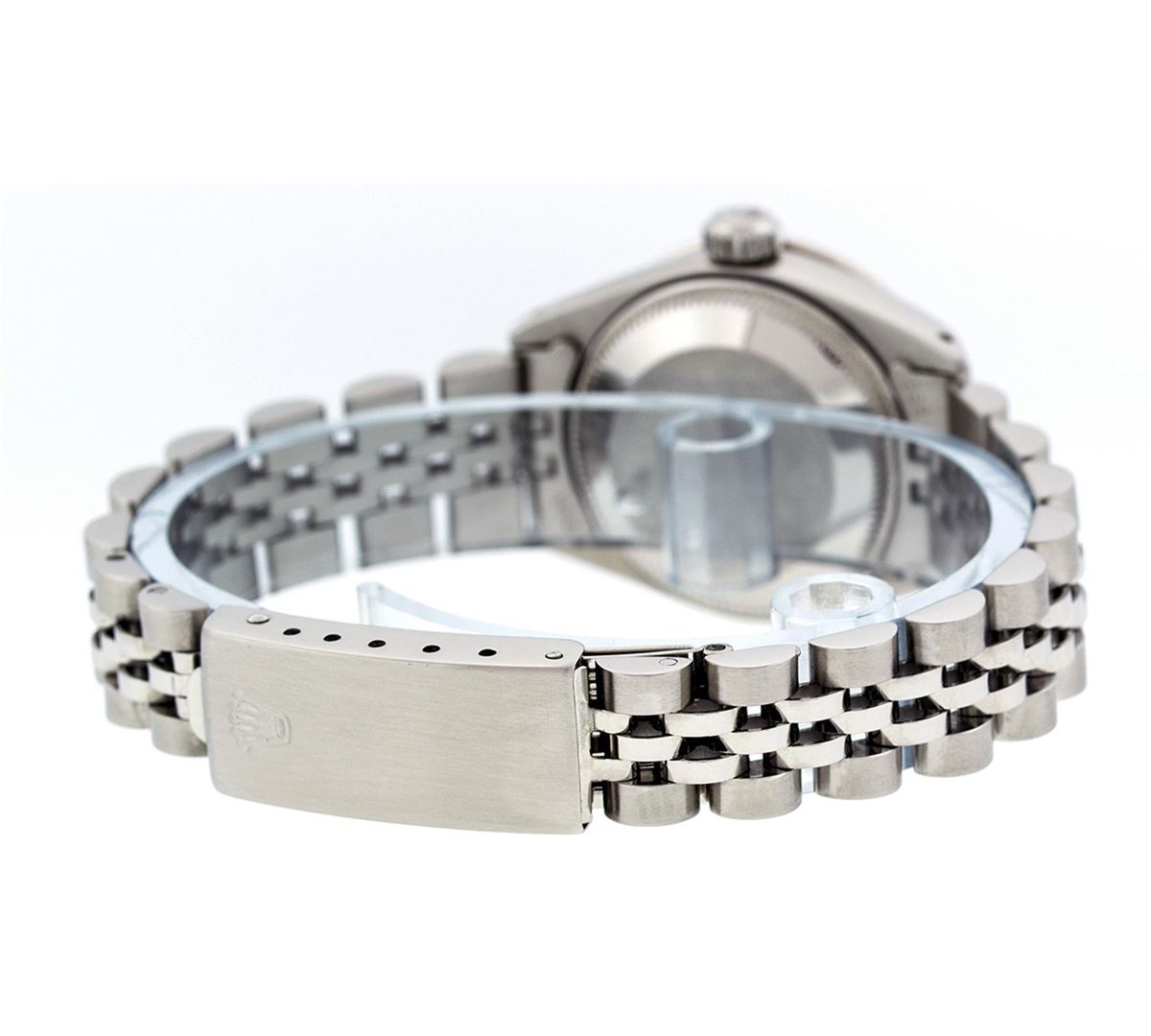 Ladies Rolex Datejust Polished Bright with Satin Finish, Serviced & Electronically Tested, Stainless Steel Case:26mm, Stainless Steel Crown, Custom Bezel: 18K White Gold Emerald Beadset Diamond Bezel, Diamond + Gem Count: 28 Diamonds + 4 Emerald. Total Weight .70 Carat, Clarity: SI-VS, Color: G to H. Custom Crystal: Synthetic Sapphire Cyclops Lens. Movement: Automatic Winding Movement Caliber 2030. Custom Dial: Refinished Pink With Diamond Hour Markers. Diamond Count: 10 Diamonds, Color: G To H, Clarity: SI-VS. Date Window: 3 O'Clock Position Date Display, Model: Datejust. Condition: G-6 Extra Fine. Bracelet: Stainless Steel Jubilee. Bright Polish & Satin Finish. 6.0 Inch Length, Adjustable. Standard Clasp, With Rolex Logo.