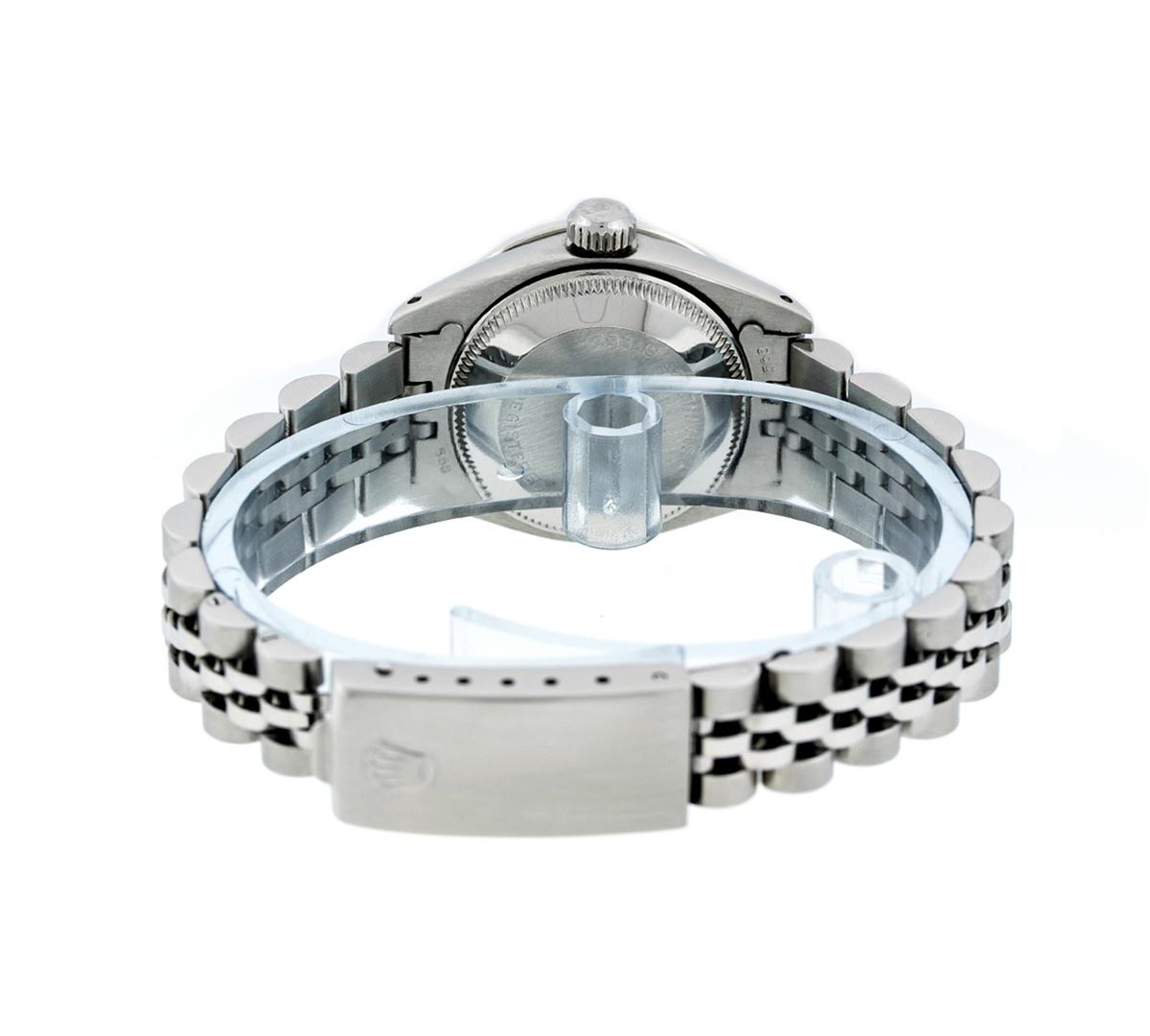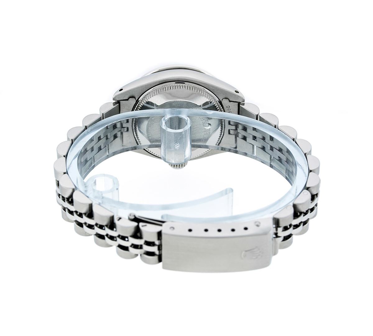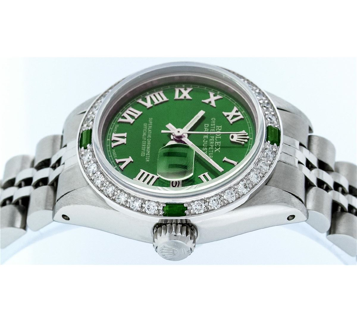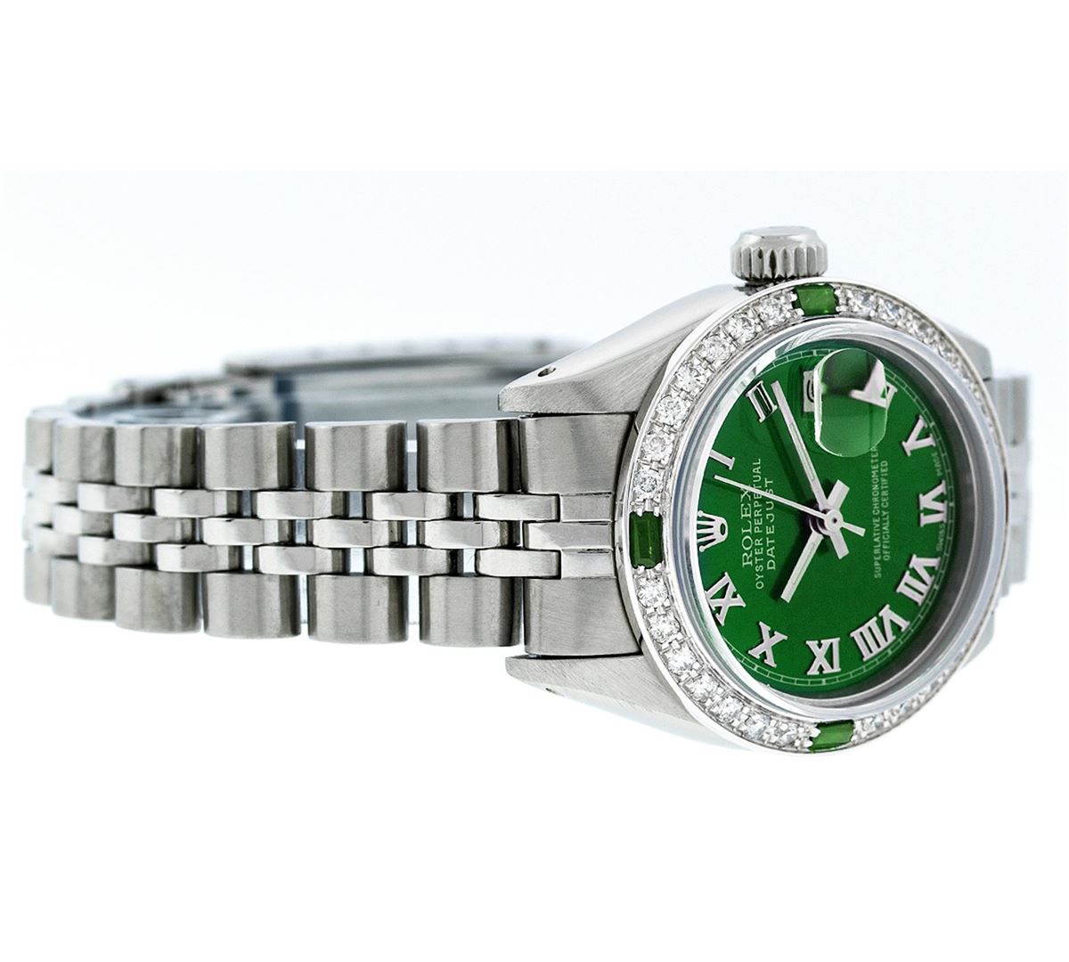 One Ladies Rolex Datejust Polished Bright with Satin Finish, Serviced & Electronically Tested, Stainless Steel Case:26mm, Stainless Steel Crown, Custom Bezel: 18K White Gold Emerald Beadset Diamond Bezel, Diamond + Gem Count: 28 Diamonds + 4 Emeralds Total Weight .70 Carat, Clarity: SI-VS, Color: G to H. Custom Crystal: Synthetic Sapphire Cyclops Lens. Movement: Automatic Winding Movement Caliber 2030. Custom Dial: Refinished Green Roman Dial With Square Track. Date Window: 3 O'Clock Position Date Display, Model: Datejust. Condition: G-6 Extra Fine. Bracelet: Stainless Steel Jubilee. Bright Polish & Satin Finish. 6.0 Inch Length, Adjustable. Standard Clasp, With Rolex Logo.