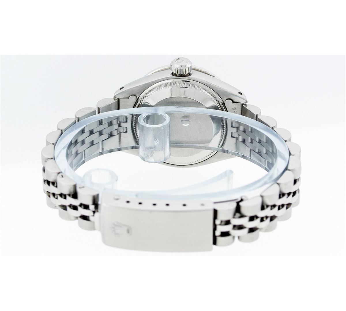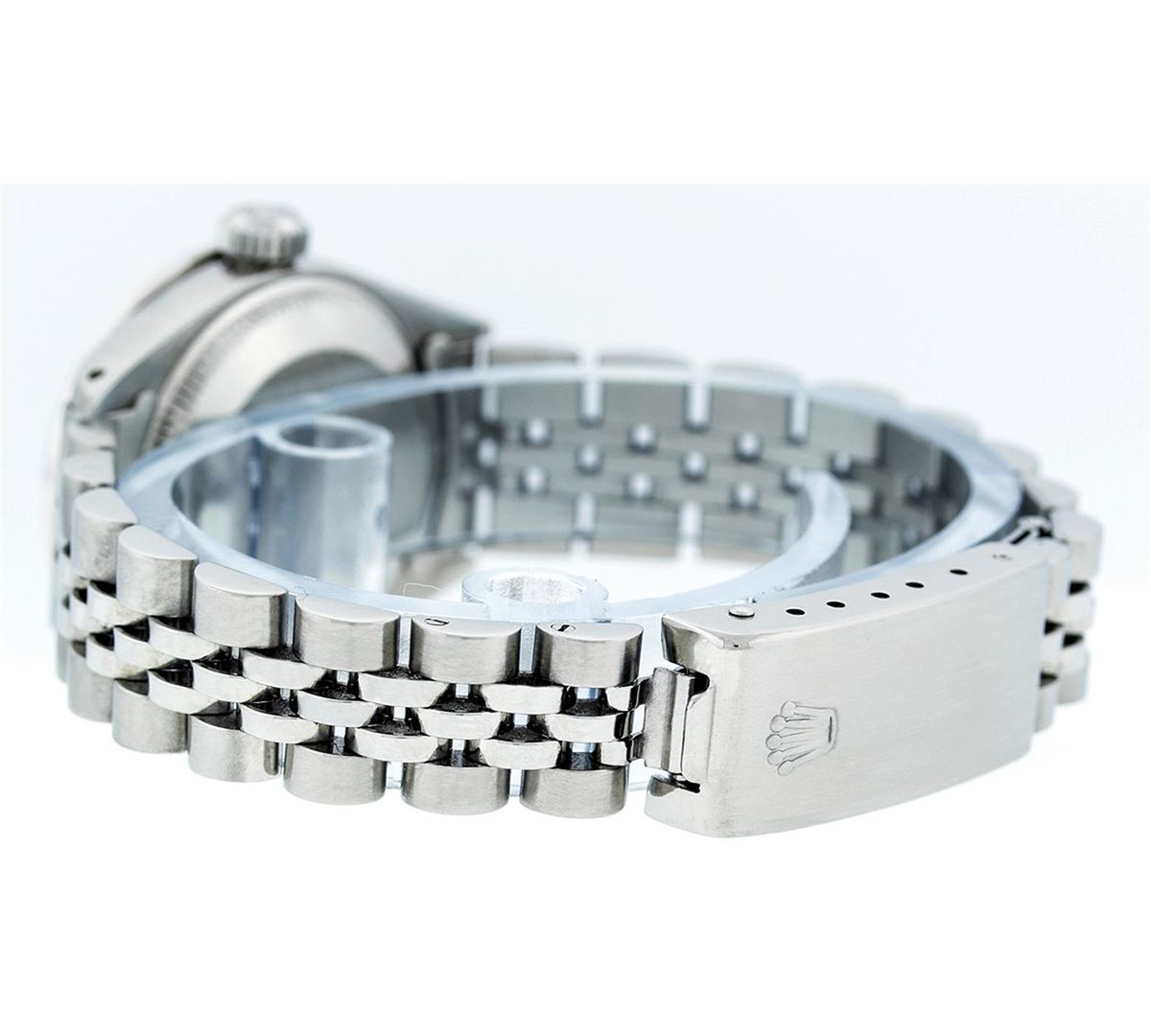Ladies Rolex Datejust Polished Bright with Satin Finish, Serviced & Electronically Tested, Stainless Steel Case:26mm, Stainless Steel Crown, Custom Bezel: 18K White Gold Emerald Beadset Diamond Bezel, Diamond + Gem Count: 28 Diamonds + 4 Emeralds. Total Weight .70 Carat, Clarity: SI-VS, Color: G to H. Custom Crystal: Synthetic Sapphire Cyclops Lens. Movement: Automatic Winding Movement Caliber 2030. Custom Dial: Refinished Blue MOP With Diamond Hour Markers. Diamond Count: 10 Diamonds, Color: G To H, Clarity: SI-VS. Date Window: 3 O'Clock Position Date Display, Model: Datejust. Condition: G-6 Extra Fine. Bracelet: Stainless Steel Jubilee. Bright Polish & Satin Finish. 6.0 Inch Length, Adjustable. Standard Clasp, With Rolex Logo.