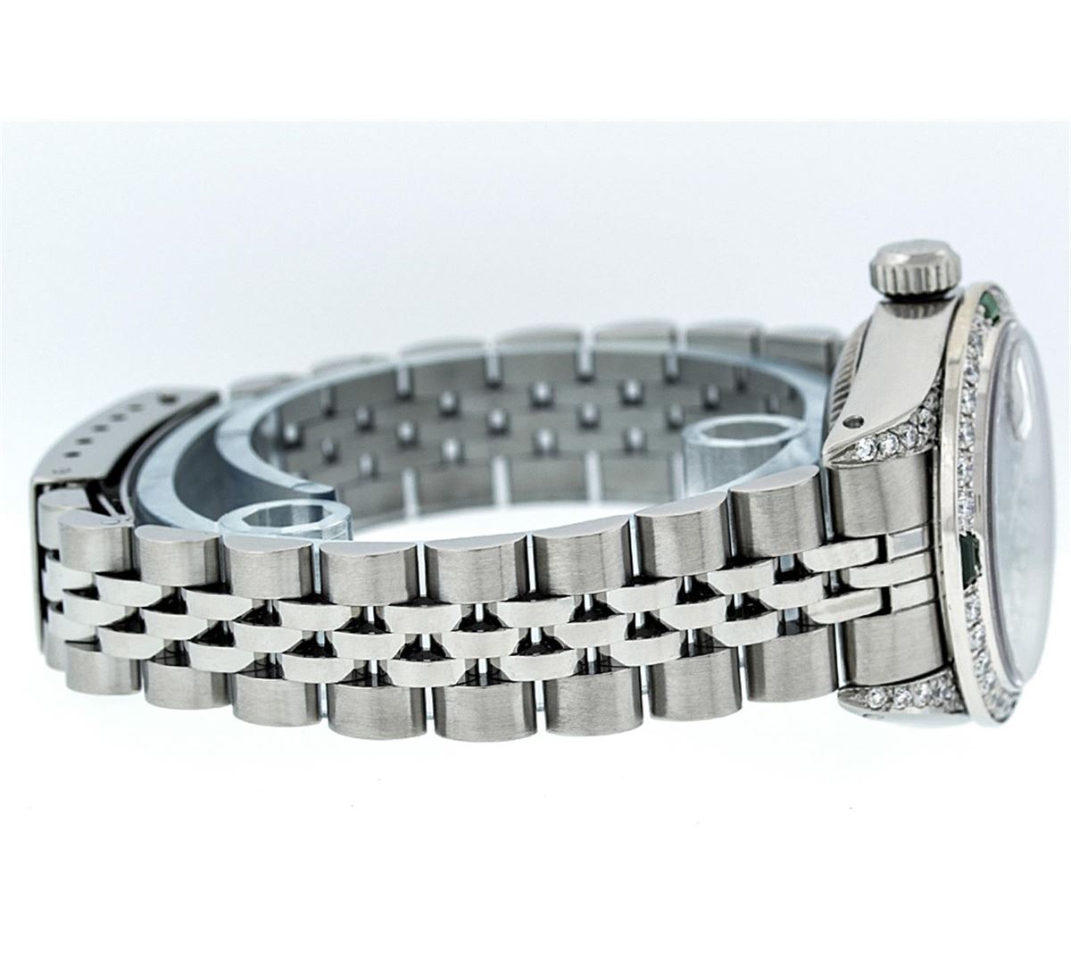 One Ladies Rolex Datejust Polished Bright with Satin Finish, Serviced & Electronically Tested, Stainless Steel Case:26mm, Stainless Steel Crown, Diamond Lugs: 16 Diamonds On Lugs, Clarity: SI-VS, Color: G to H. Custom Bezel: 18K White Gold Emerald Beadset Bezel, Diamond Count: 28 Diamonds + 4 Emeralds, Total Weight 1.00 Carat, Clarity: SI-VS, Color: G to H. Custom Crystal: Synthetic Sapphire Cyclops Lens. Movement: Automatic Winding Movement Caliber 2030. Custom Dial: Refinished Green With String Diamond Dial, 43 Diamonds in Dial G To H In Color, Clarity: VVS. Date Window: 3 O'Clock Position Date Display, Model: Datejust Condition: G-6 Extra Fine. Bracelet: Stainless Steel Jubilee. Bright Polish & Satin Finish. 6.0 Inch Length, Adjustable. Standard Clasp, With Rolex Logo.
