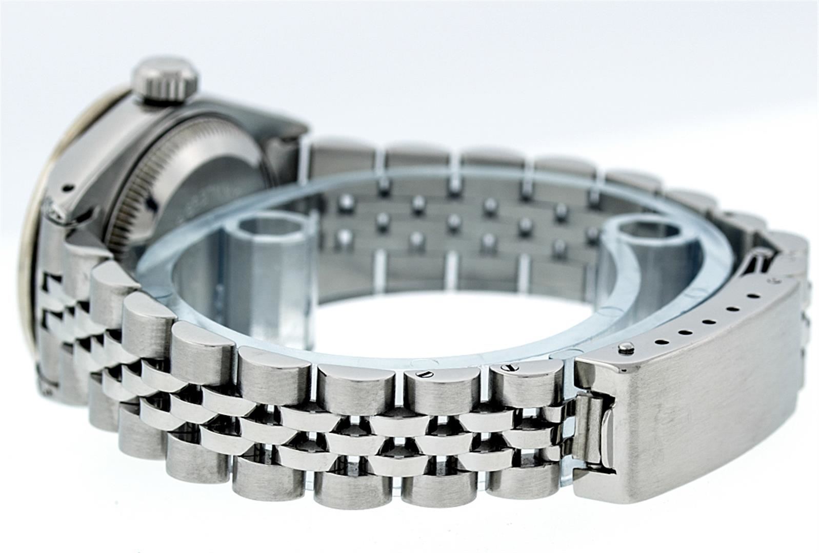 One Ladies Rolex Datejust Polished Bright with Satin Finish, Serviced & Electronically Tested, Stainless Steel Case:26mm, Stainless Steel Crown, Diamond Lugs: 16 Diamonds On Lugs, Clarity: SI-VS, Color: G to H. Custom Bezel: 18K White Gold Emerald Beadset Bezel, Diamond Count: 28 Diamonds + 4 Emeralds, Total Weight 1.00 Carat, Clarity: SI-VS, Color: G to H. Custom Crystal: Synthetic Sapphire Cyclops Lens. Movement: Automatic Winding Movement Caliber 2030. Custom Dial: Refinished Green With String Diamond Dial, 43 Diamonds in Dial G To H In Color, Clarity: VVS. Date Window: 3 O'Clock Position Date Display, Model: Datejust Condition: G-6 Extra Fine. Bracelet: Stainless Steel Jubilee. Bright Polish & Satin Finish. 6.0 Inch Length, Adjustable. Standard Clasp, With Rolex Logo.